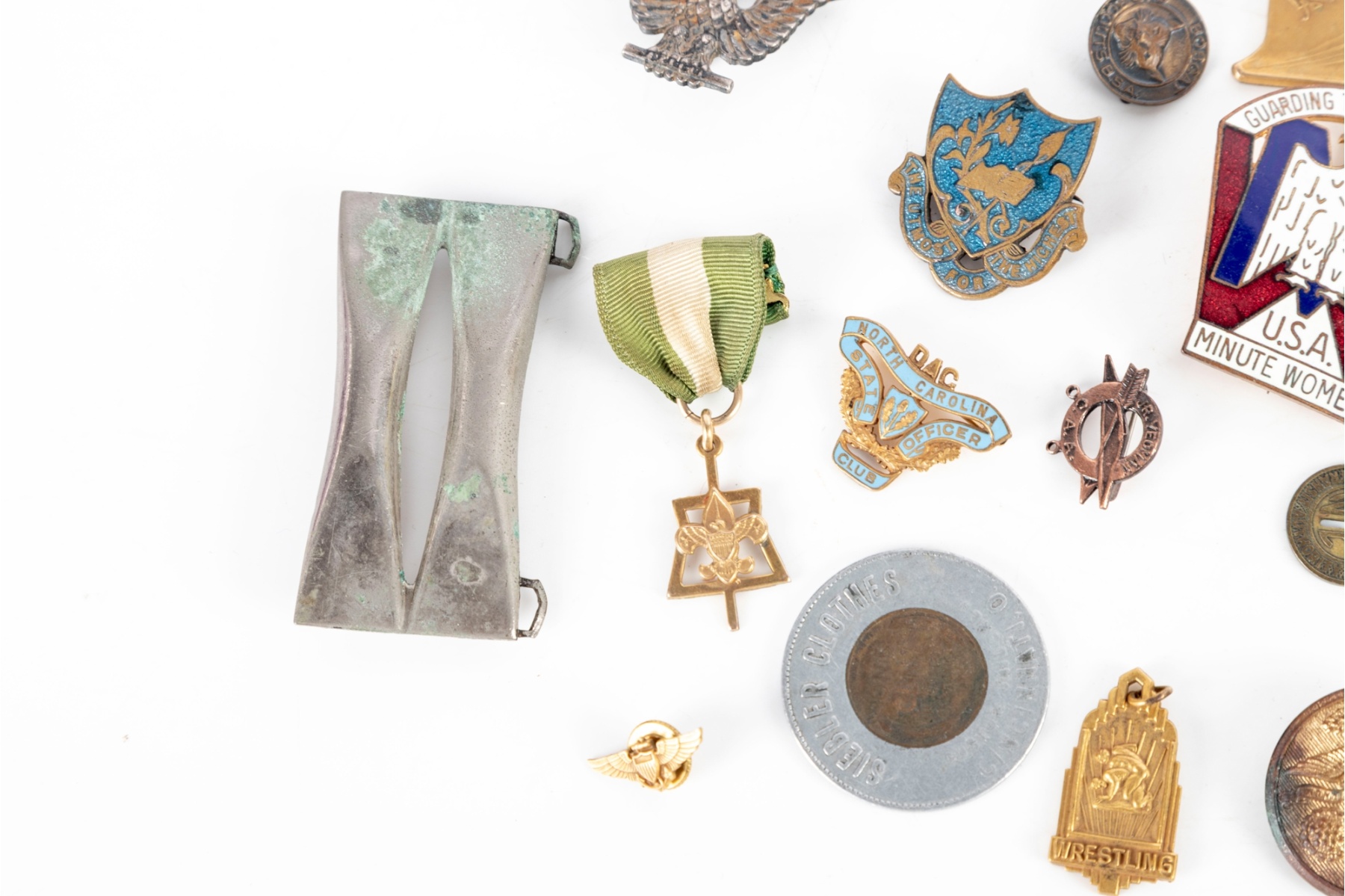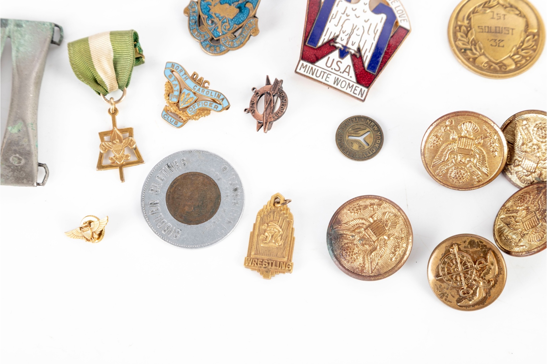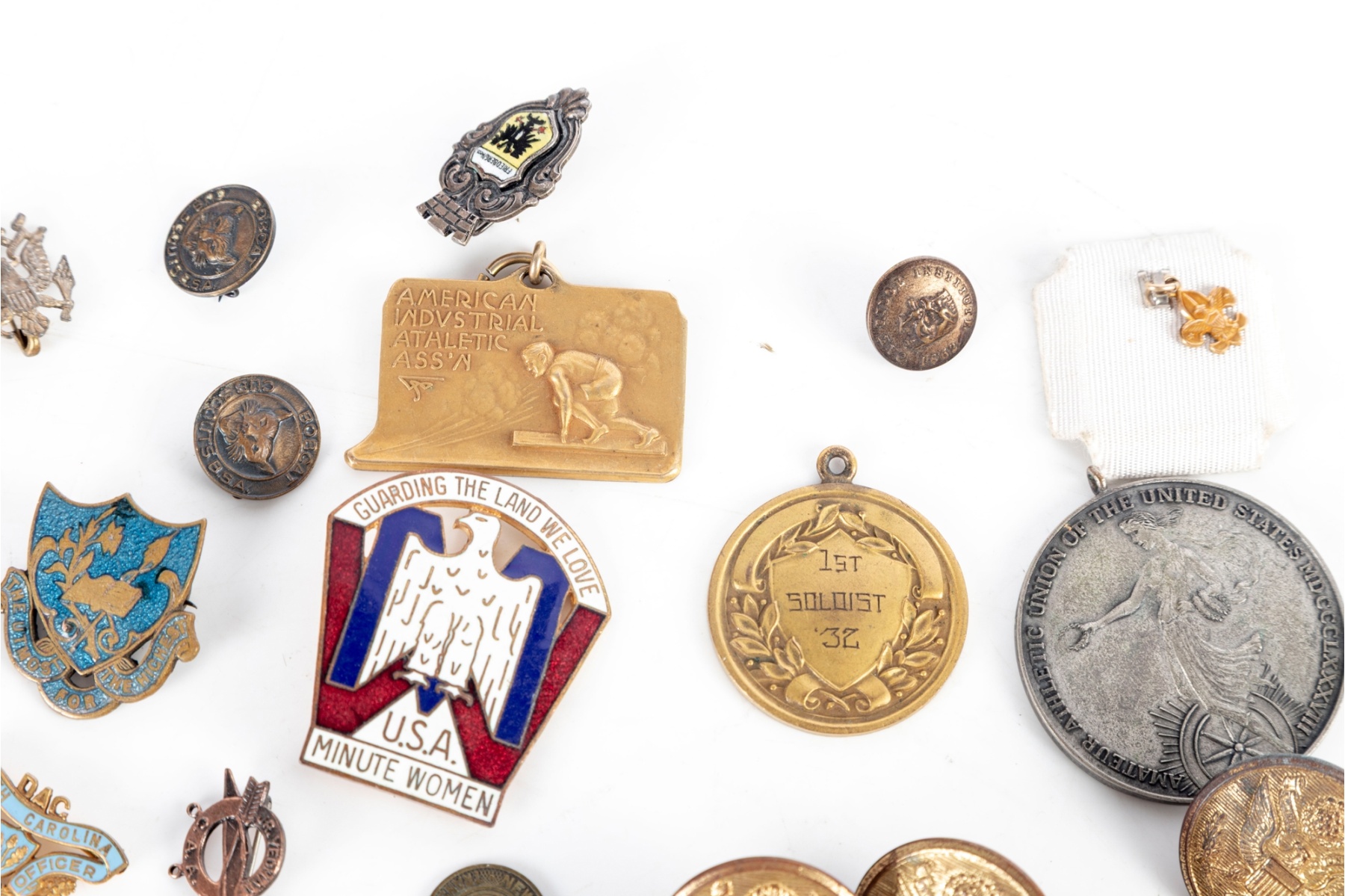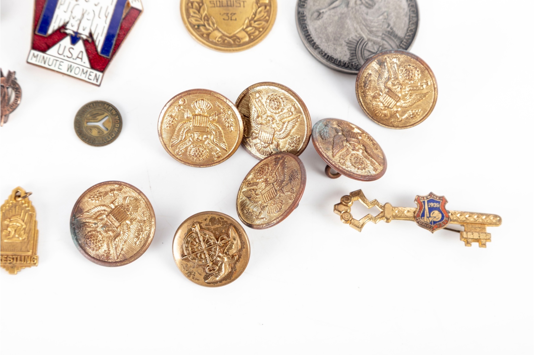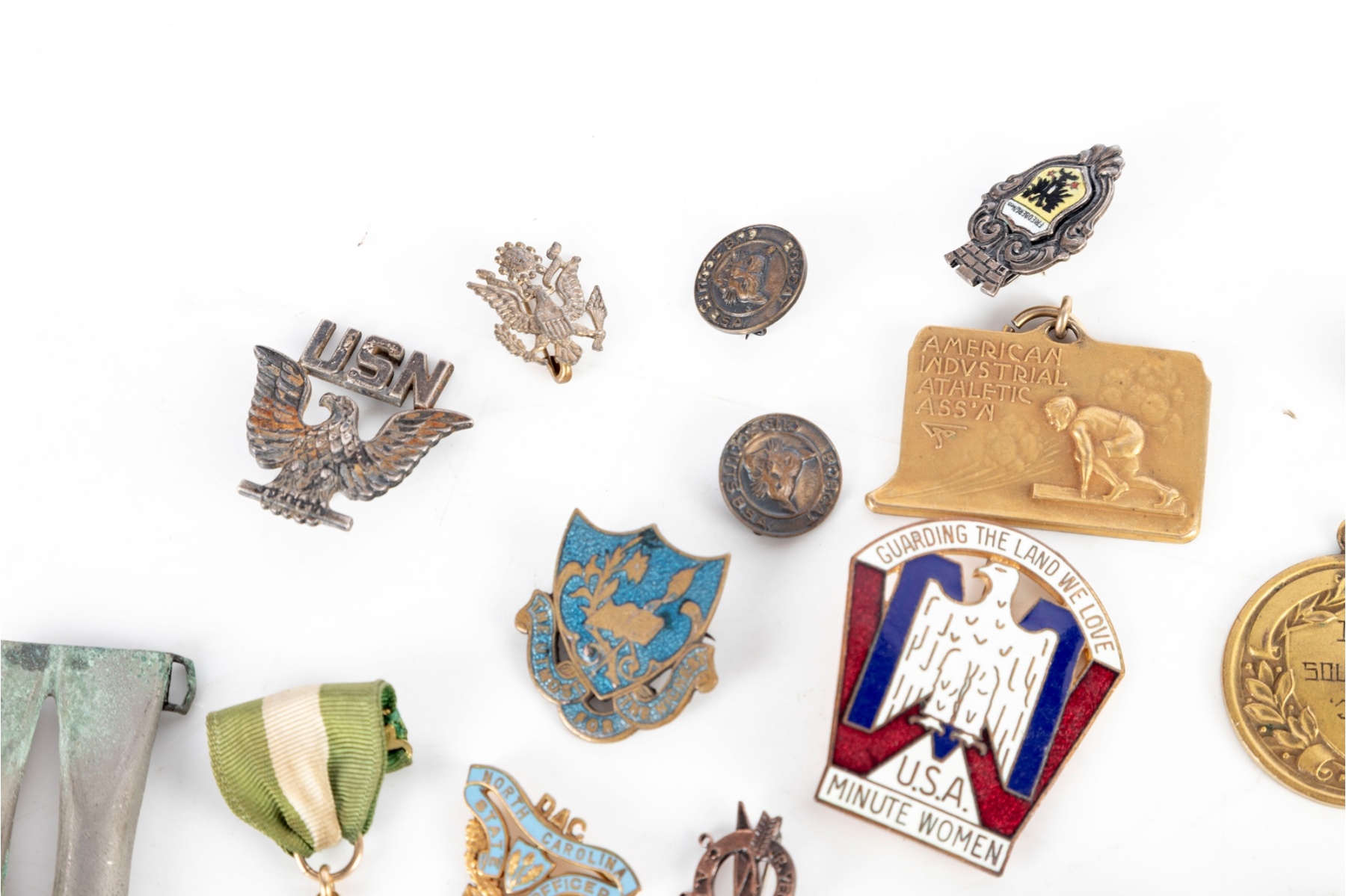Grouping includes assorted U.S. military-related pieces such as gilt eagle buttons, USN pins, unit or service insignia, and various commemorative or award medals. Also present are fraternal and organizational pins, sports-related medals, patriotic emblems, and miscellaneous tokens.