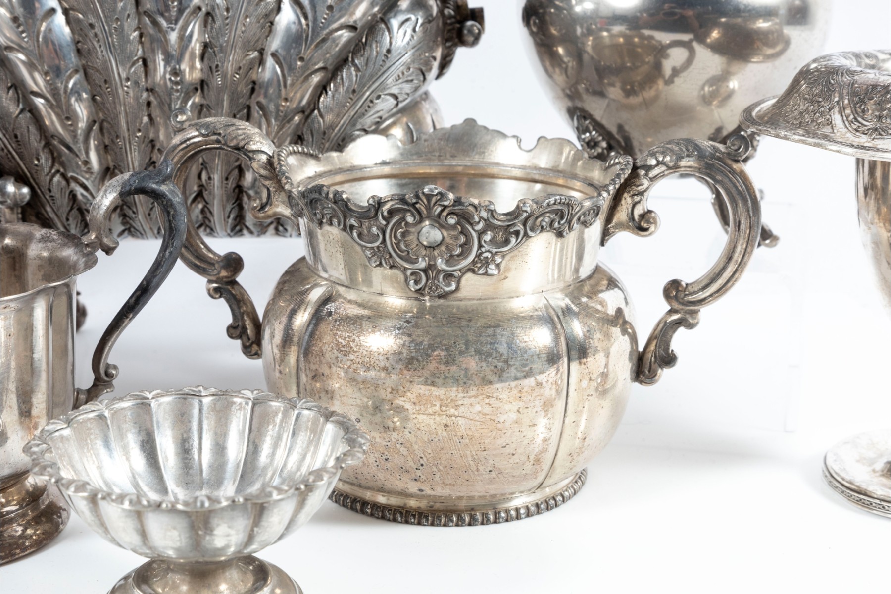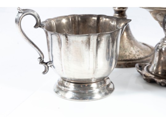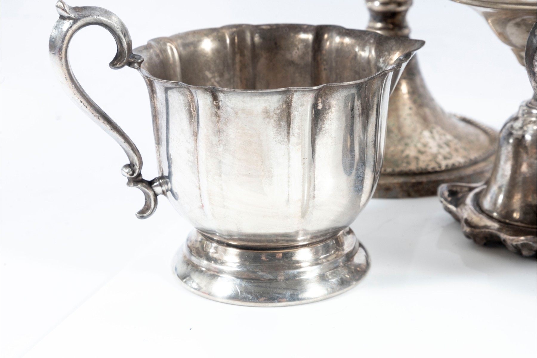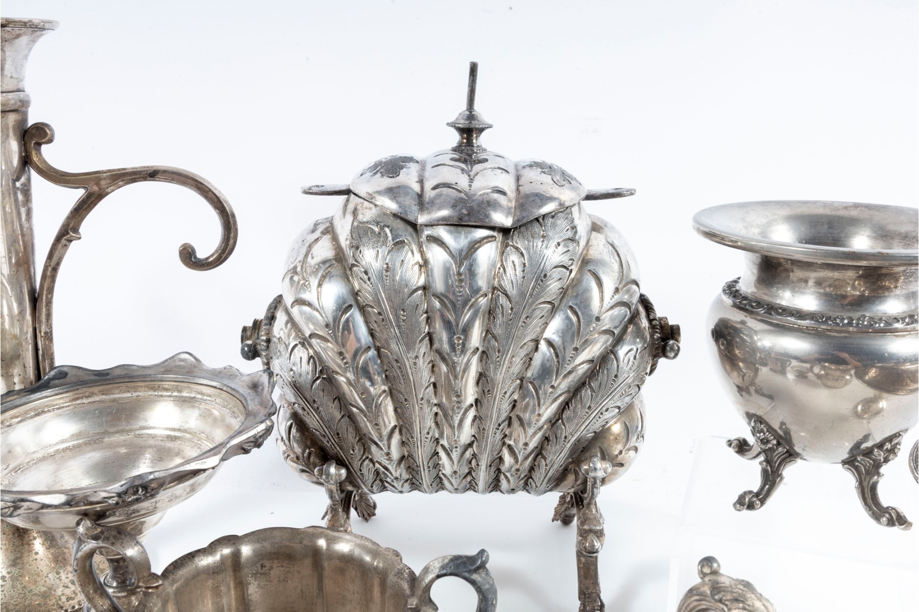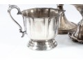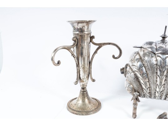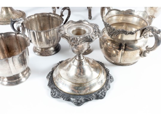Varied vintage silver-plated dishes and trinkets ranging from a fantastically engraved biscuit warmer to various cups and candlestick holders. Nine items in total.