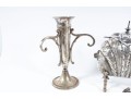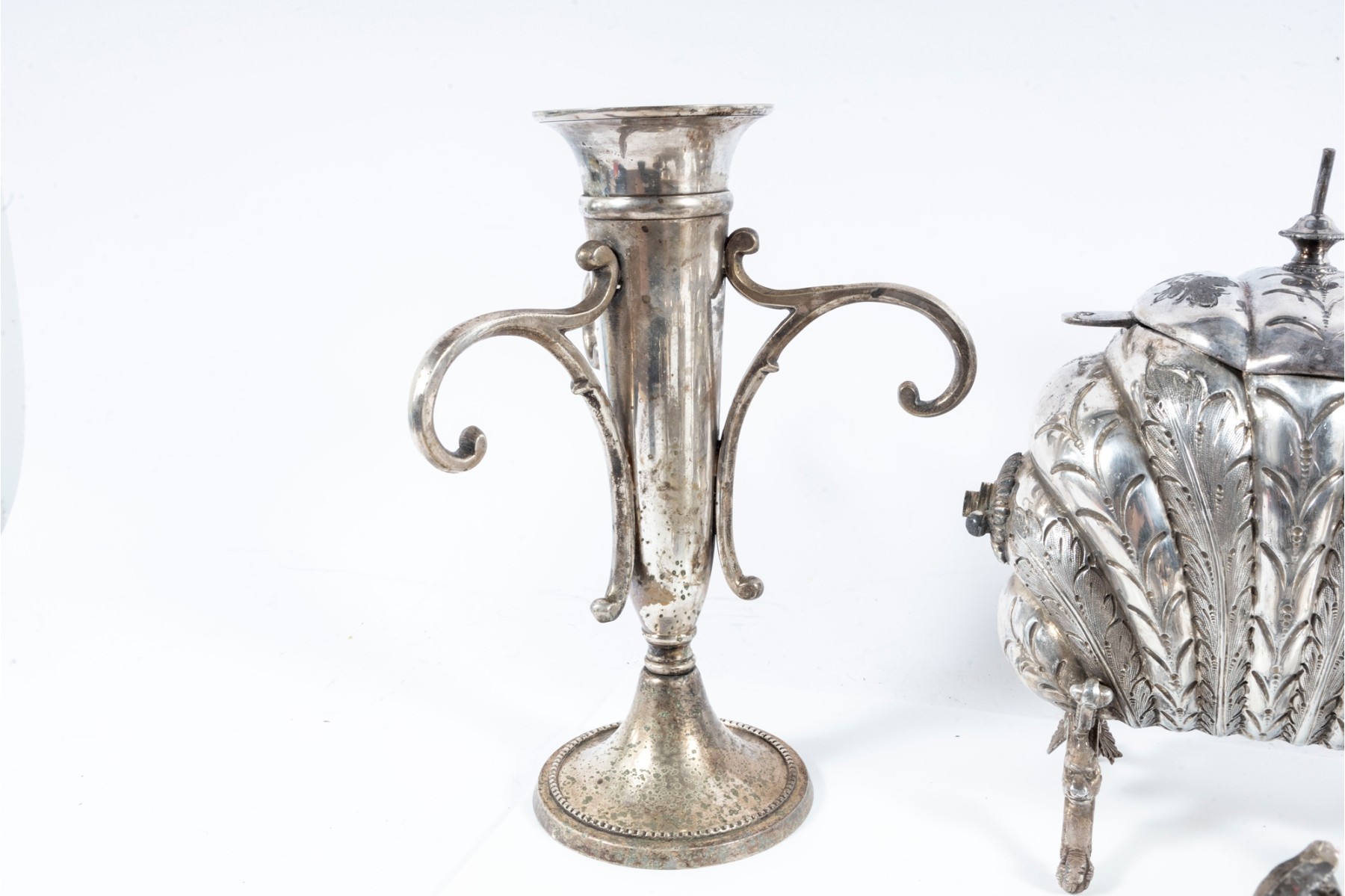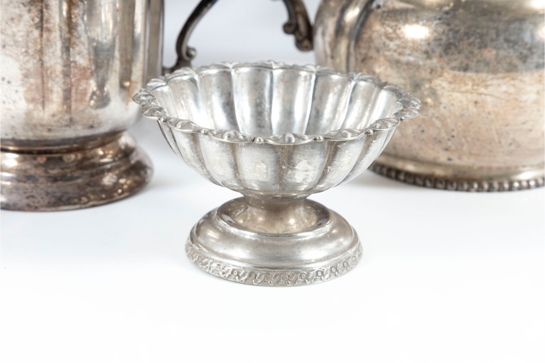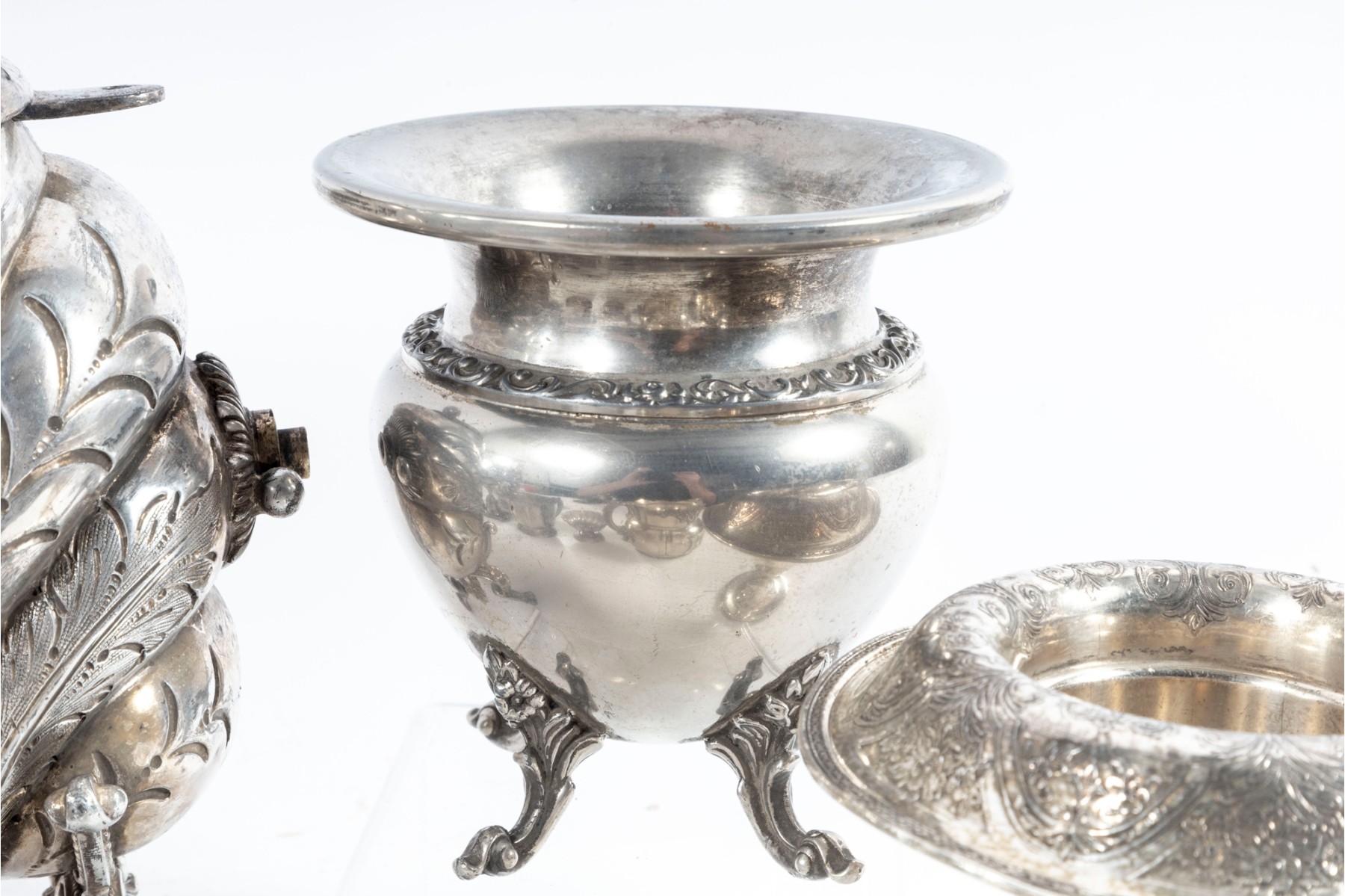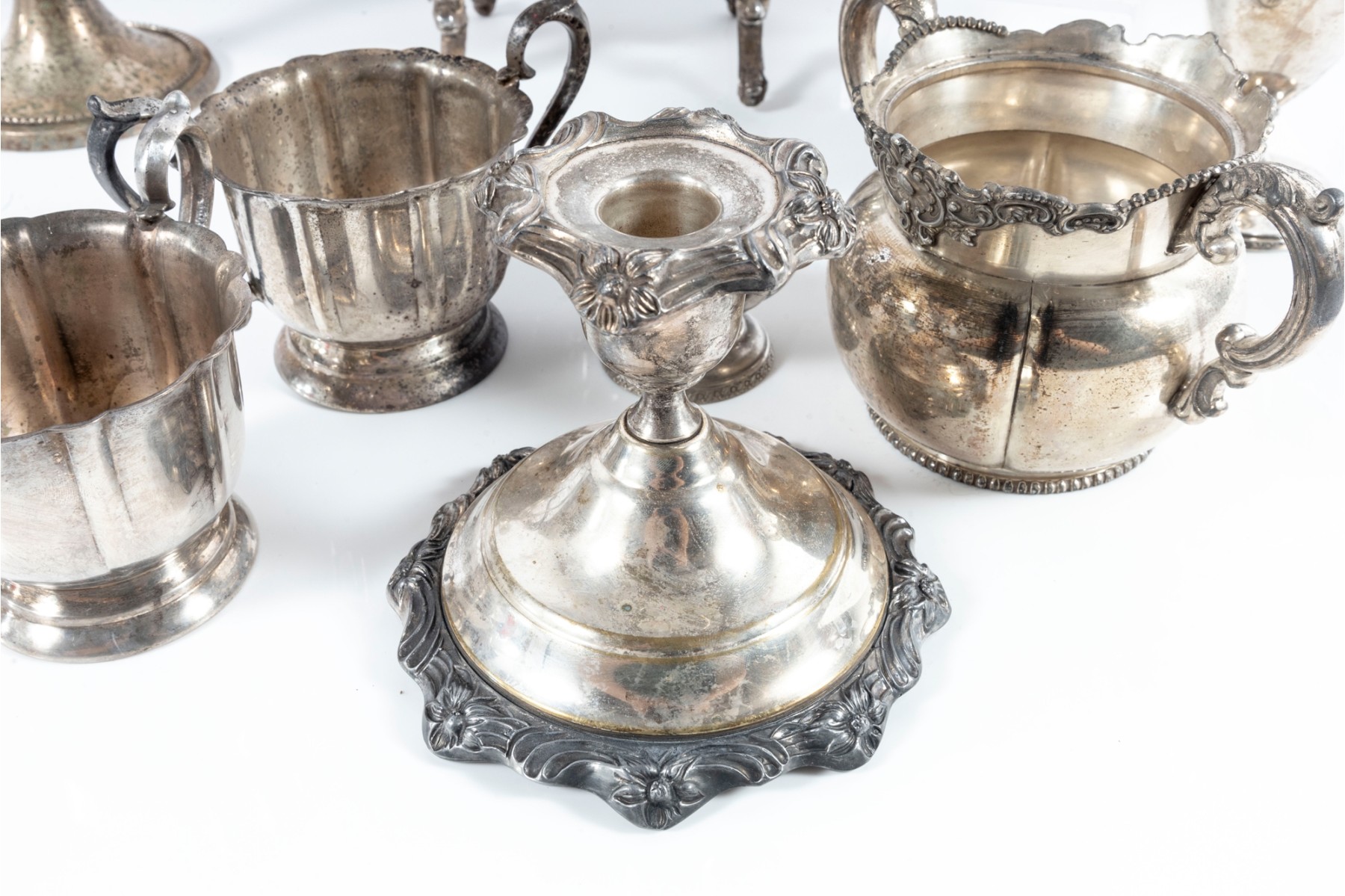 Varied vintage silver-plated dishes and trinkets ranging from a fantastically engraved biscuit warmer to various cups and candlestick holders. Nine items in total.
