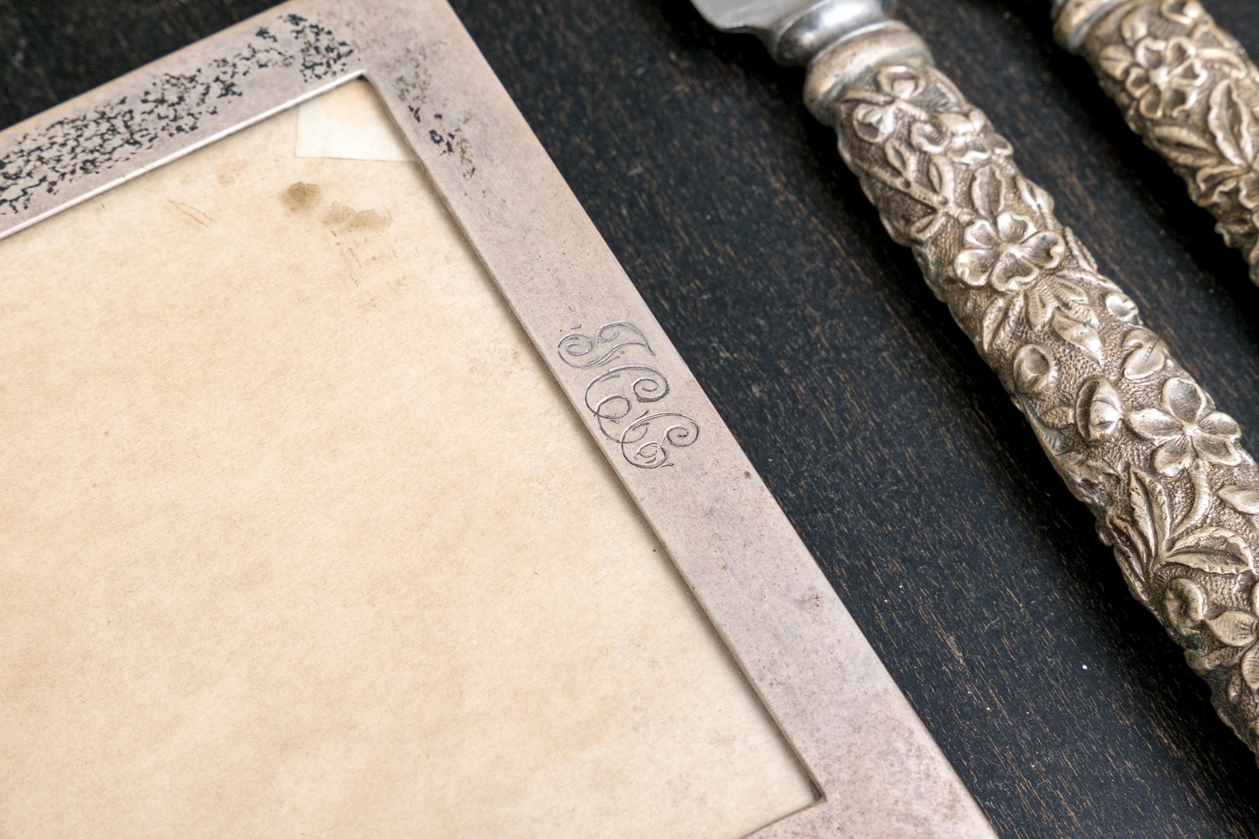 - One Monogramed sterling silver picture frame- 1.13 OZT, 5 1/2" H x 4 1/2" W