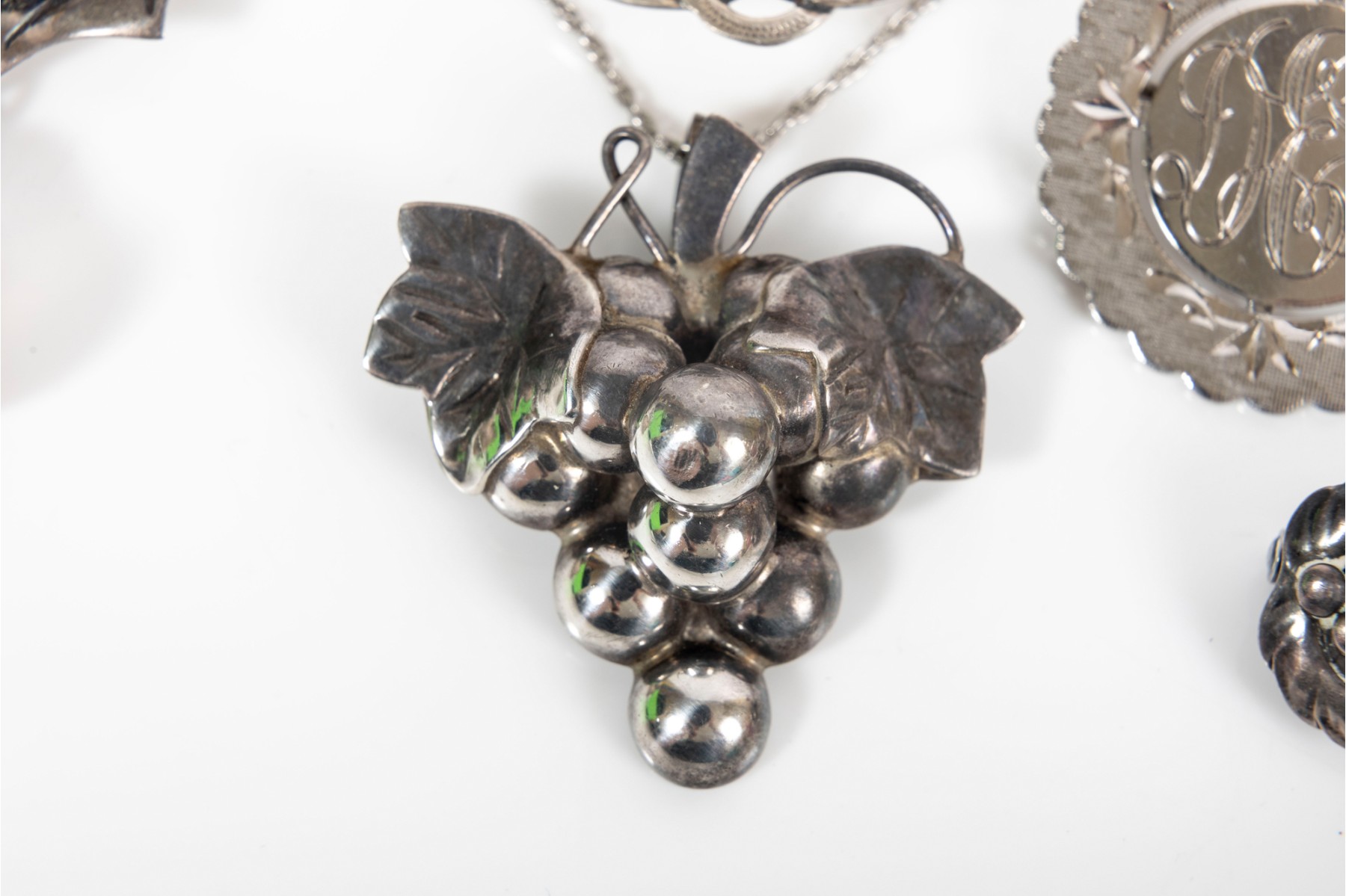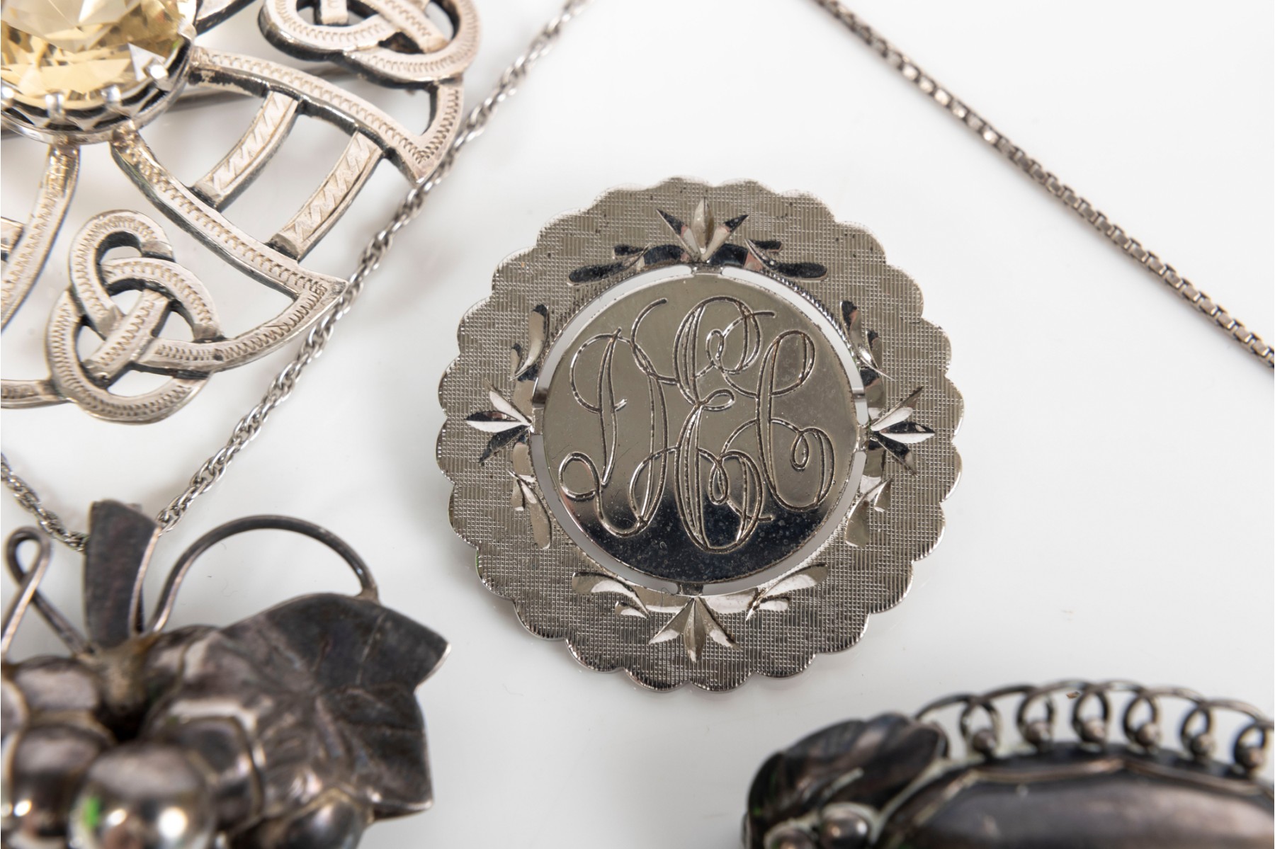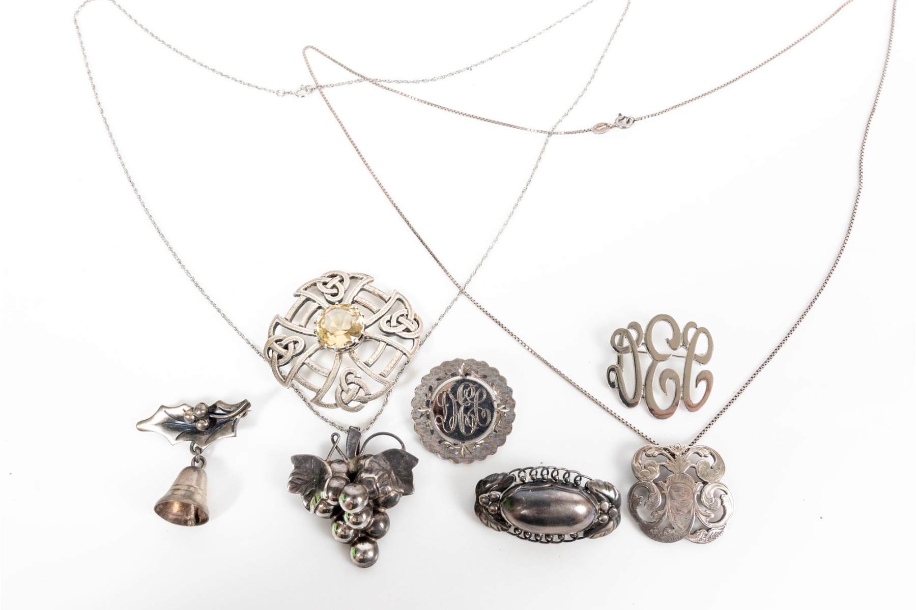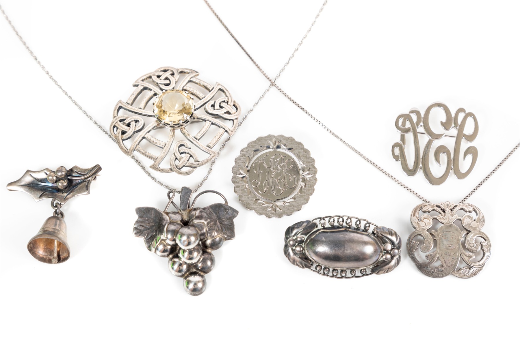 A small collection of seven small sterling silver pin brooches, two of which feature chain necklaces. Contents do not exceed 2" in diameter.