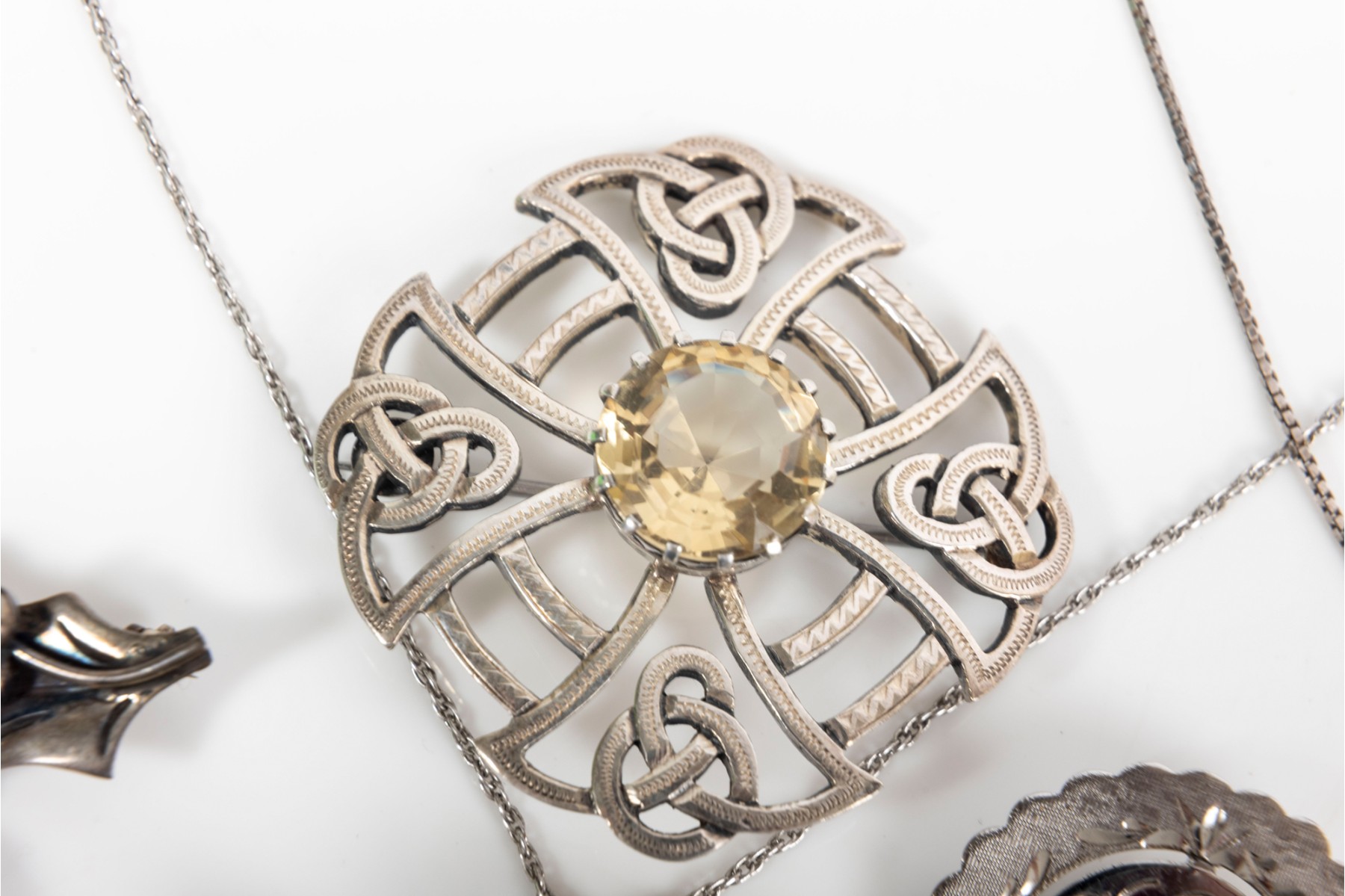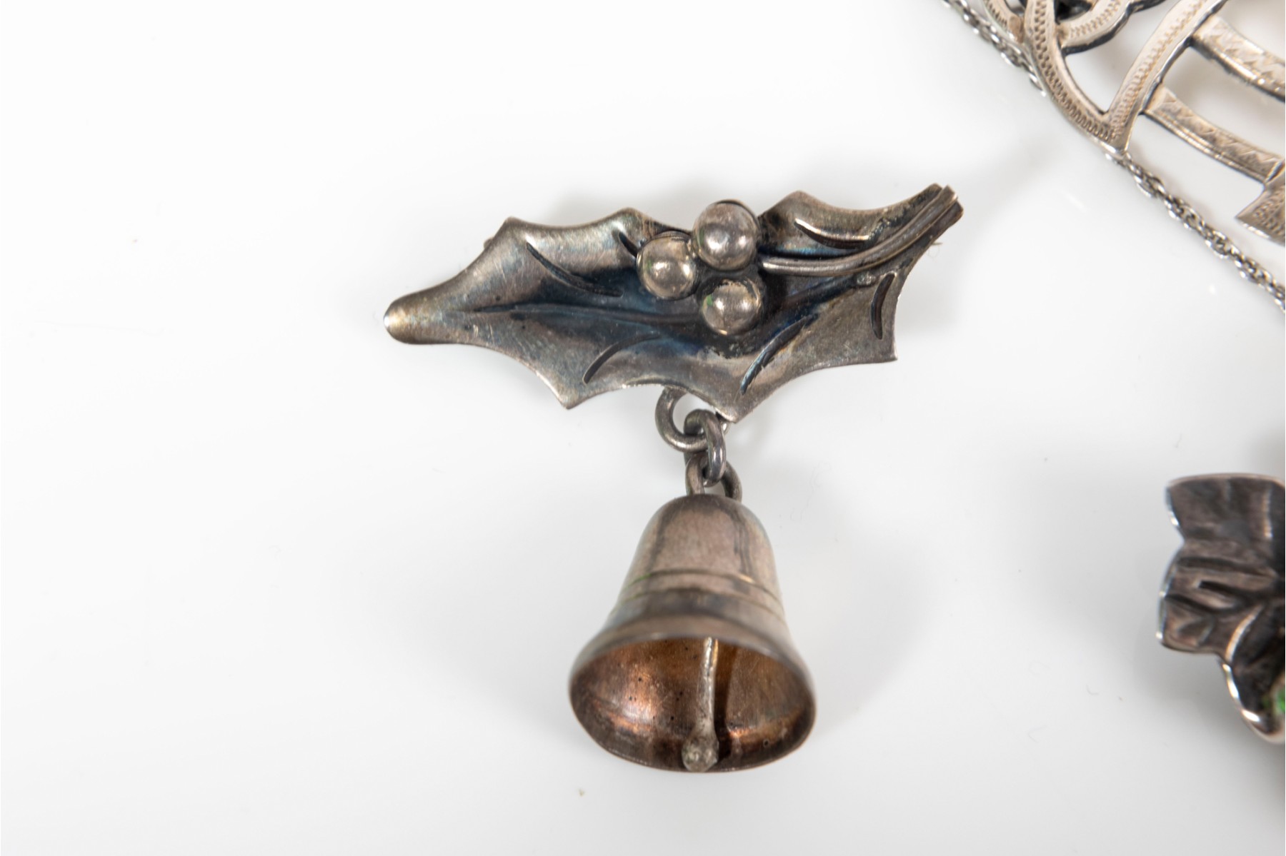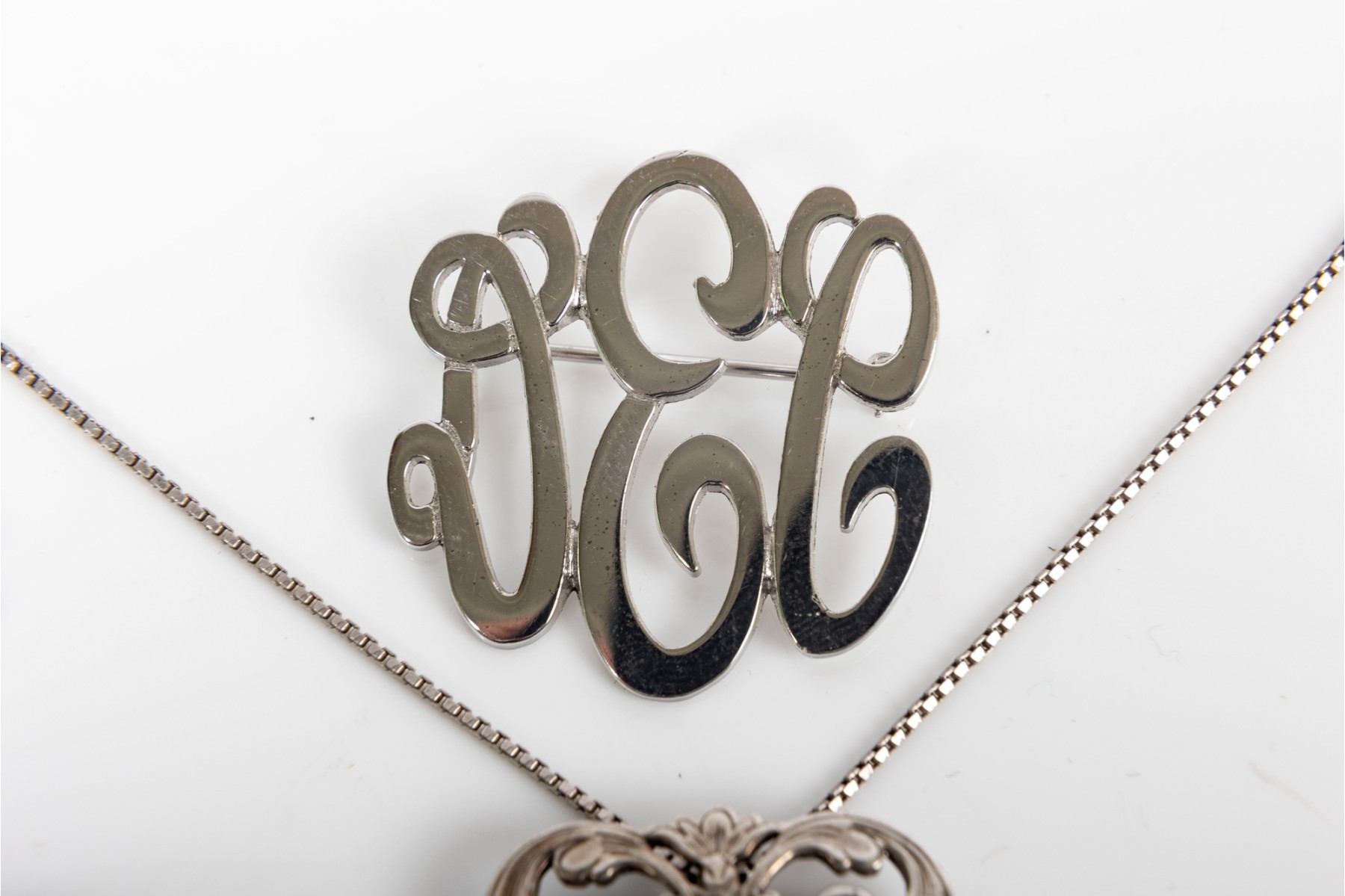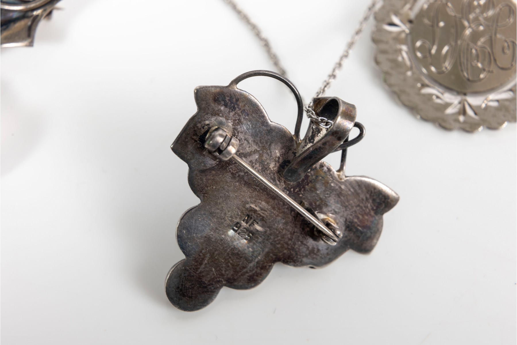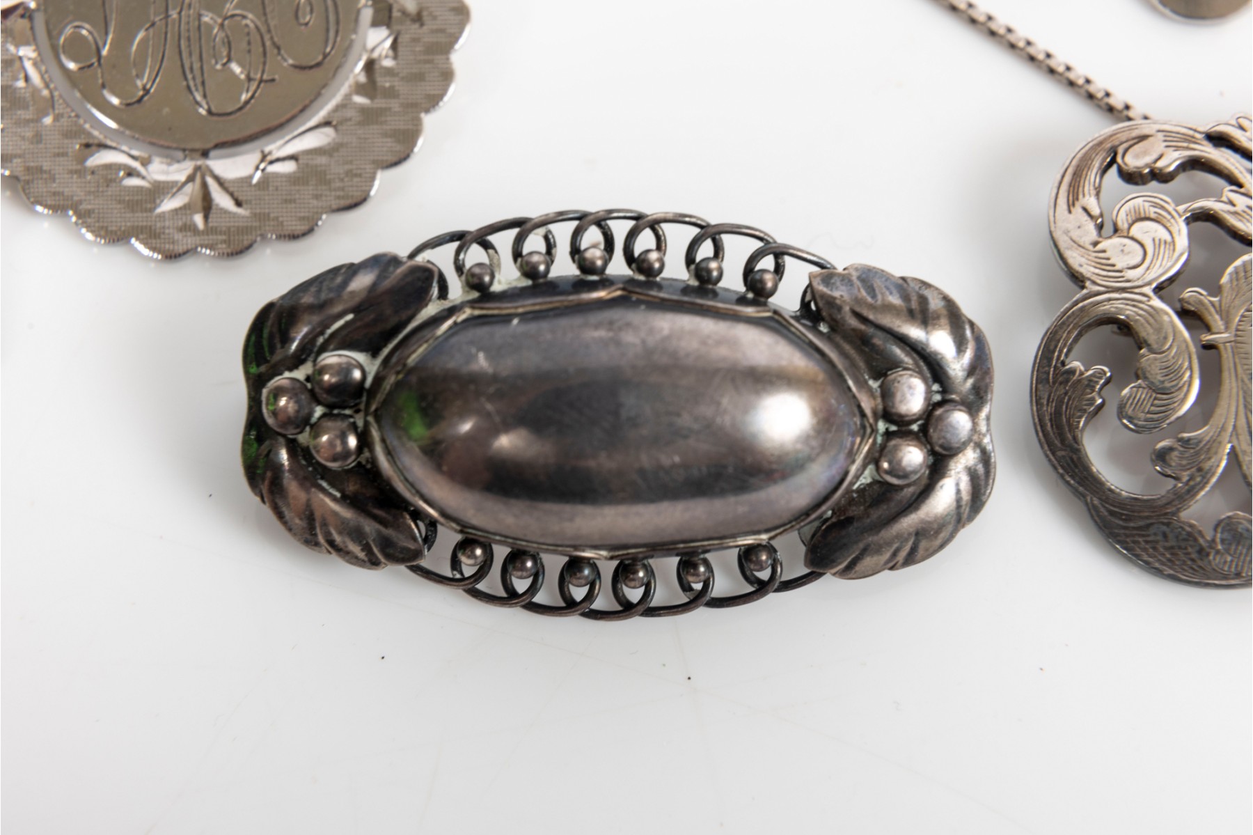A small collection of seven small sterling silver pin brooches, two of which feature chain necklaces. Contents do not exceed 2" in diameter.