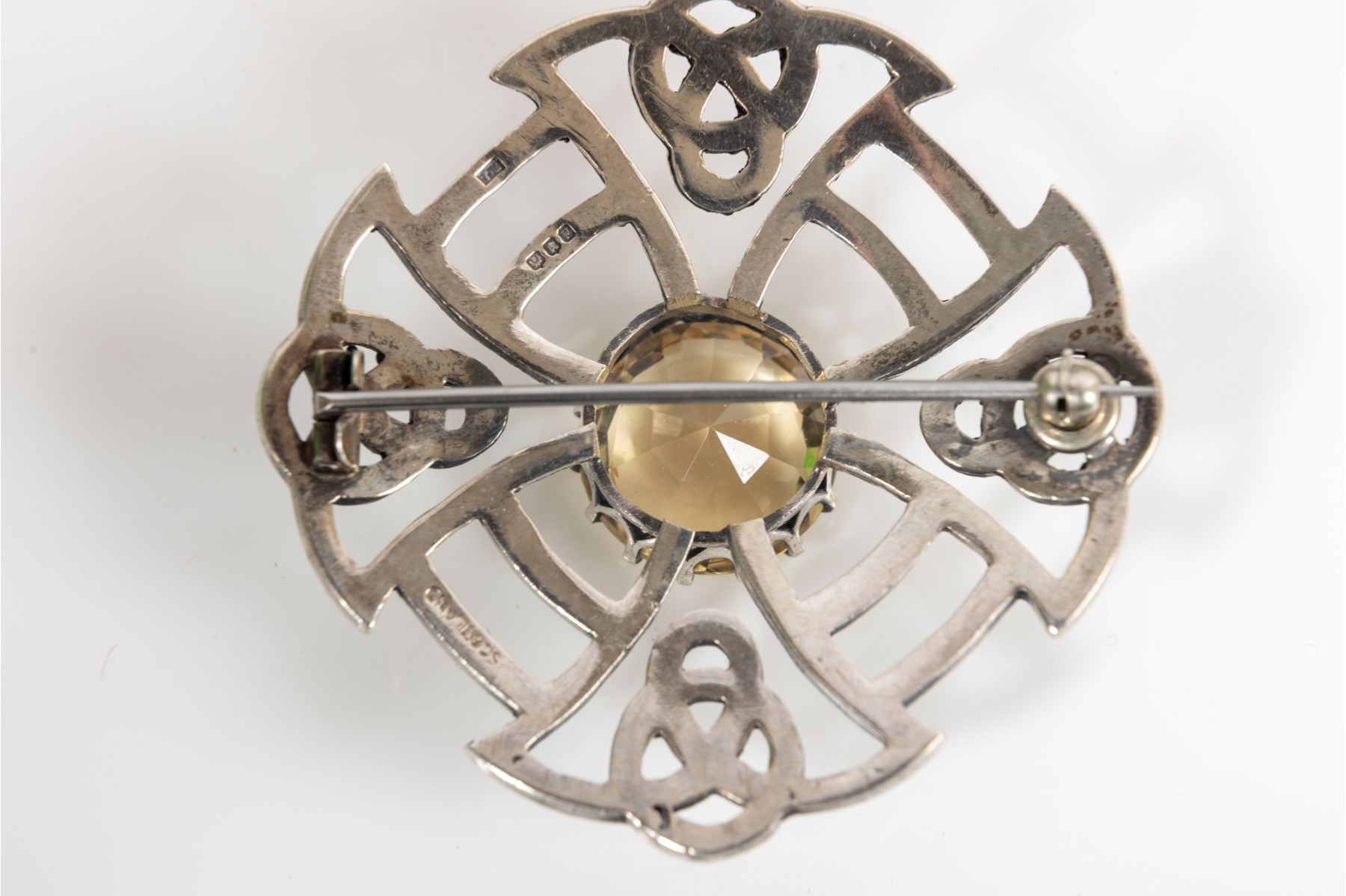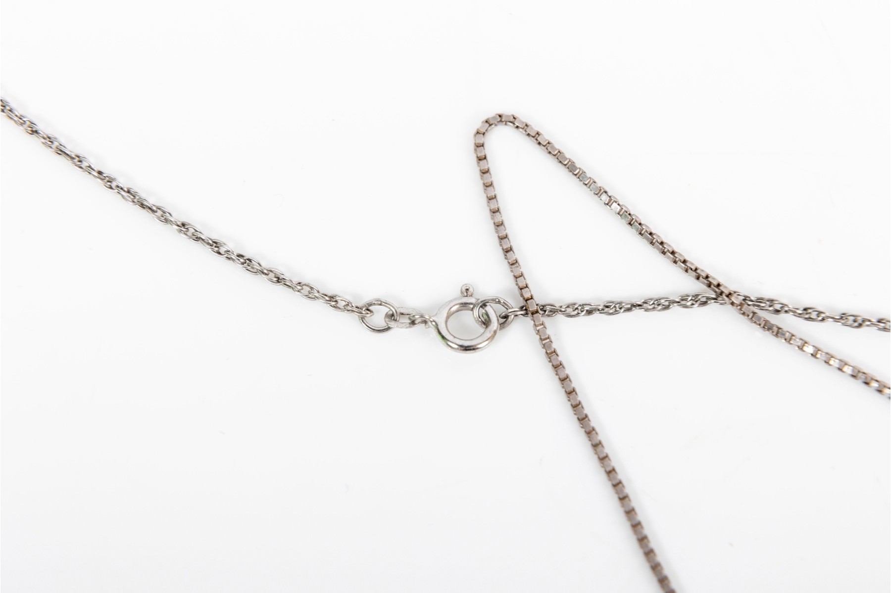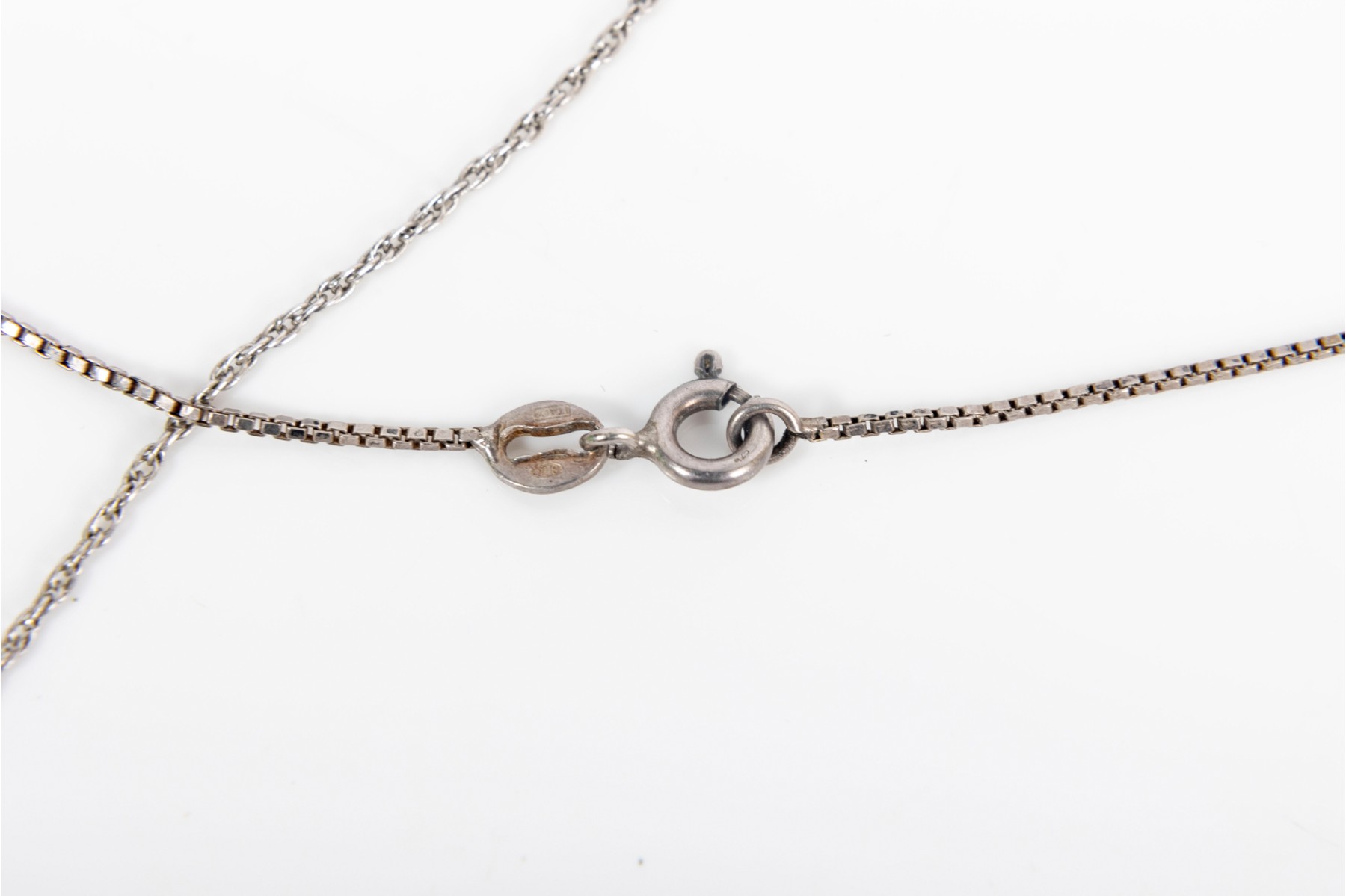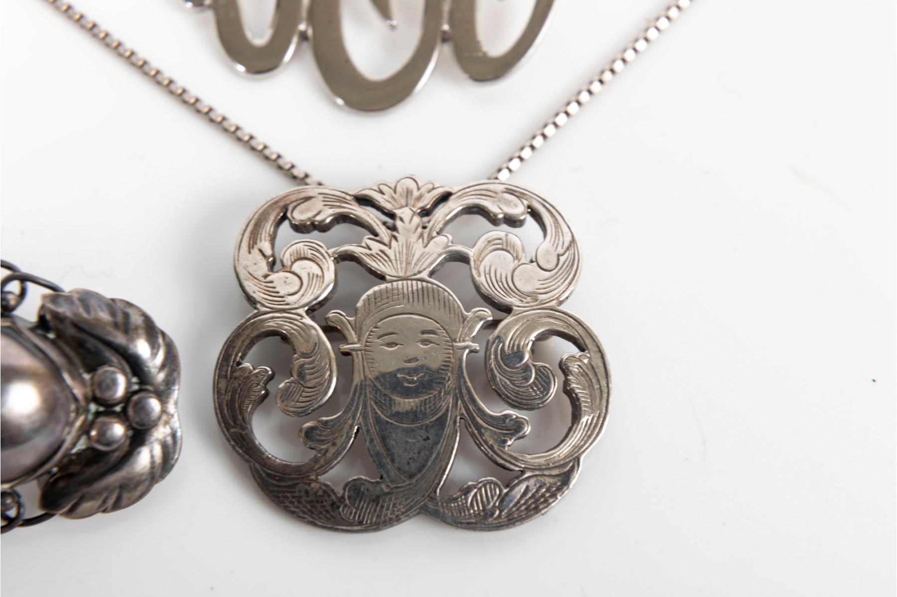 A small collection of seven small sterling silver pin brooches, two of which feature chain necklaces. Contents do not exceed 2" in diameter.