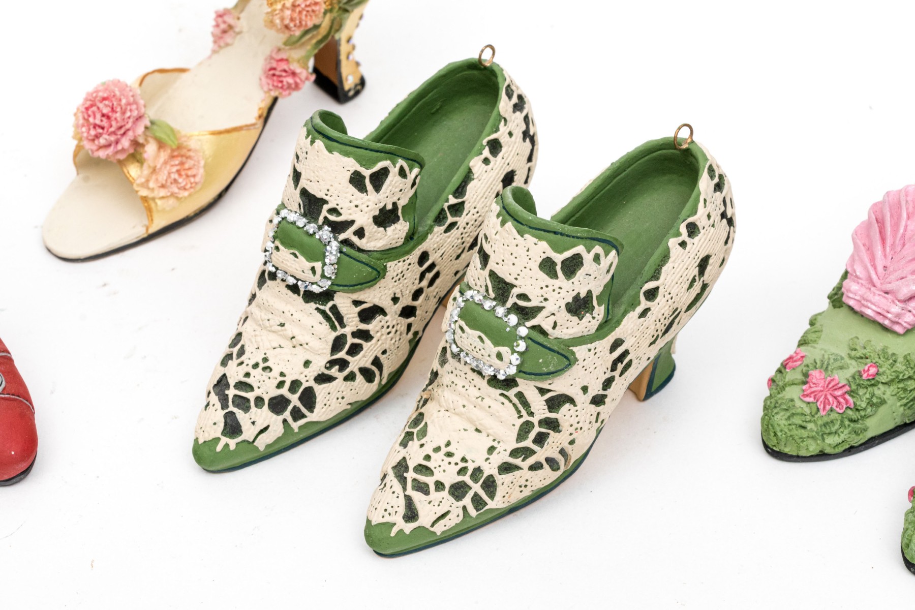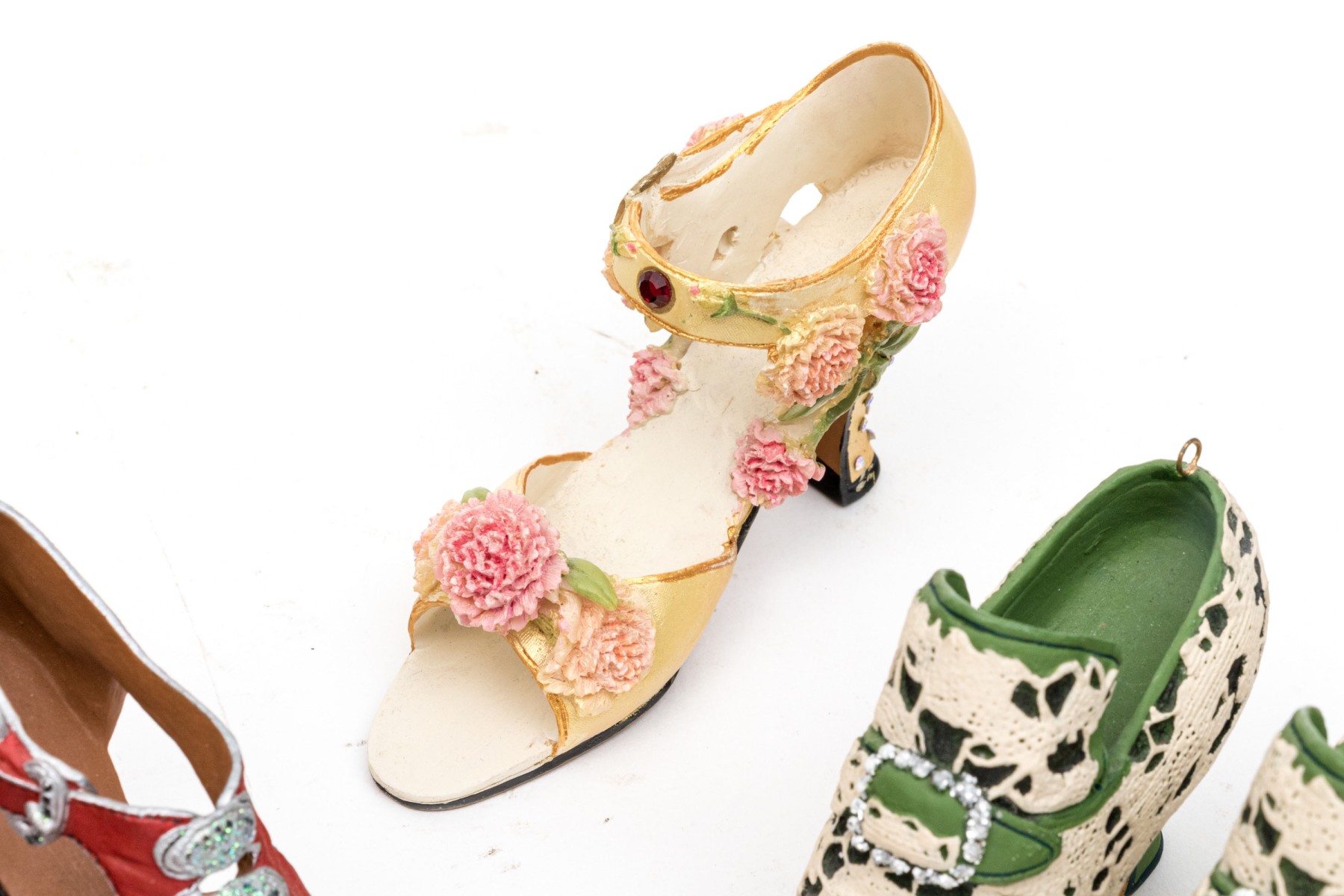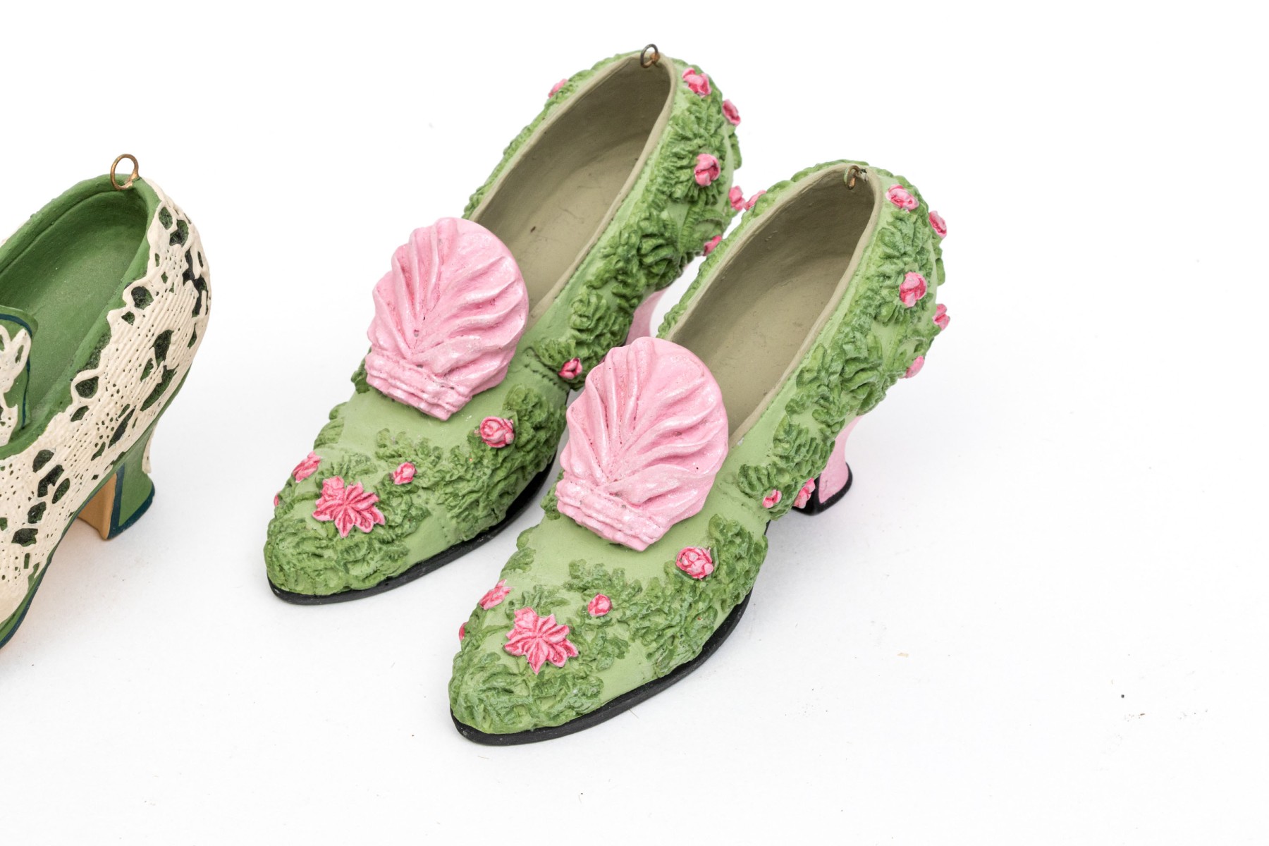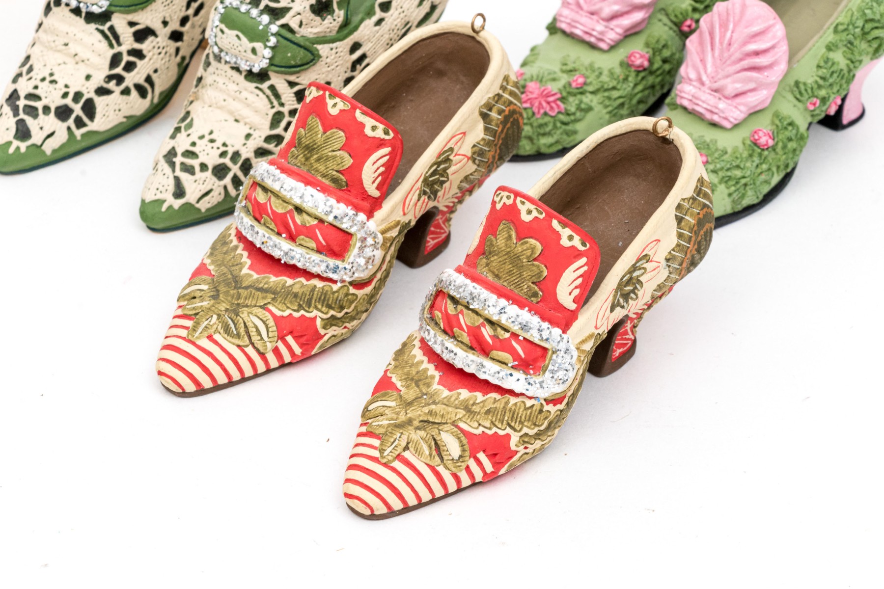 Six pairs of painted colored ceramic fancy dress shoes with elaborate decorations. Two are marked Roger Vivier Paris. All with tiny hooks for suspension at the back.