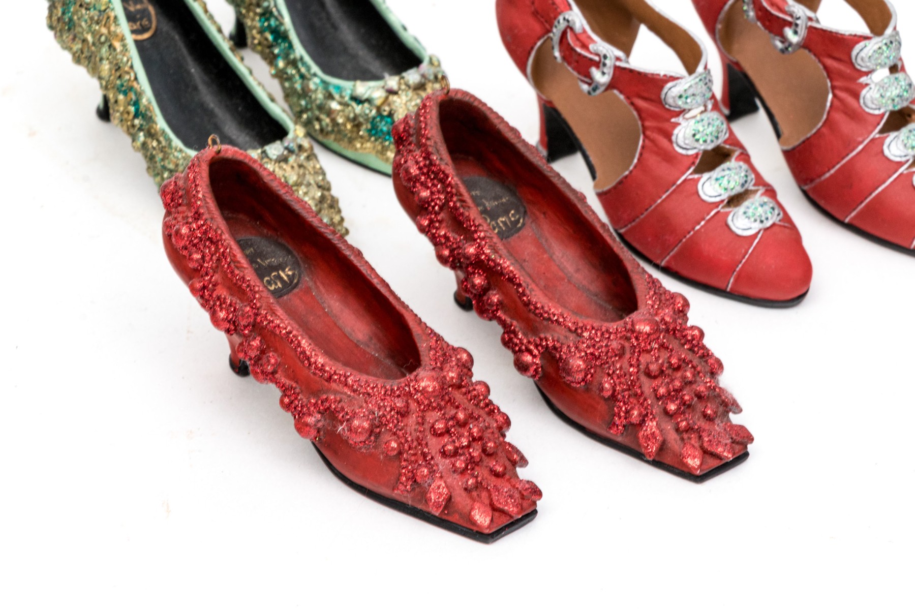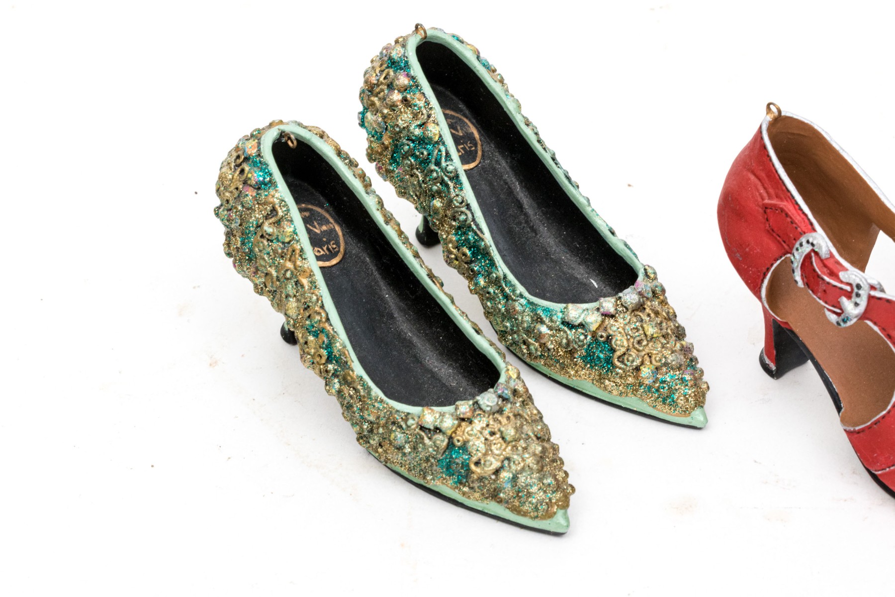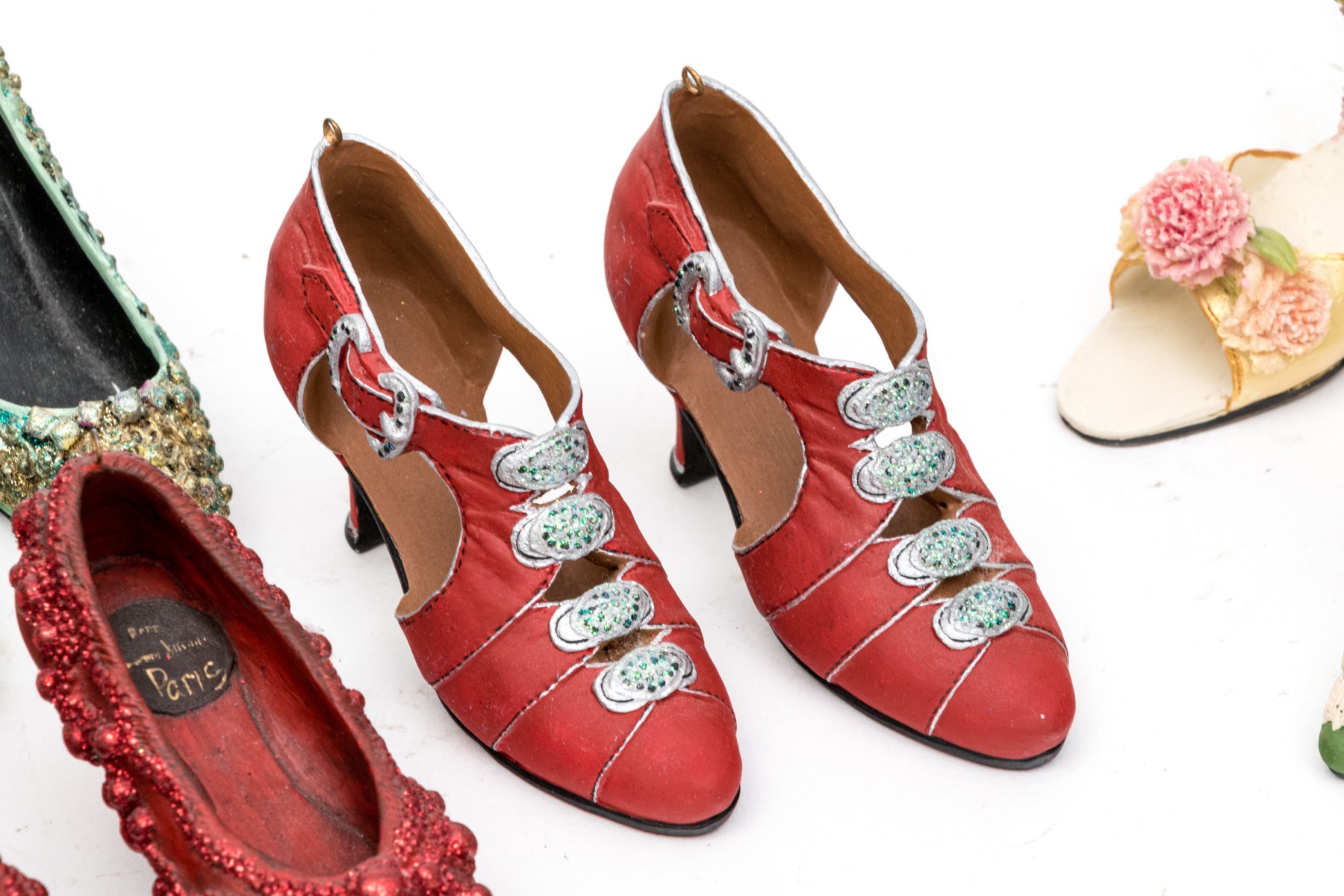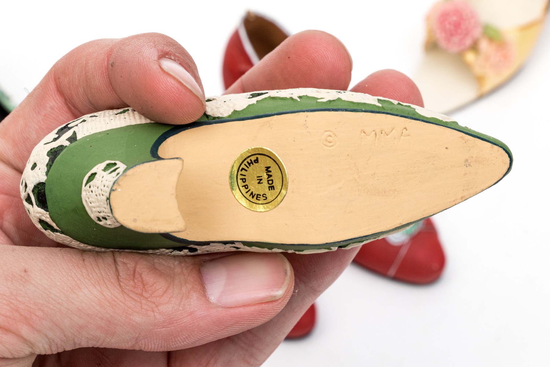 Six pairs of painted colored ceramic fancy dress shoes with elaborate decorations. Two are marked Roger Vivier Paris. All with tiny hooks for suspension at the back.