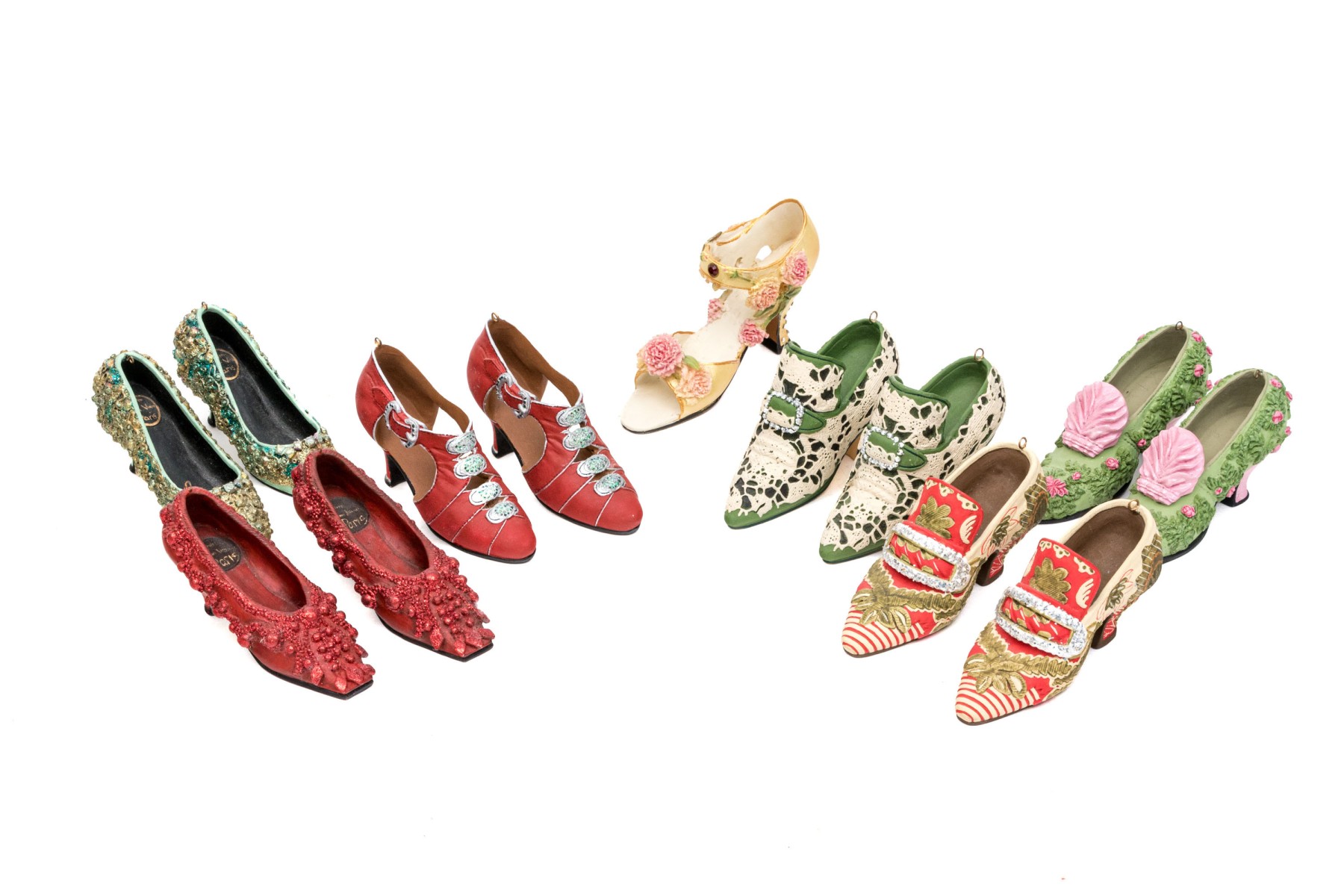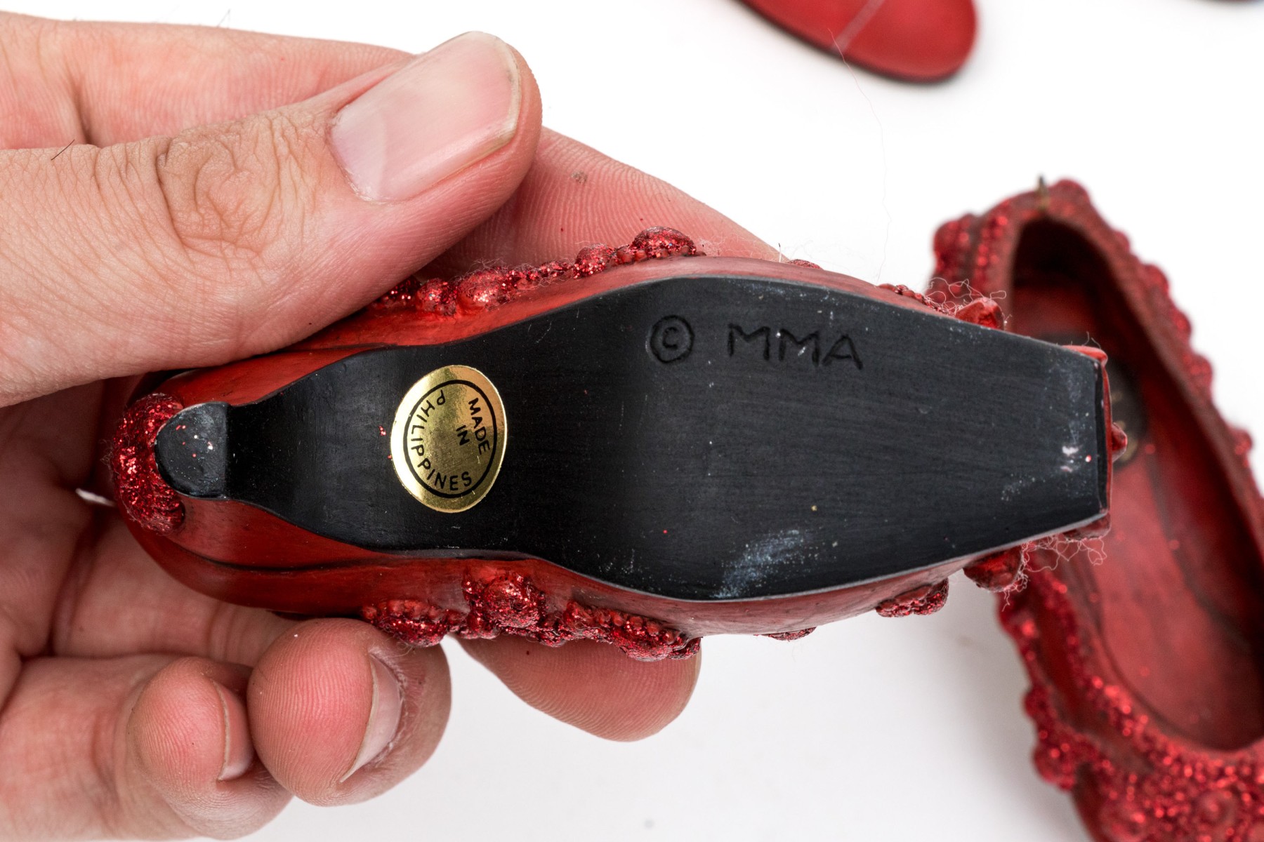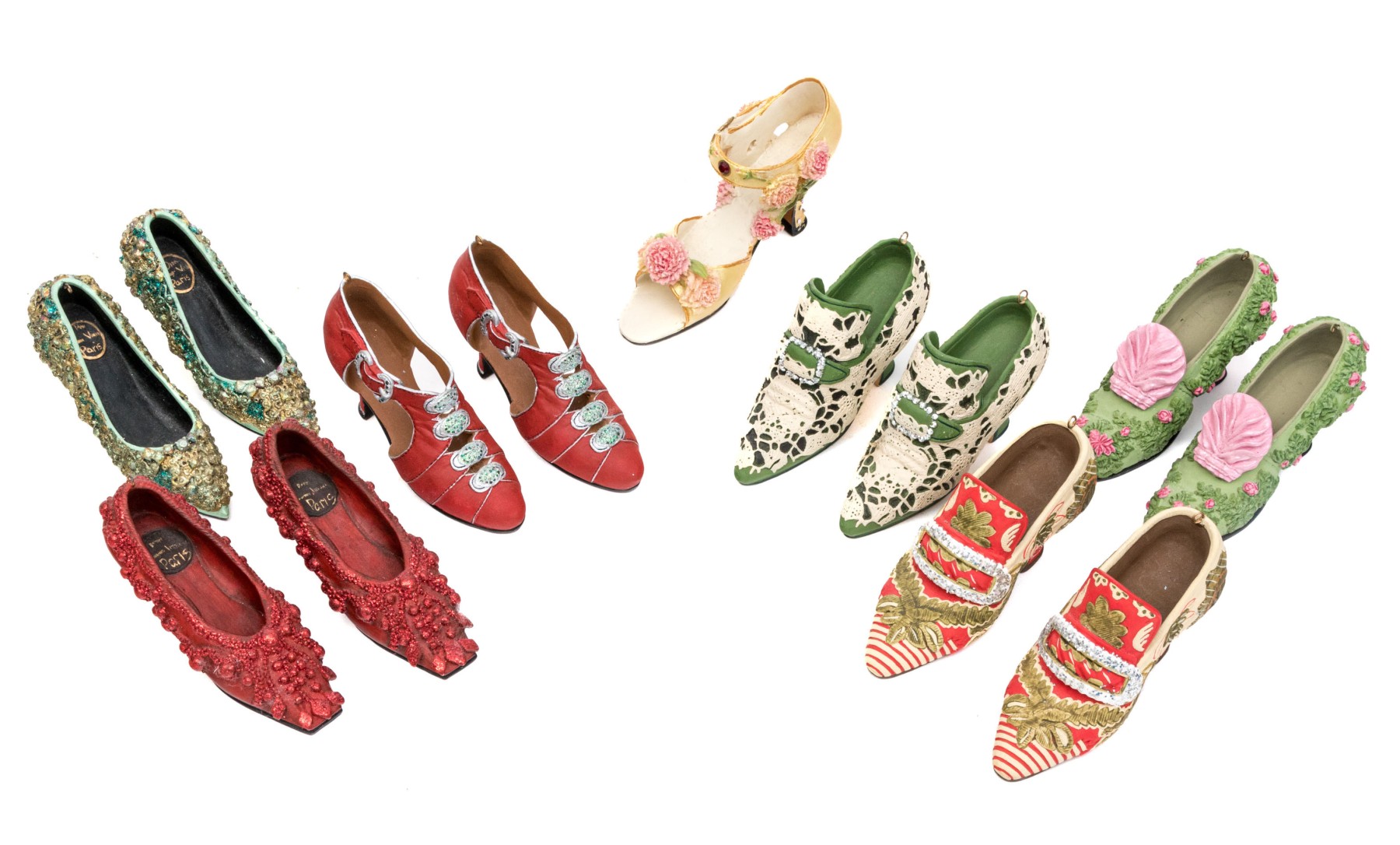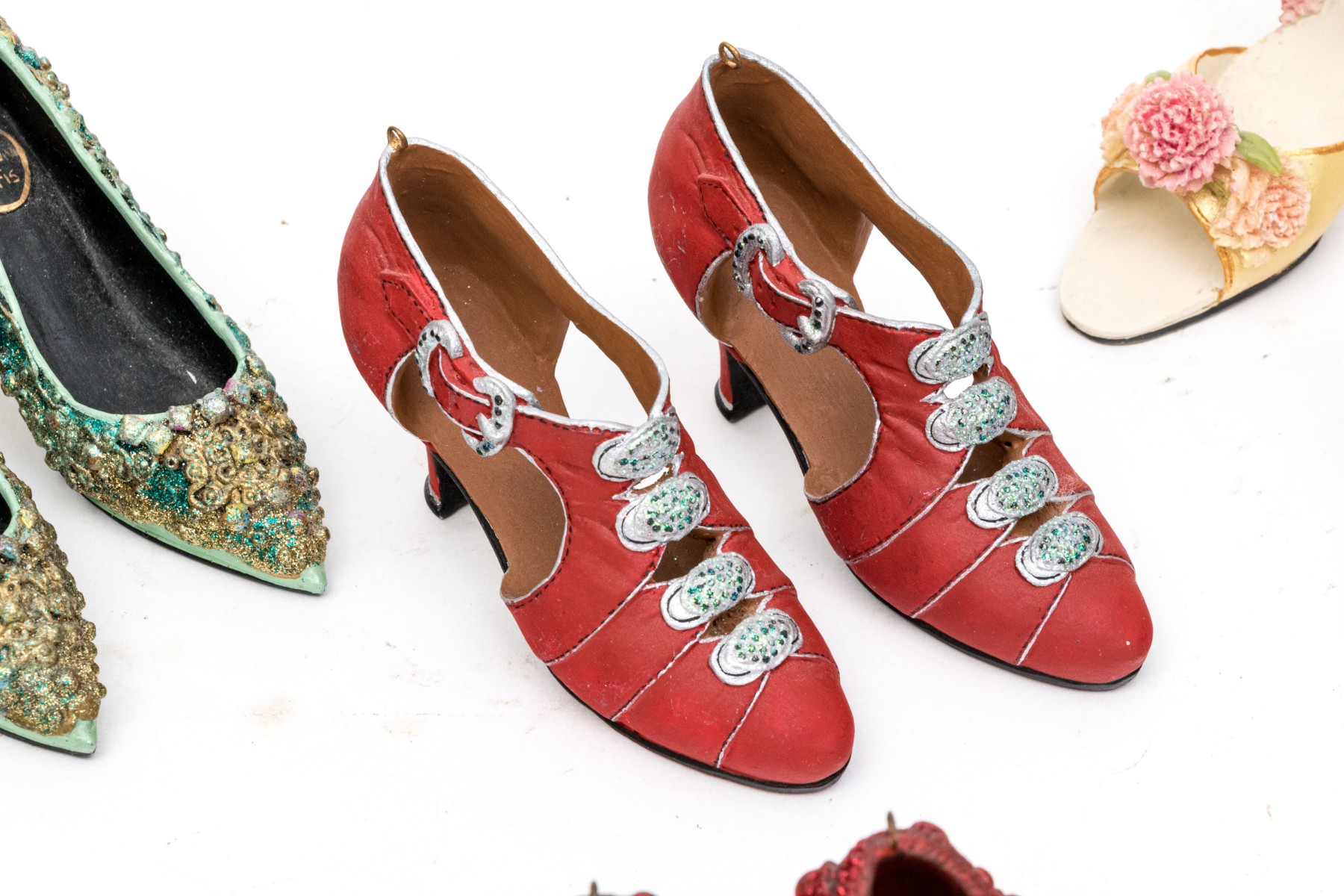 Six pairs of painted colored ceramic fancy dress shoes with elaborate decorations. Two are marked Roger Vivier Paris. All with tiny hooks for suspension at the back.