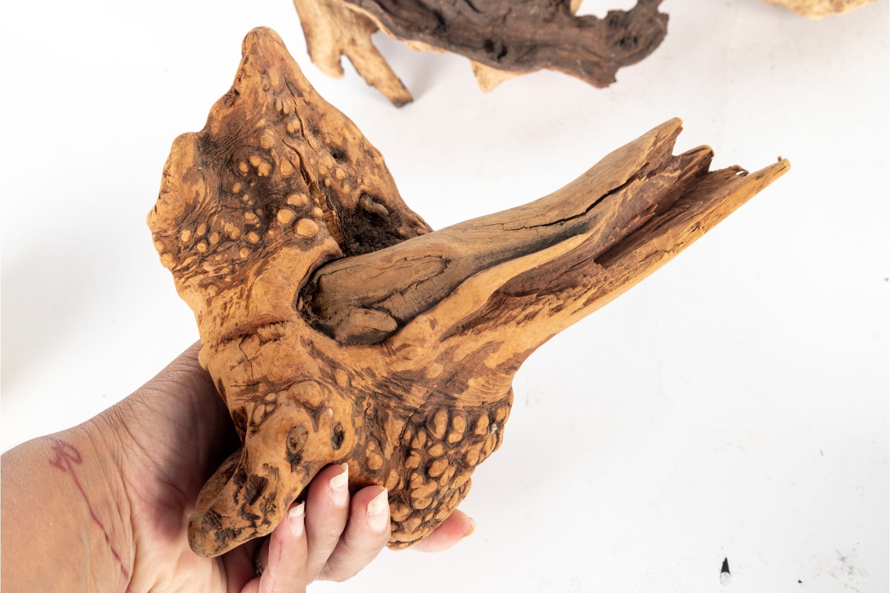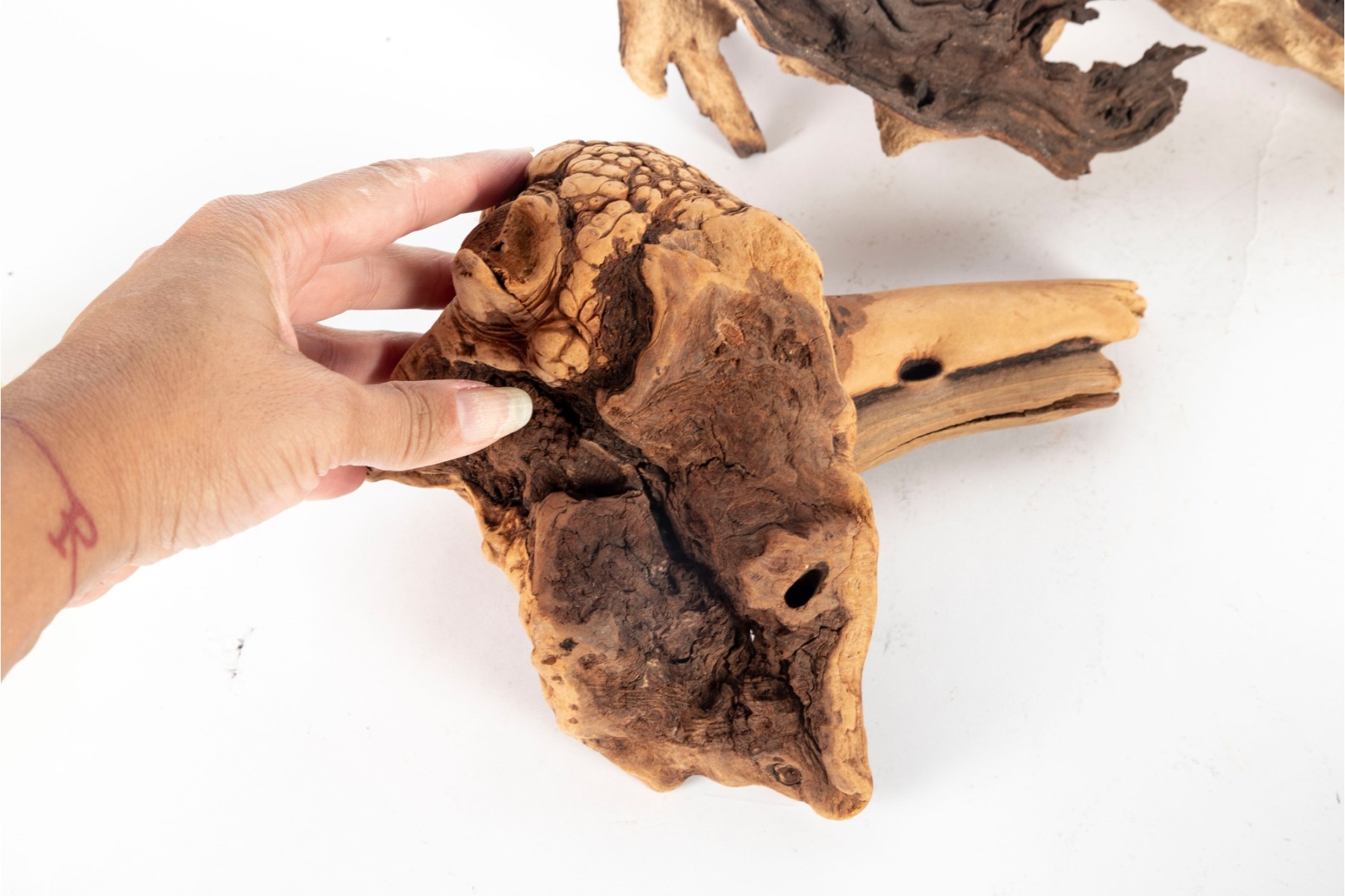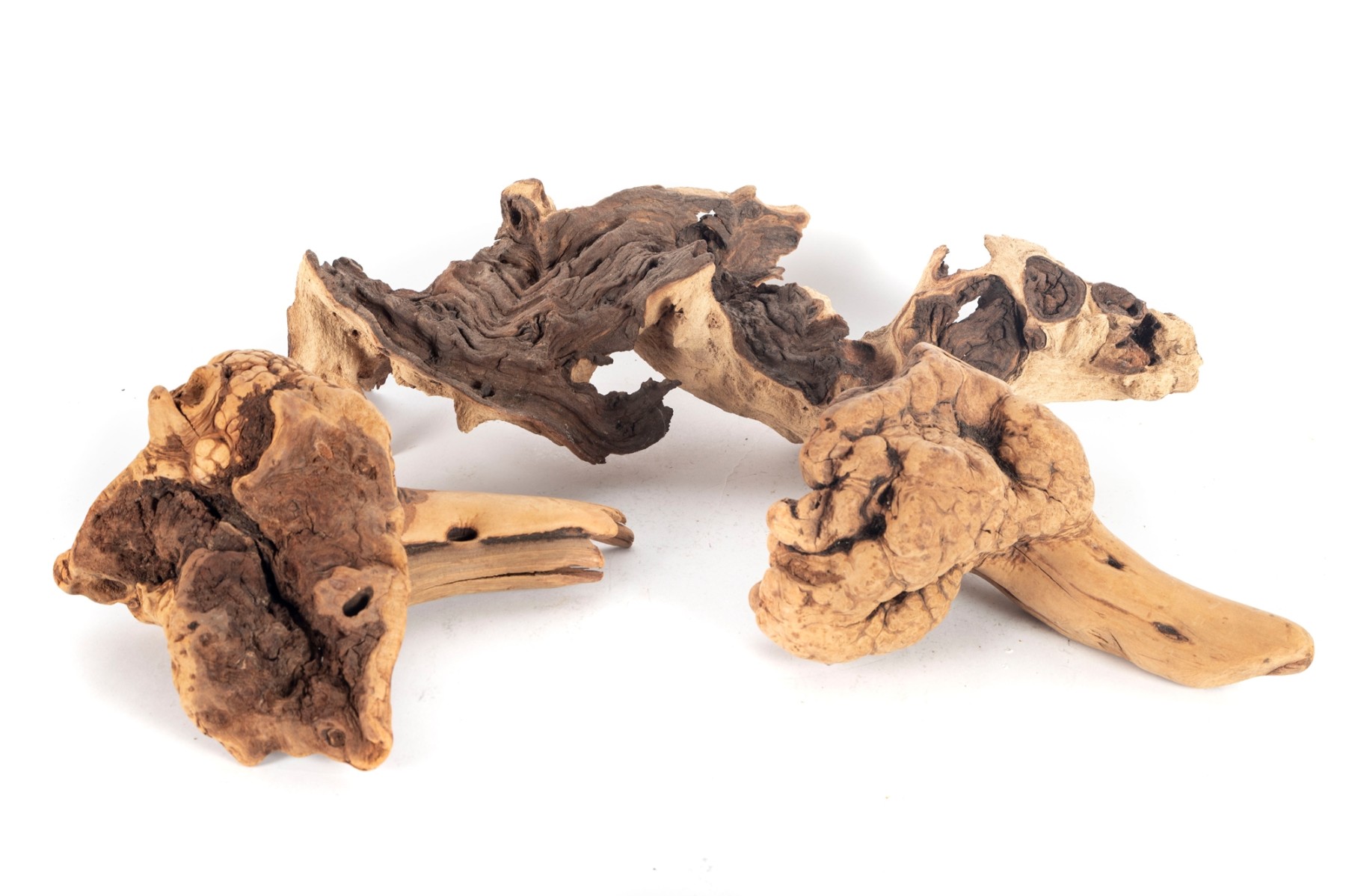 Group of natural driftwood burl wood pieces with unique organic forms and rich grain patterns. Each piece varies in shape and texture, showcasing natural knots, twists, and cavities.