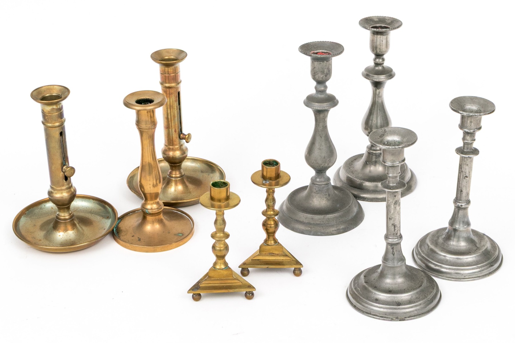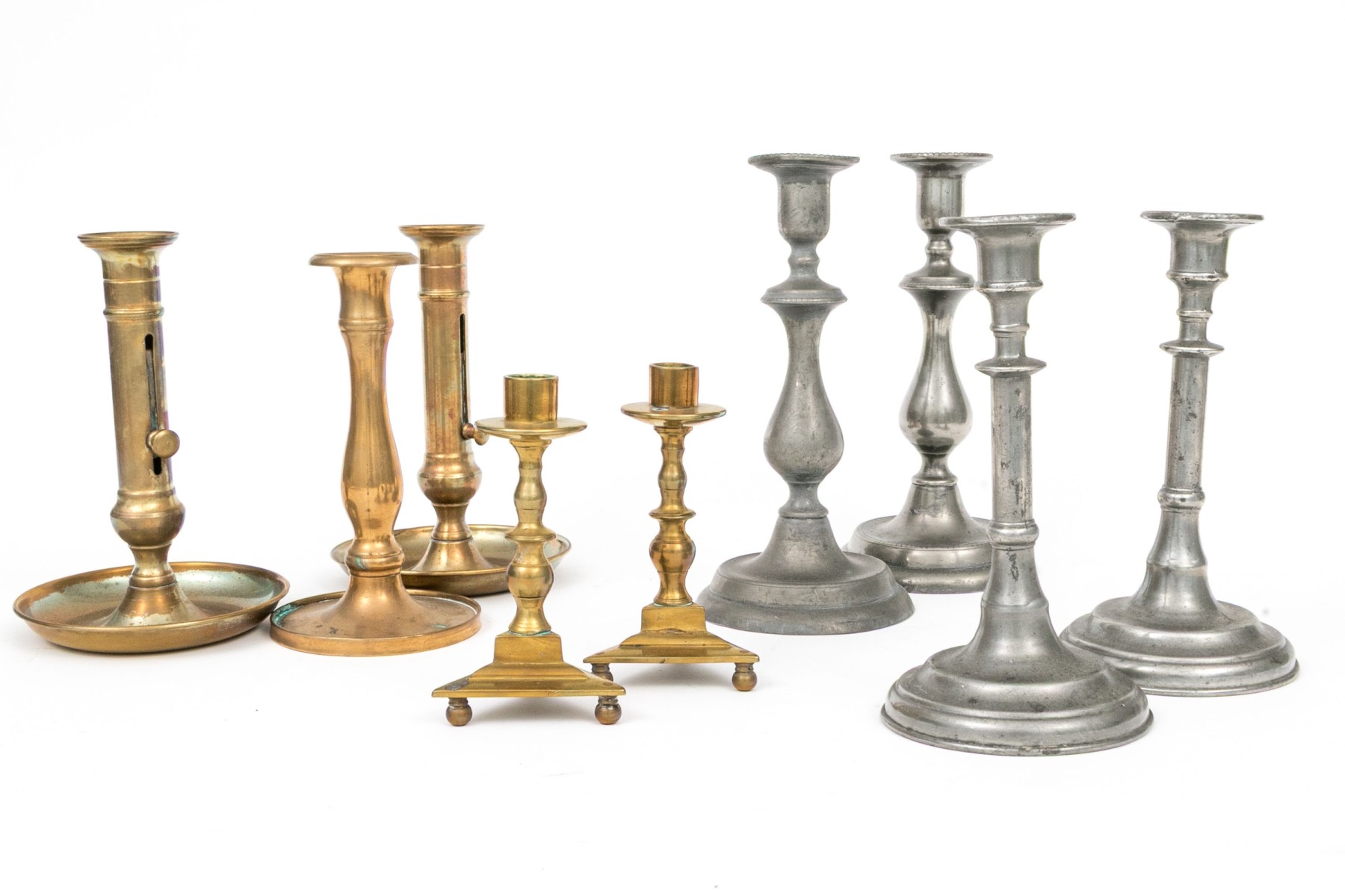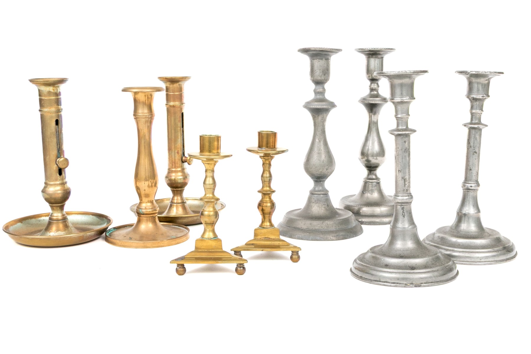 A delightful collection of nine antique candlesticks. Comprised of four pairs and one single.
