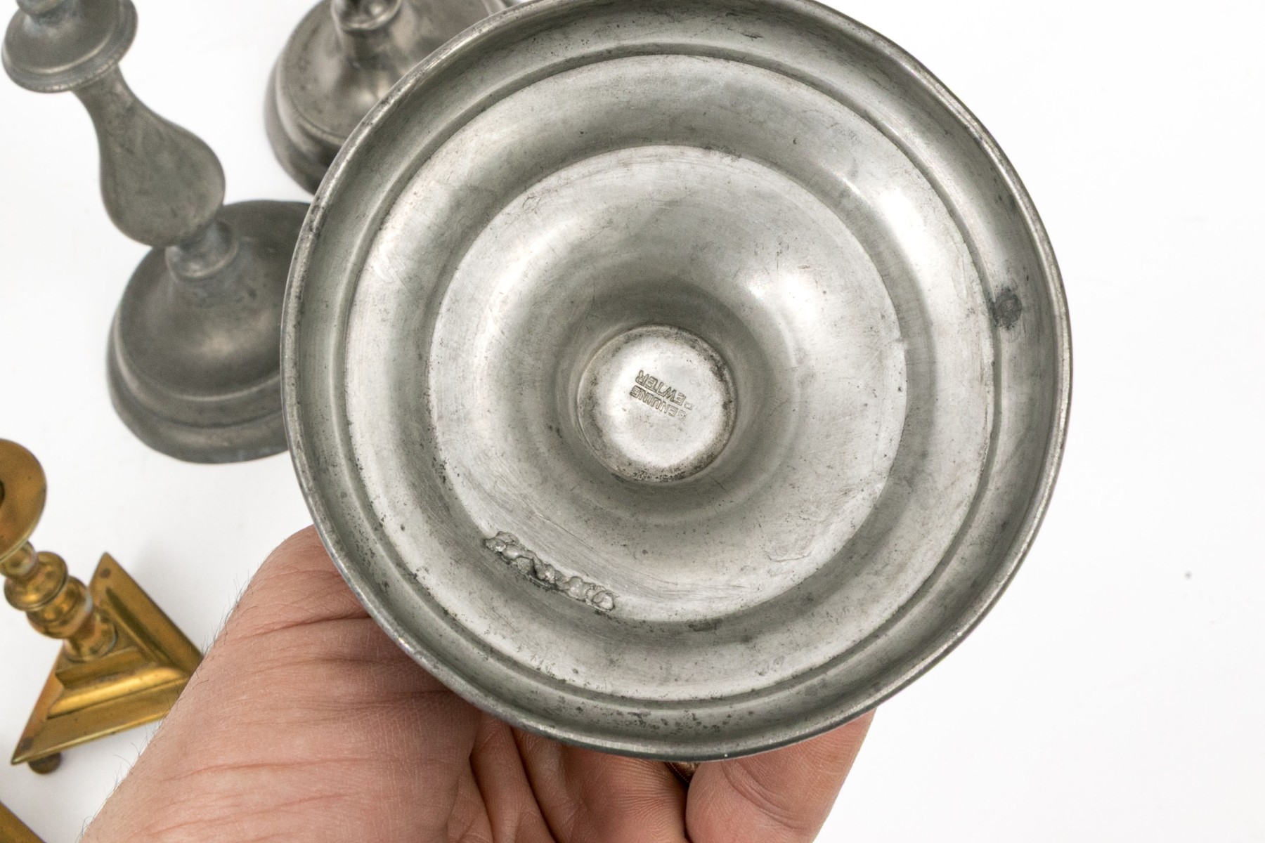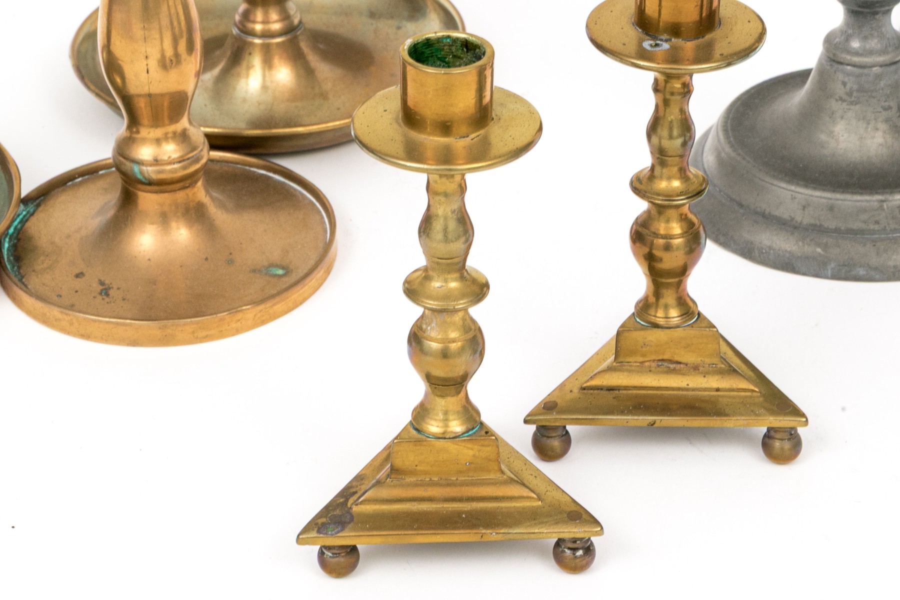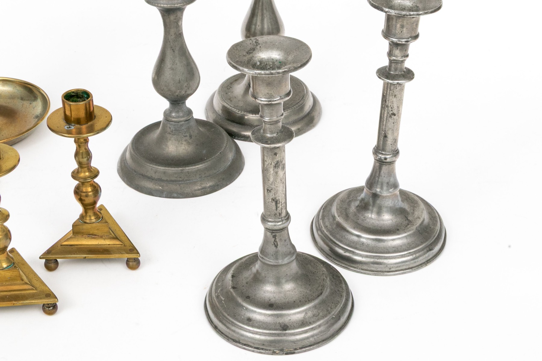 A delightful collection of nine antique candlesticks. Comprised of four pairs and one single.