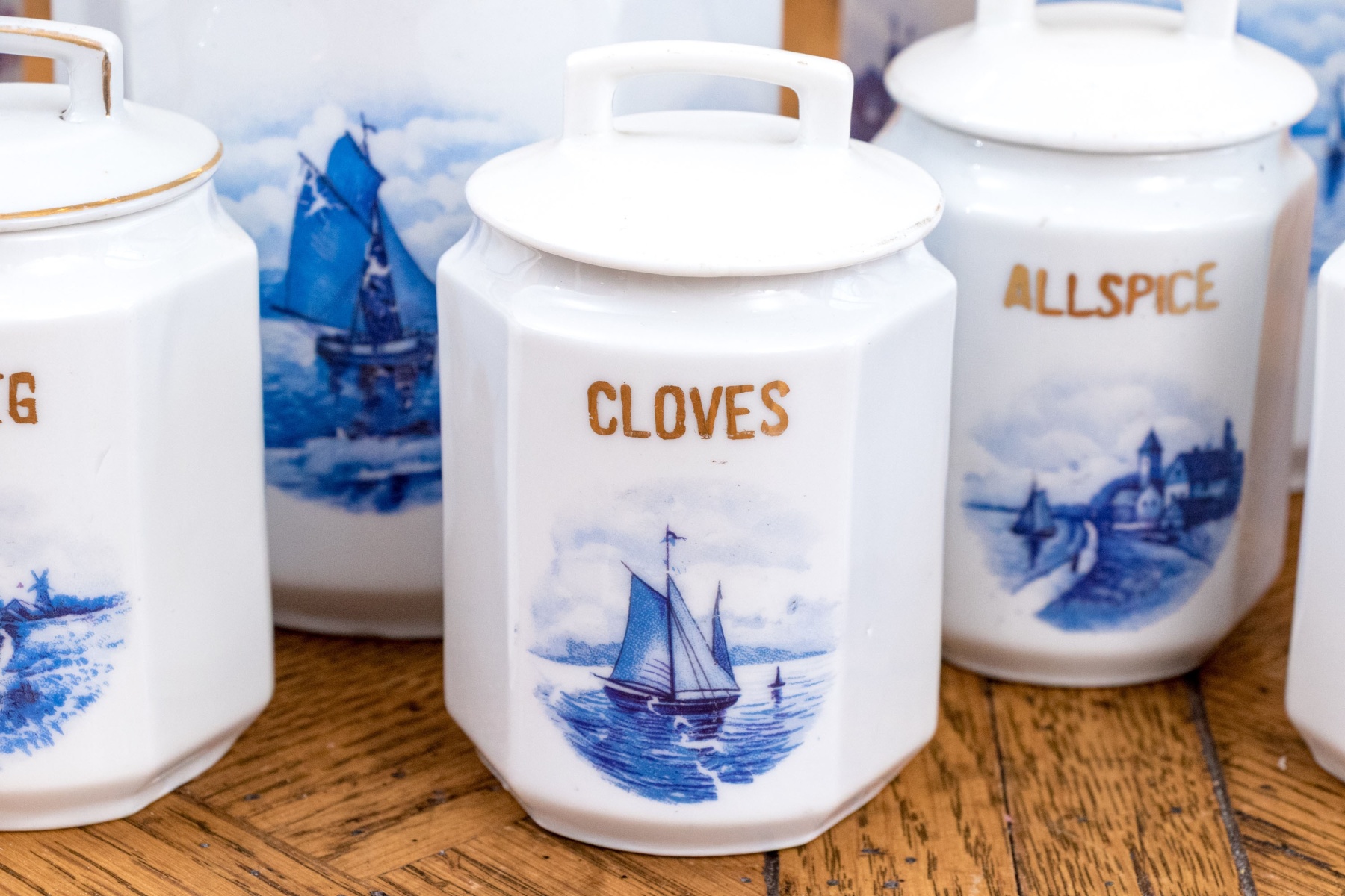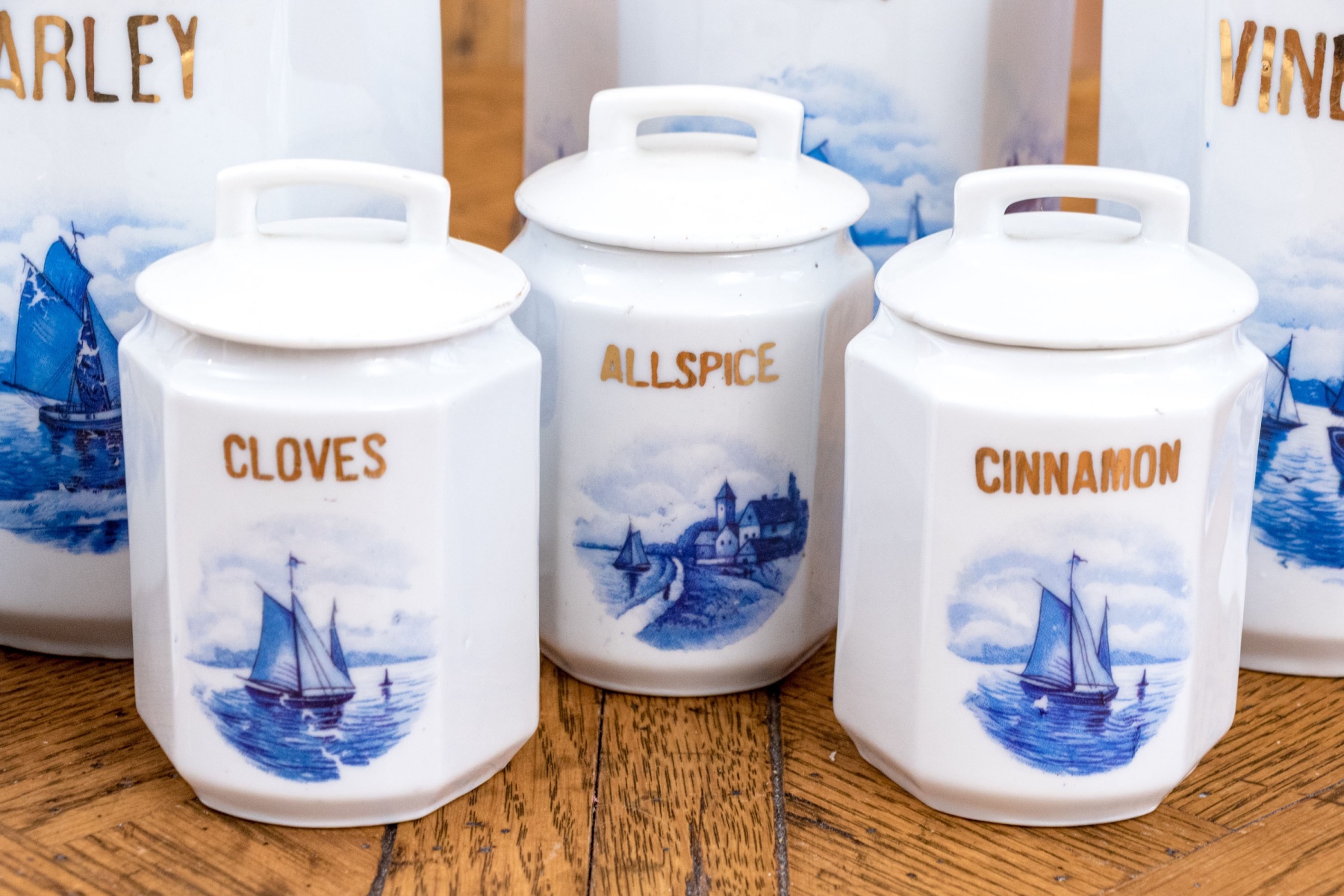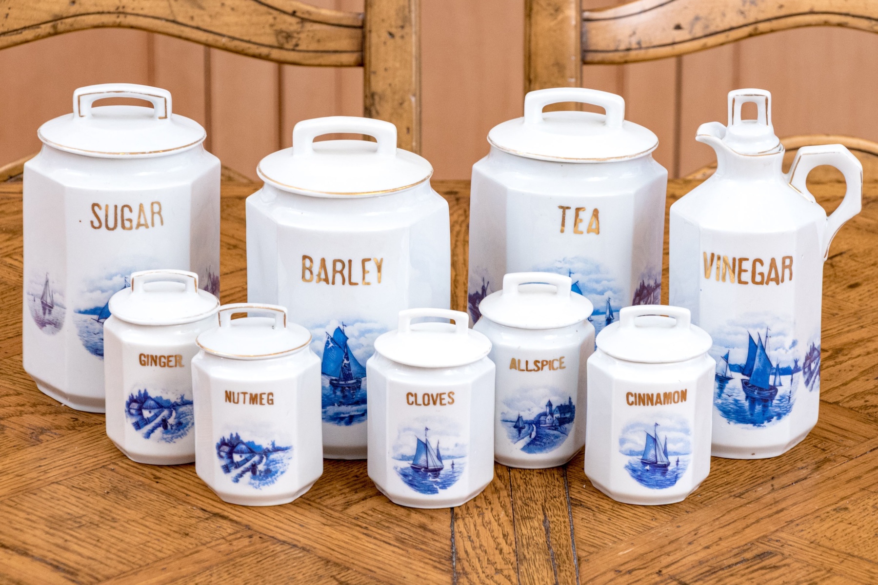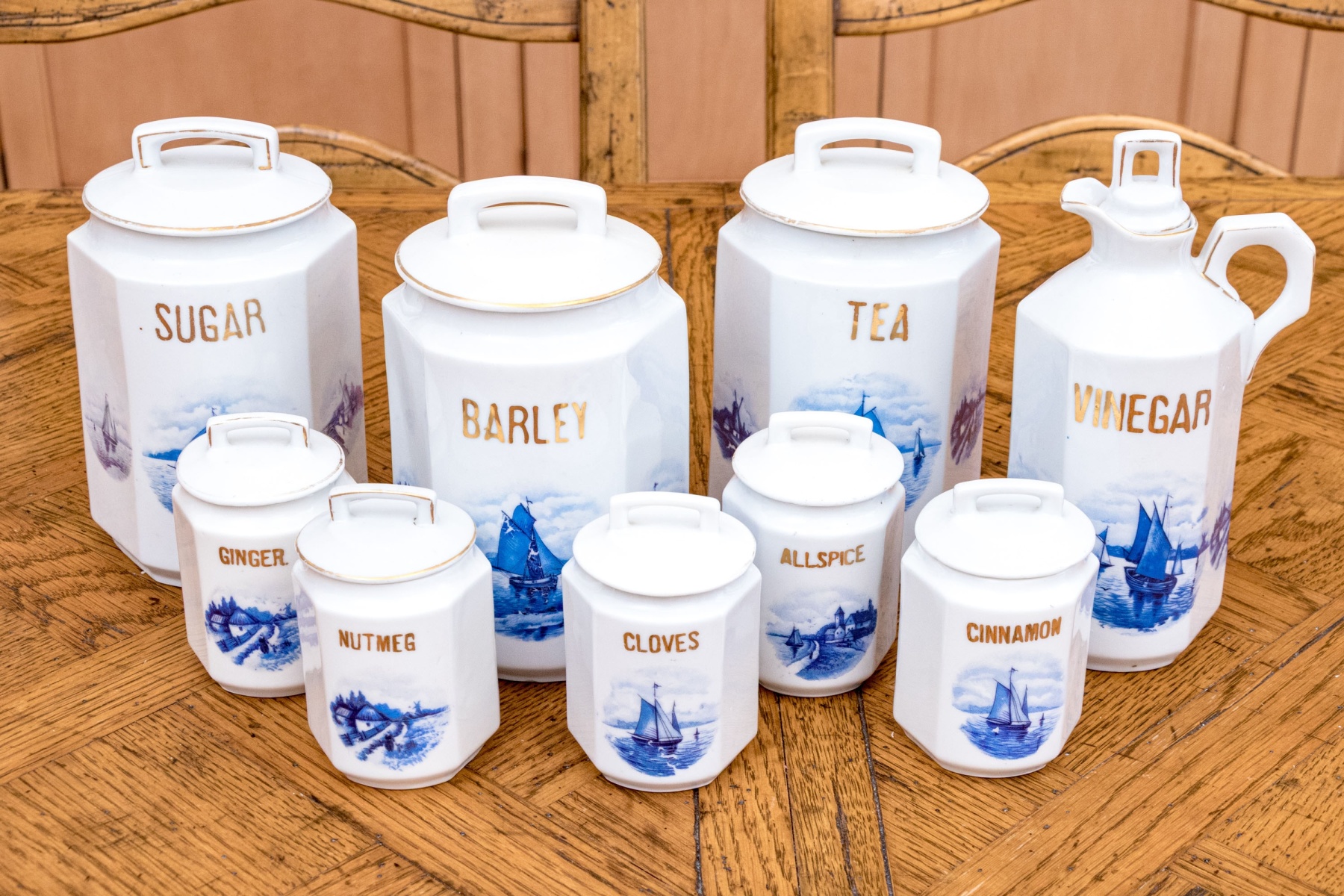 Comprised of 5 smaller lidded containers, all with blue and white reserves and gilt wording including: Ginger, Nutmeg, Cloves, Allspice and Cinnamon. Together with a lidded Vinegar ewer and 3 larger lidded storagge vessels marked Sugar, Barley and Tea. All with nautical blue reserves.