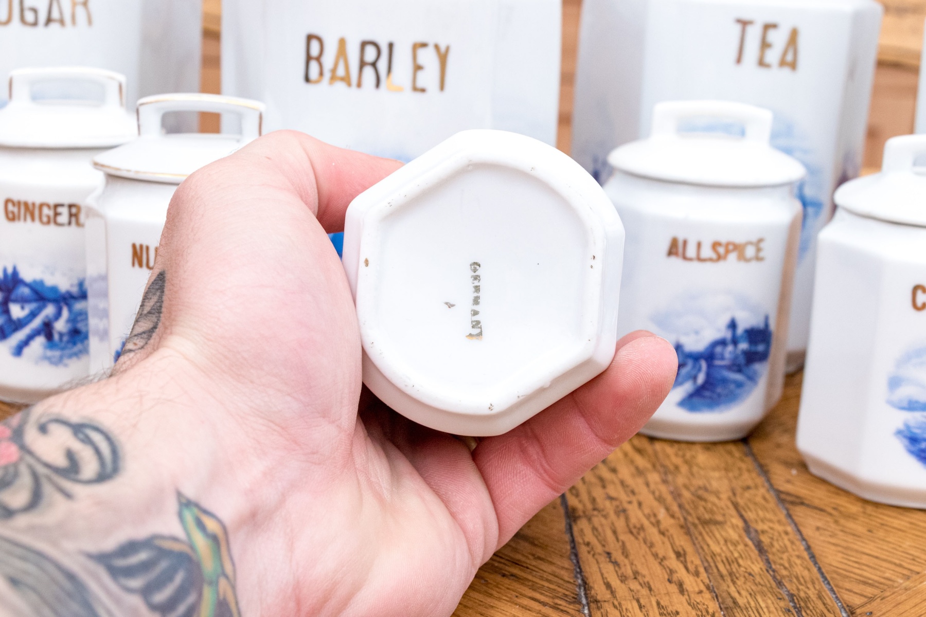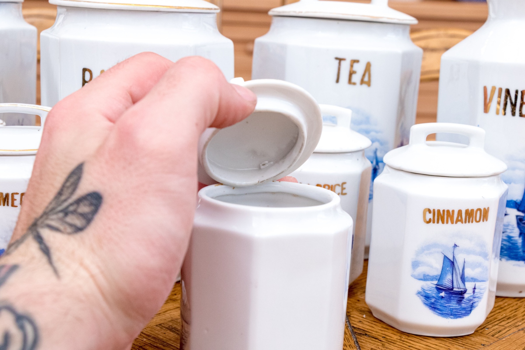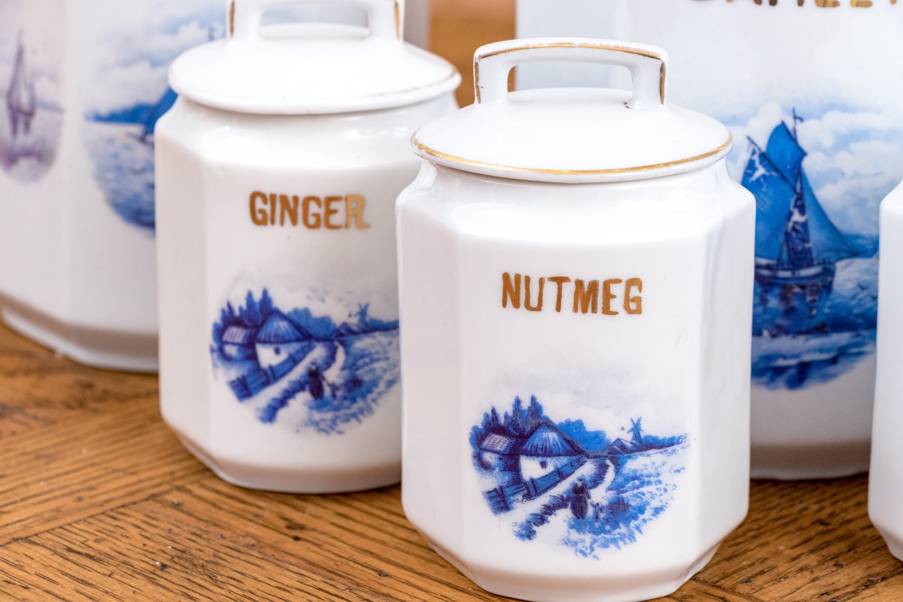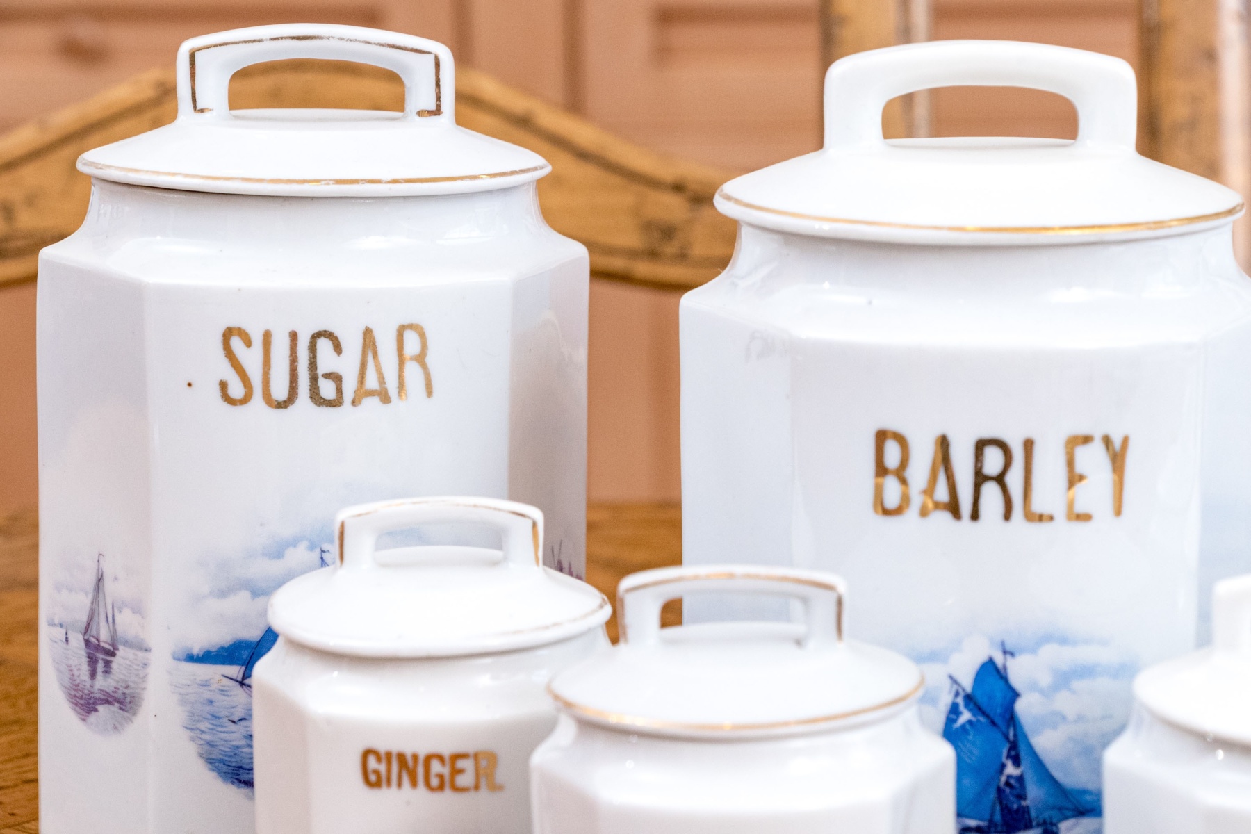 Comprised of 5 smaller lidded containers, all with blue and white reserves and gilt wording including: Ginger, Nutmeg, Cloves, Allspice and Cinnamon. Together with a lidded Vinegar ewer and 3 larger lidded storagge vessels marked Sugar, Barley and Tea. All with nautical blue reserves.