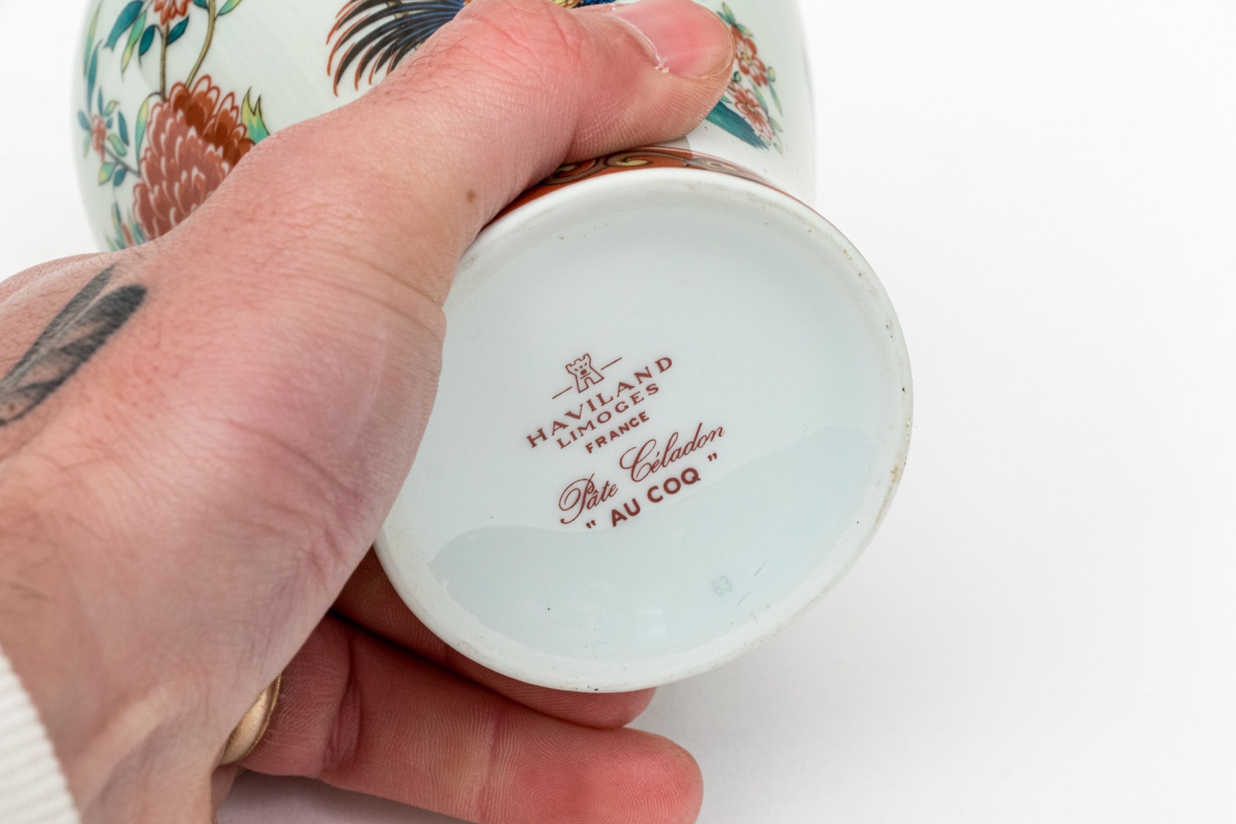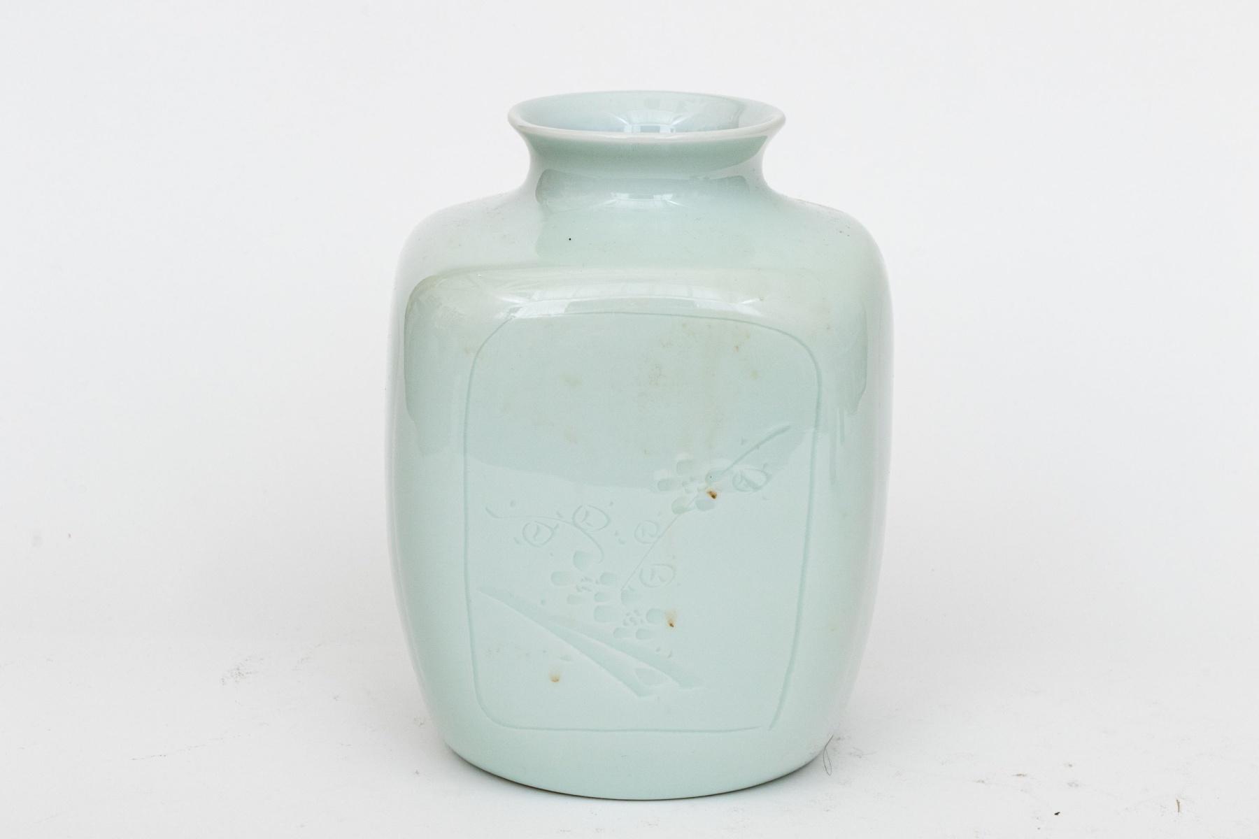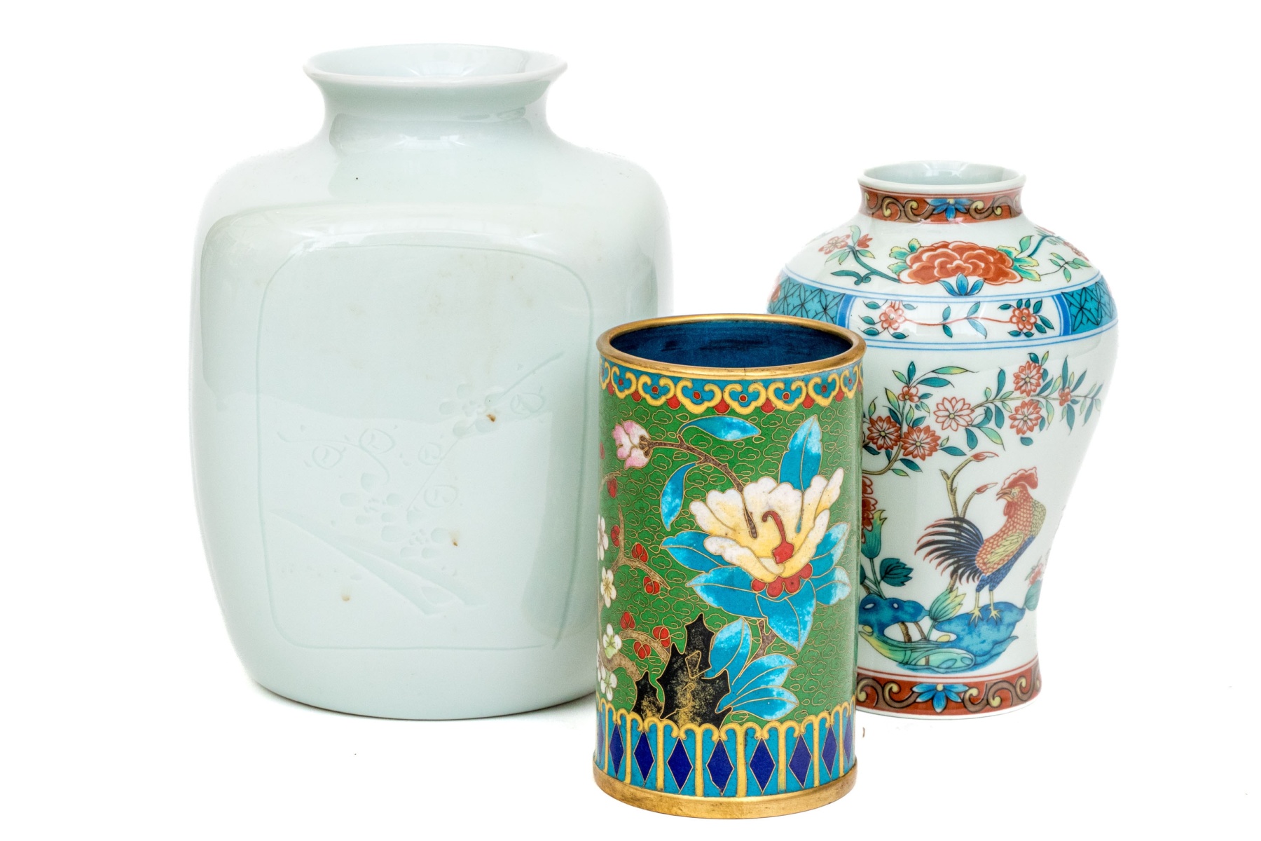 Comprised of a Haviland Limoges Pate Celadon "Au Coq" pattern baluster form porcelain vase, a cloisonne pen hold in cylindrical form, and pale celadon glazed rounded square vase with subtle textural decoration and a signature underfoot.