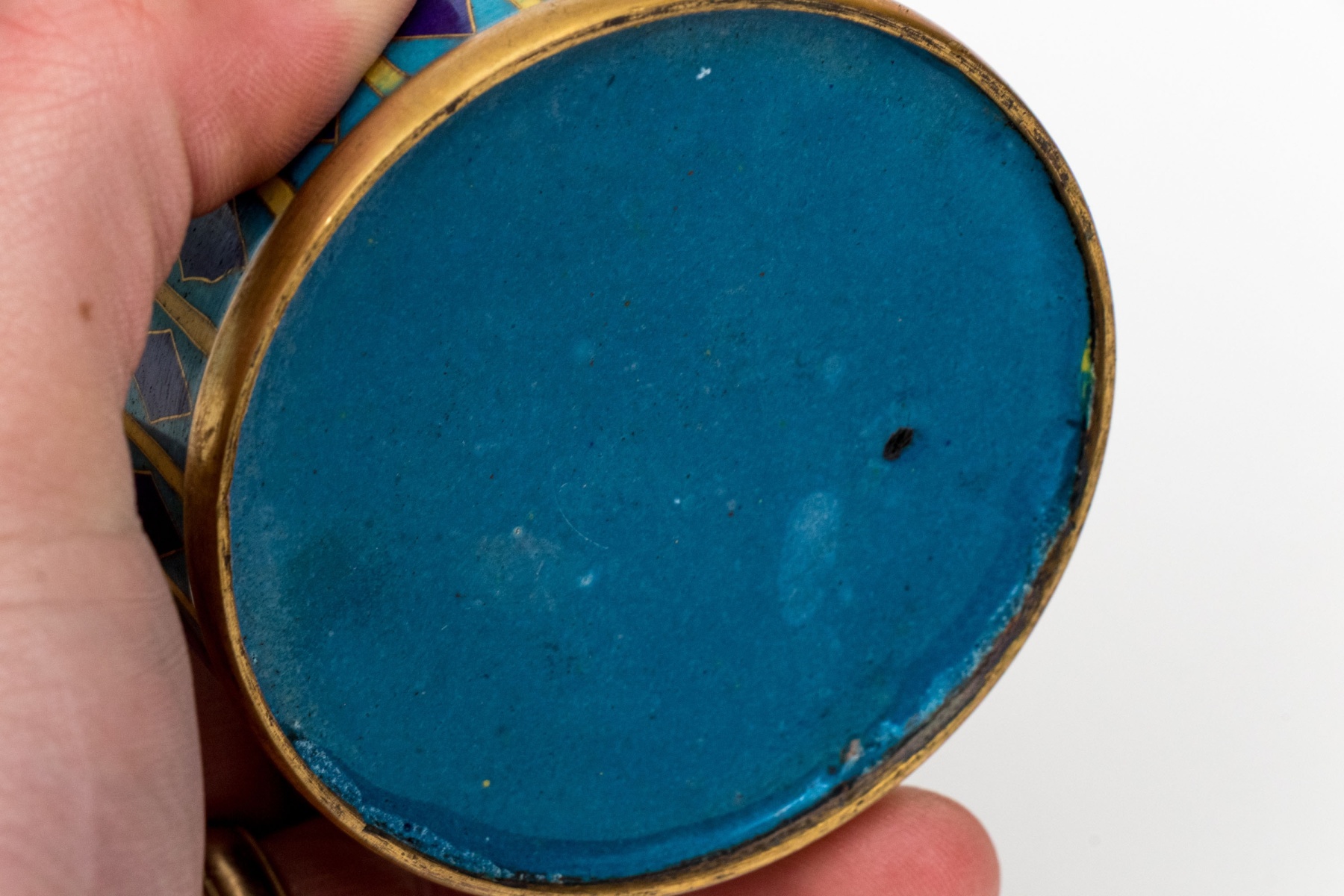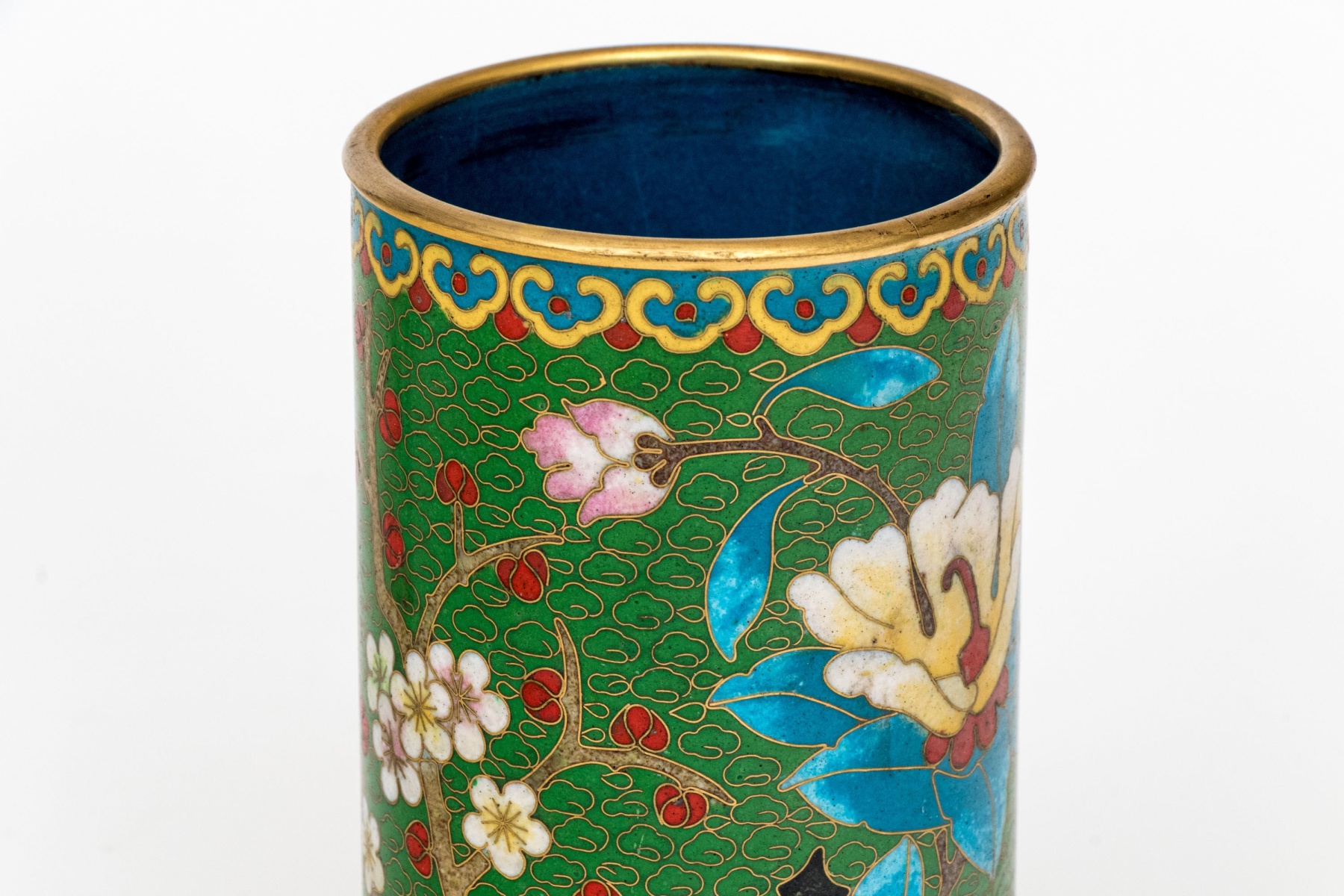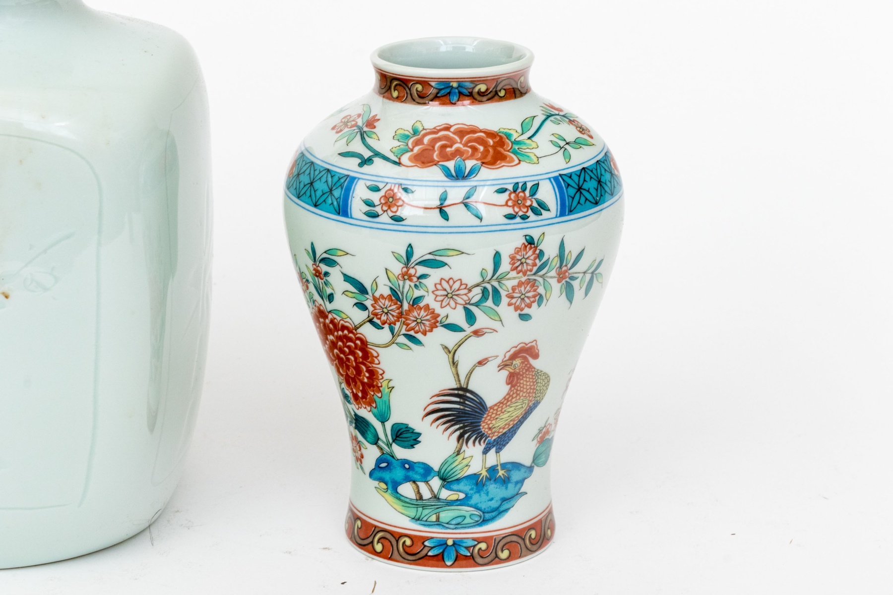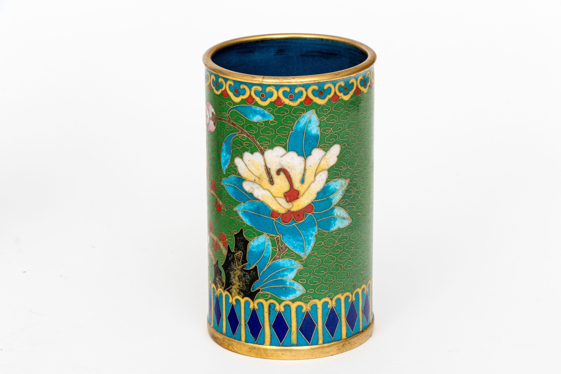 Comprised of a Haviland Limoges Pate Celadon "Au Coq" pattern baluster form porcelain vase, a cloisonne pen hold in cylindrical form, and pale celadon glazed rounded square vase with subtle textural decoration and a signature underfoot.
