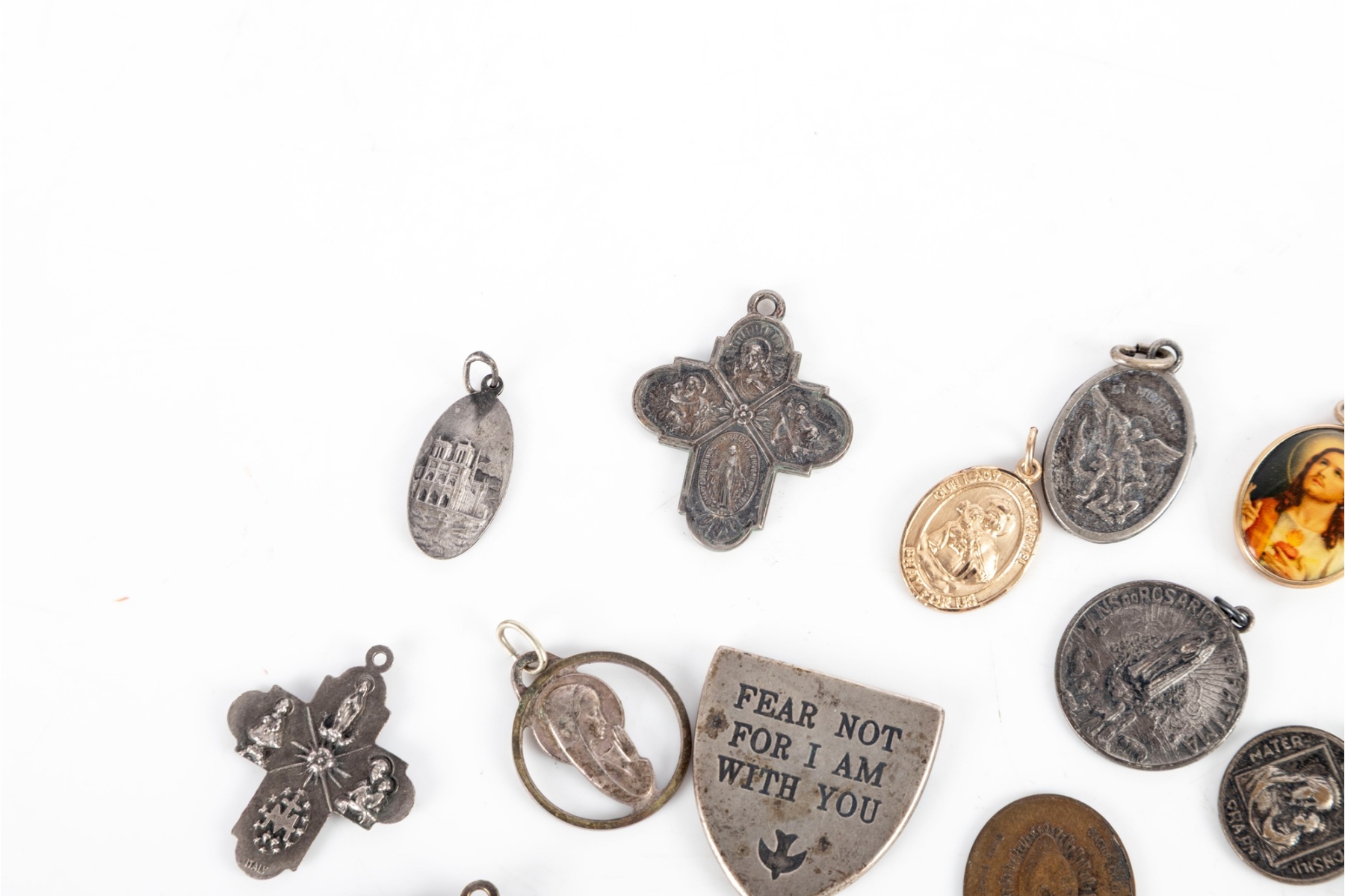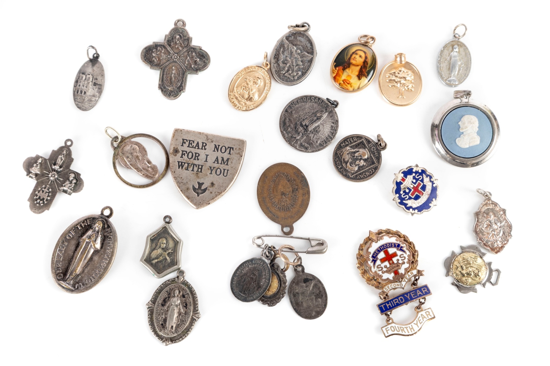 Large assortment of vintage and modern religious medals, pendants, tokens, and pins. Includes various depictions of the Virgin Mary, Jesus, saints, crosses, and devotional sayings, along with miscellaneous service pins and other faith-based insignias.