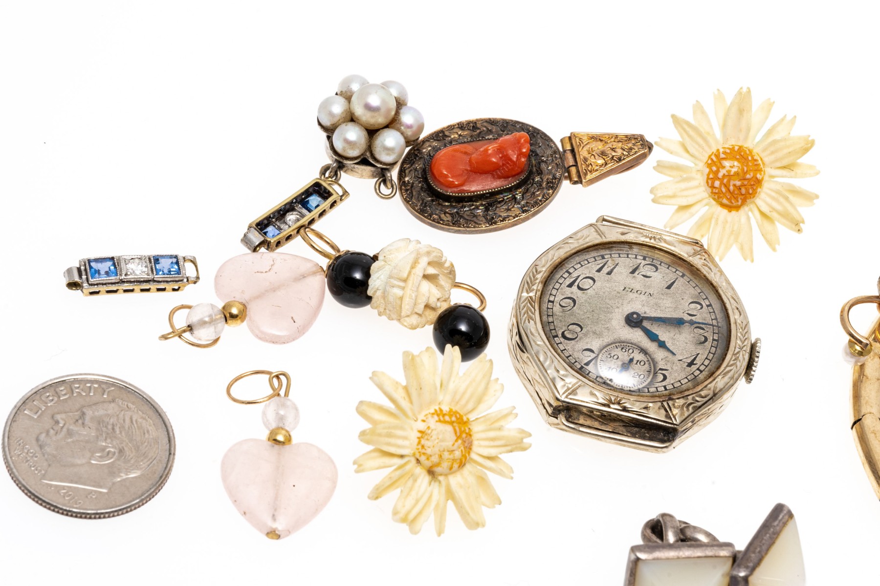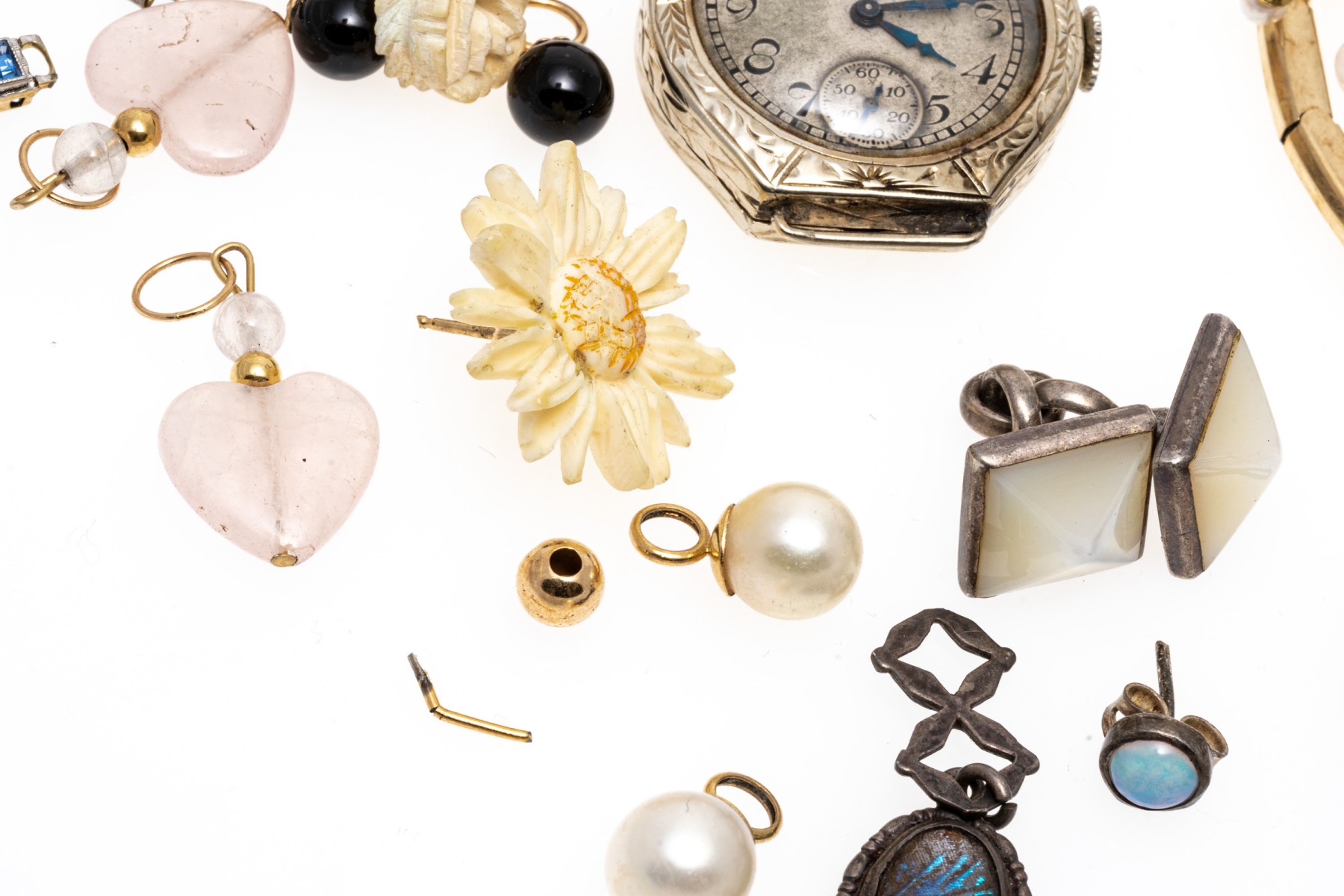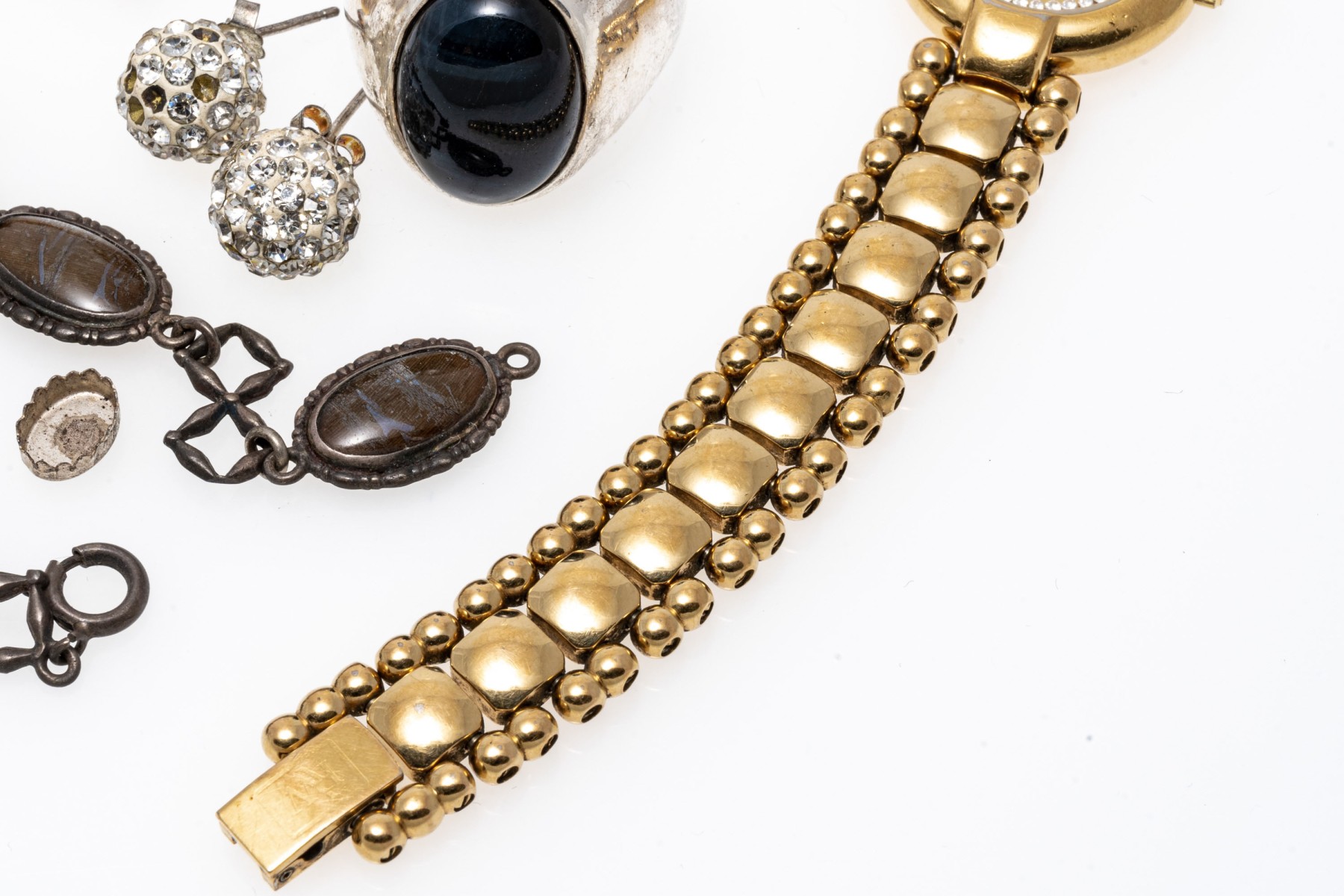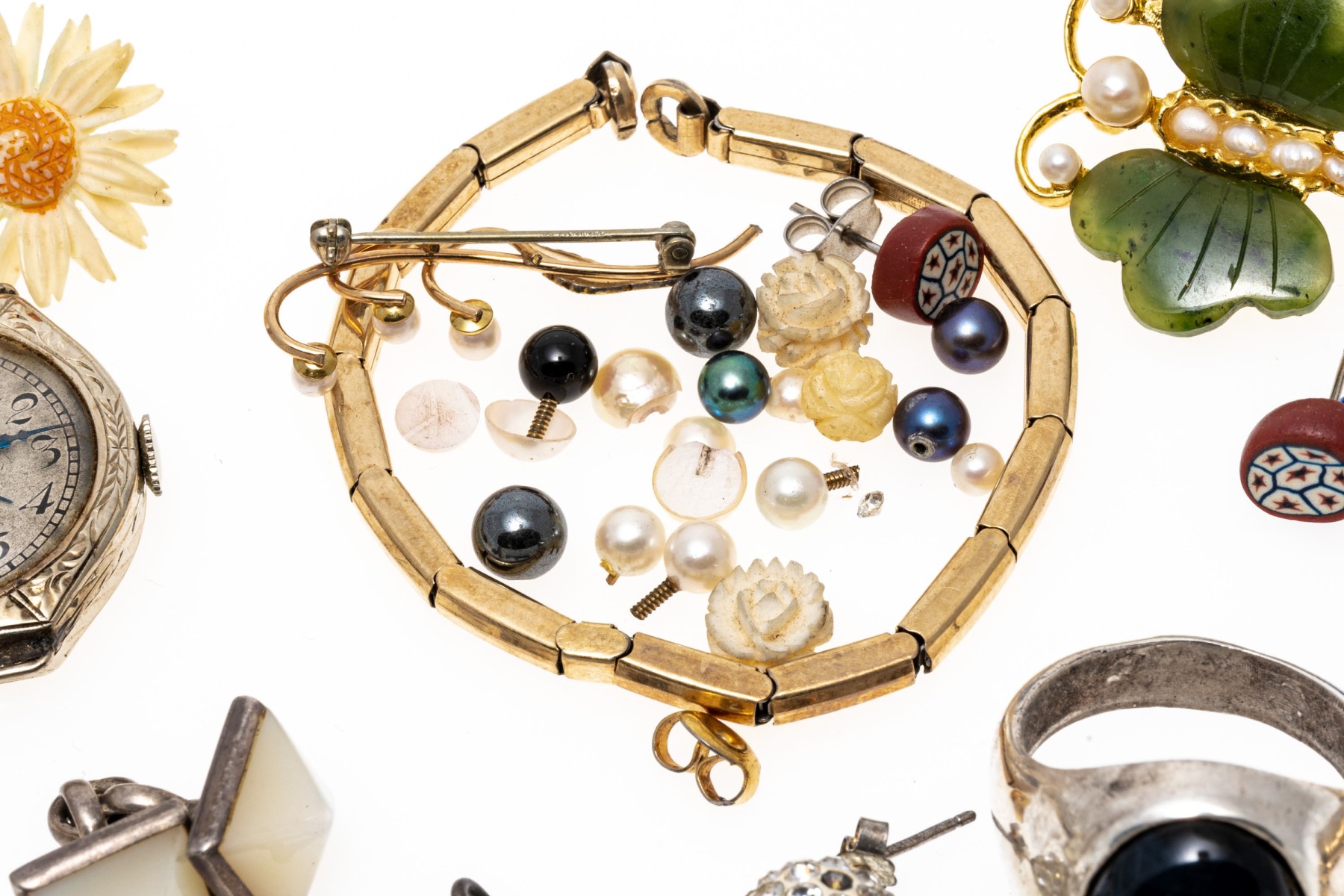 Condition: Broken and missing pieces. Fashion jewelry. Watch dial not working, needs servicing.