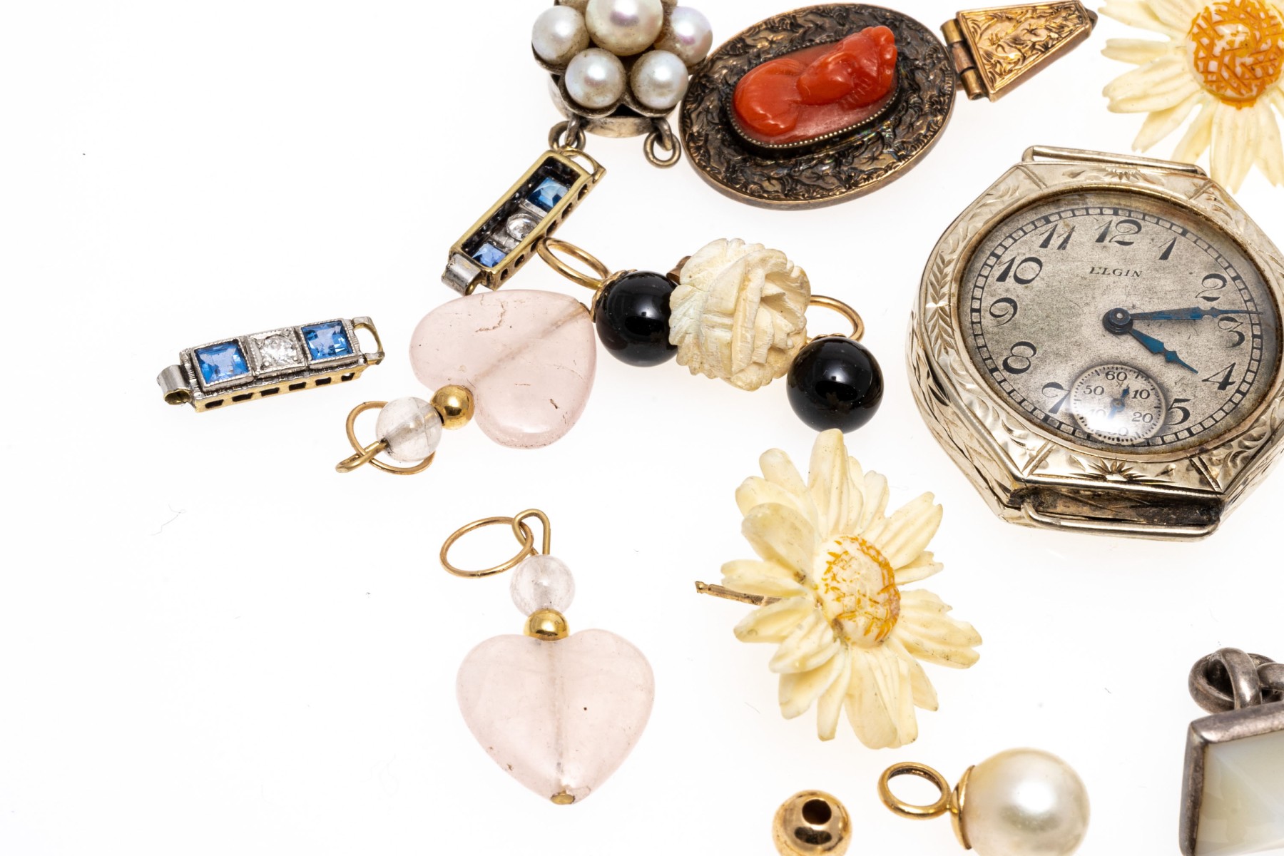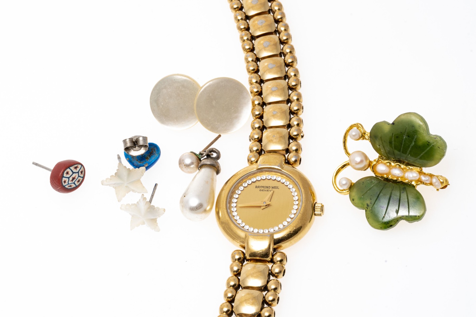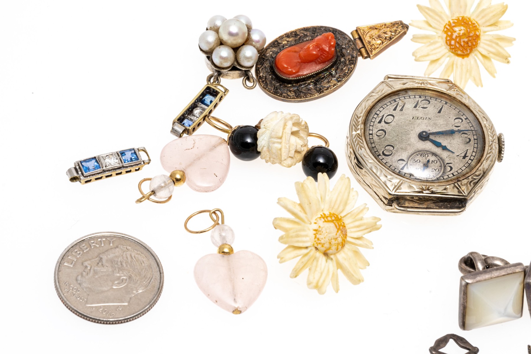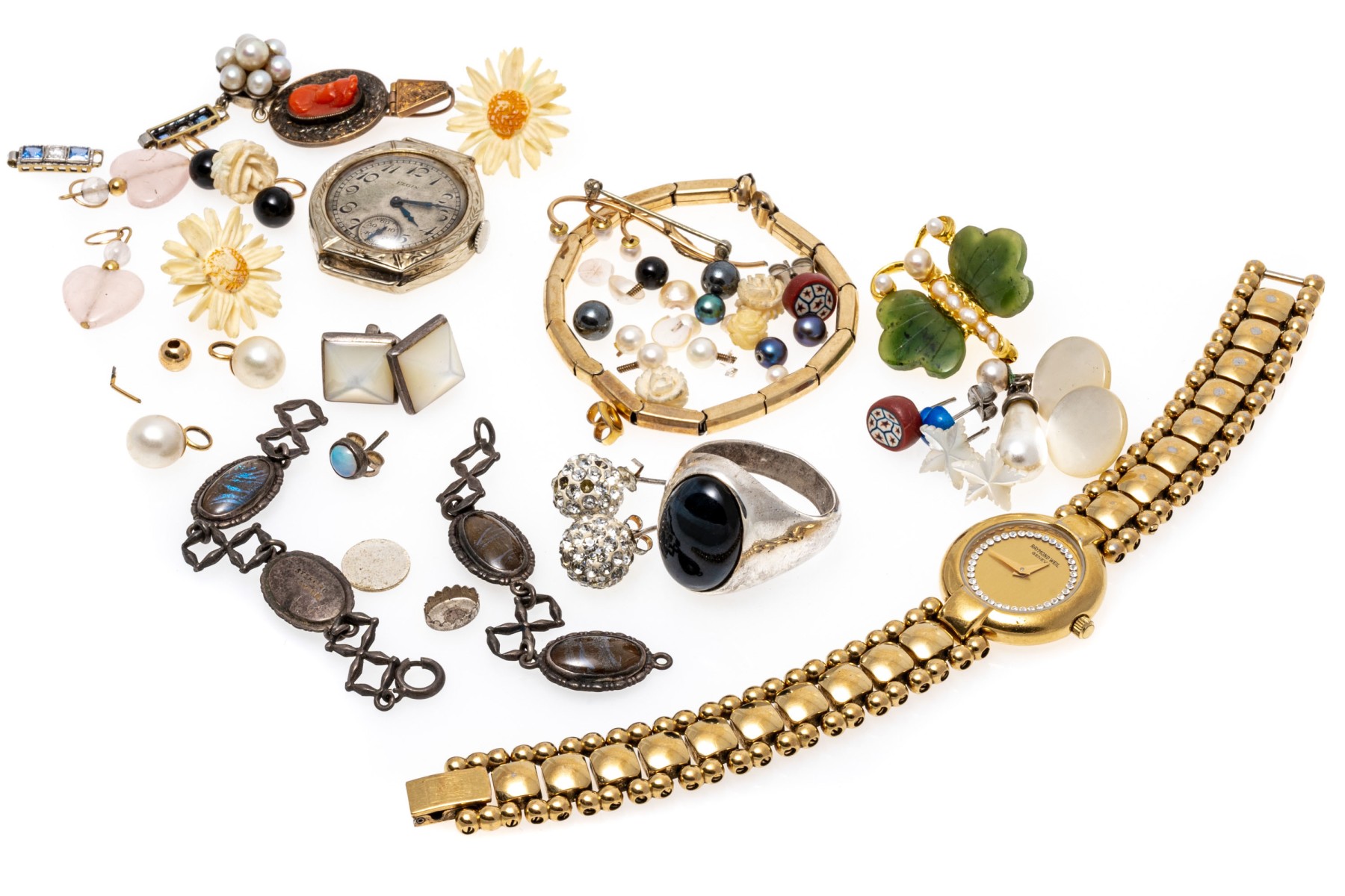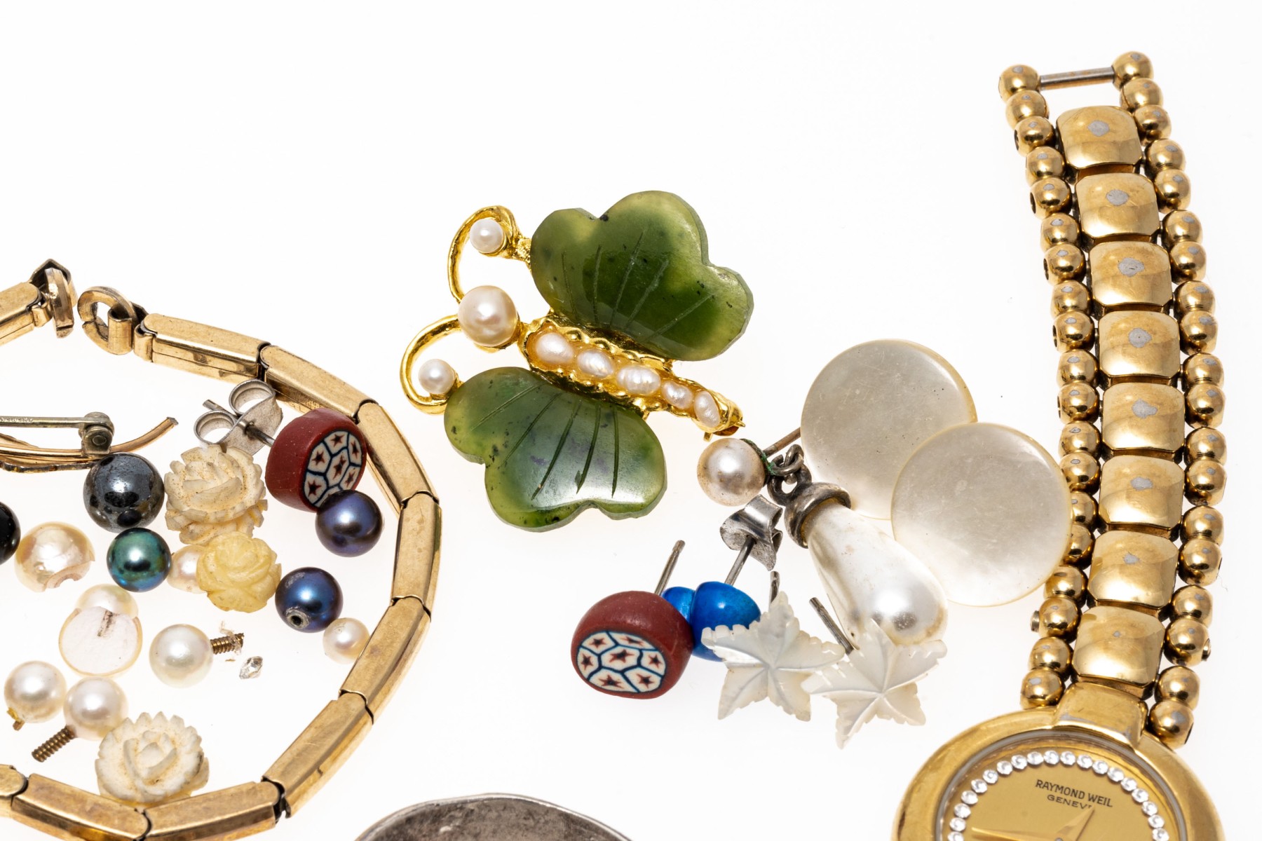 Condition: Broken and missing pieces. Fashion jewelry. Watch dial not working, needs servicing.