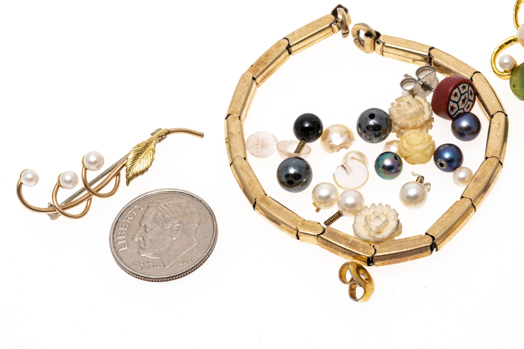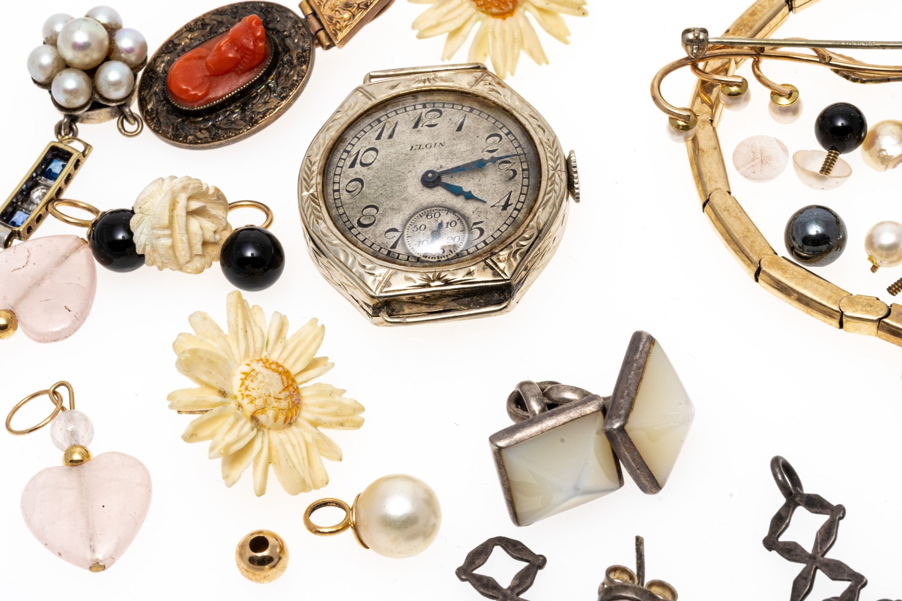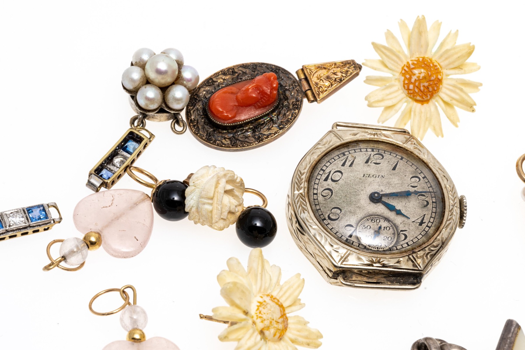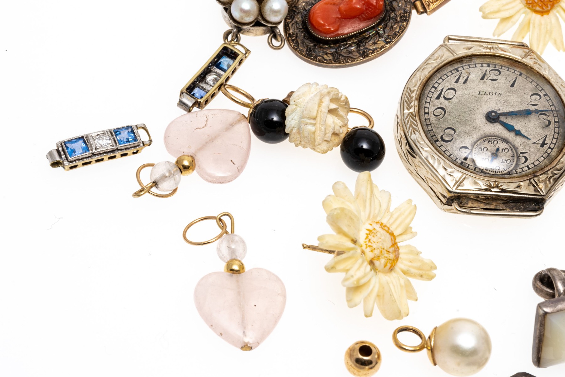 Condition: Broken and missing pieces. Fashion jewelry. Watch dial not working, needs servicing.