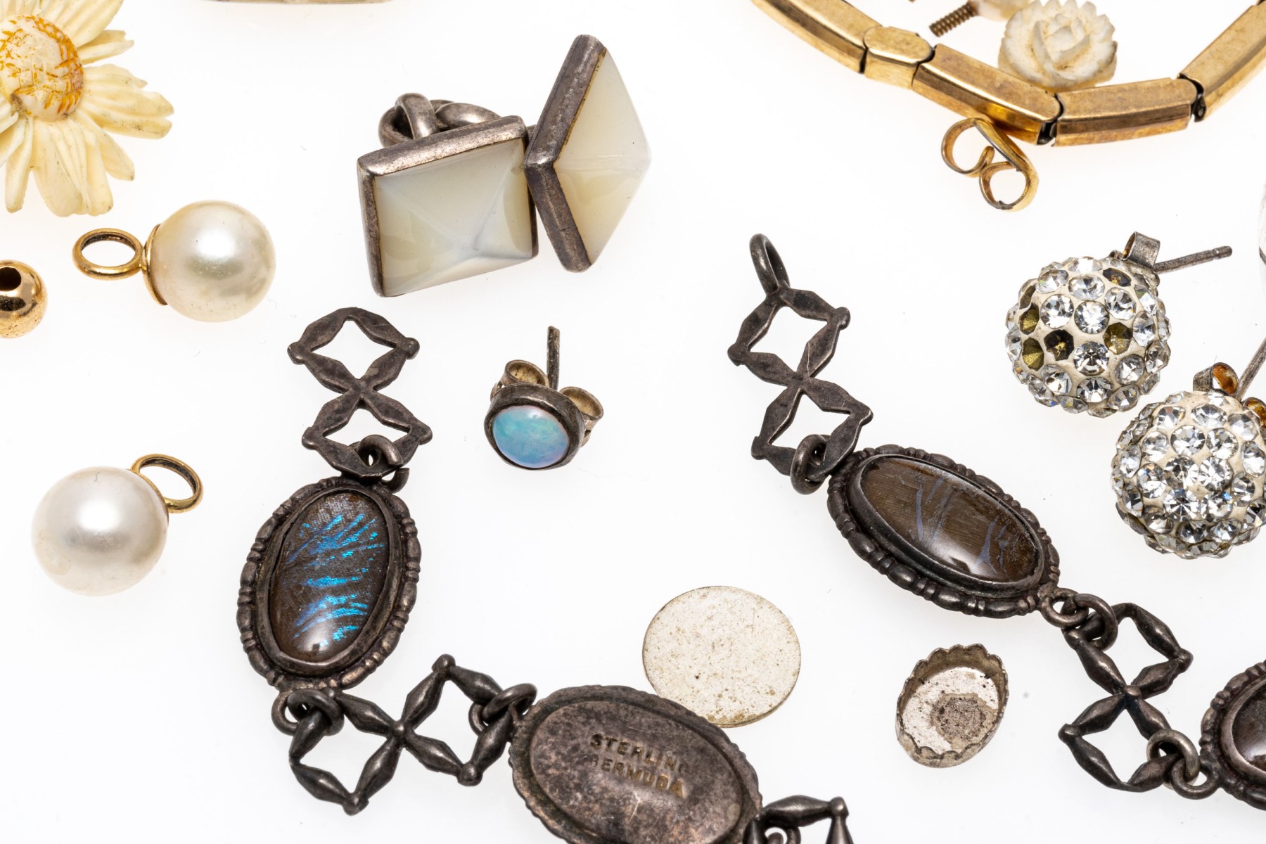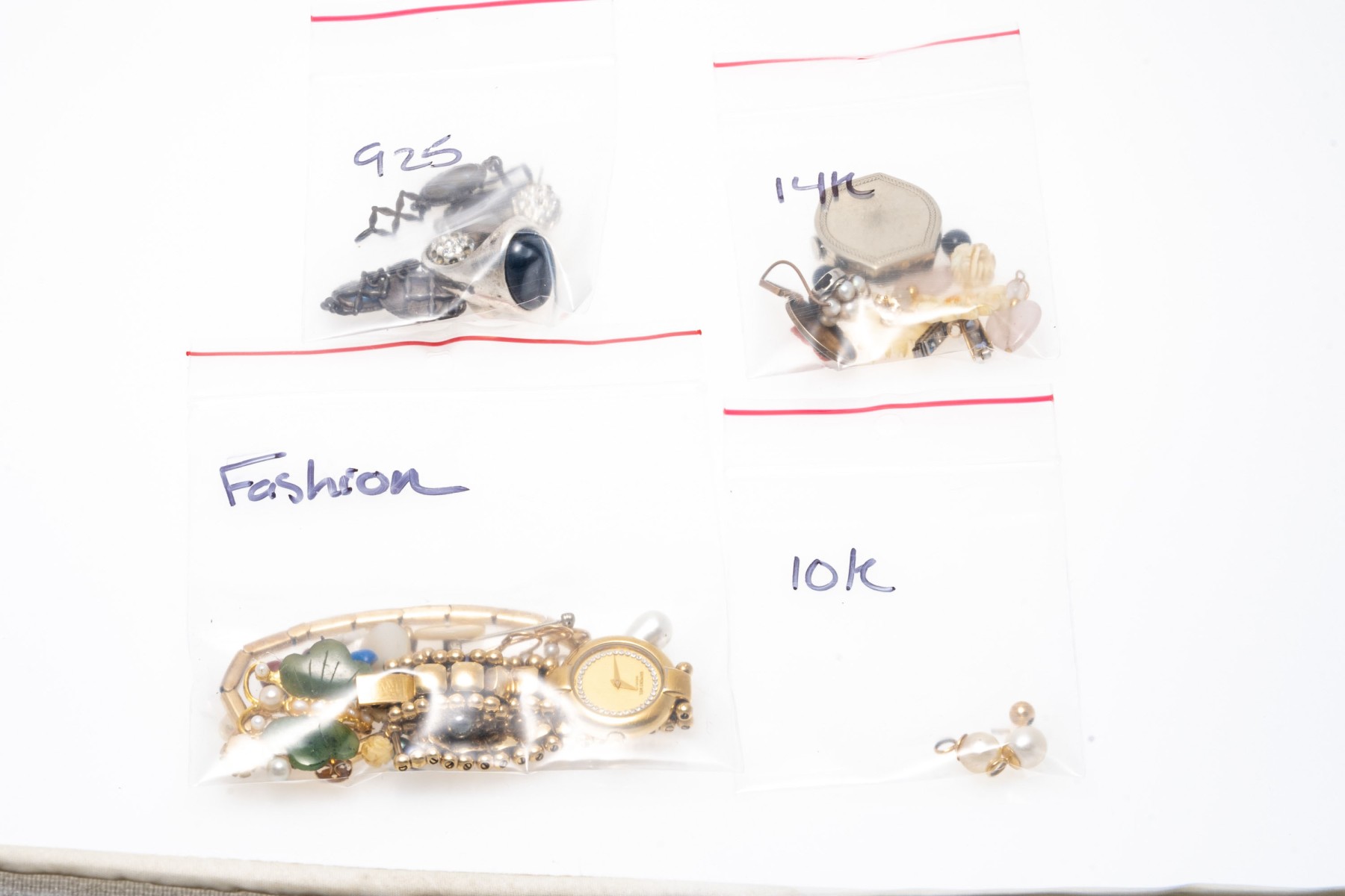 Lot of scrap sterling, 10K and 14K. Collection of fashion jewelry. Lot includes rings, earrings, chain links and a watch dial.