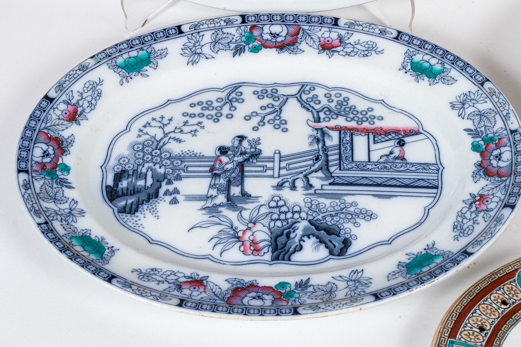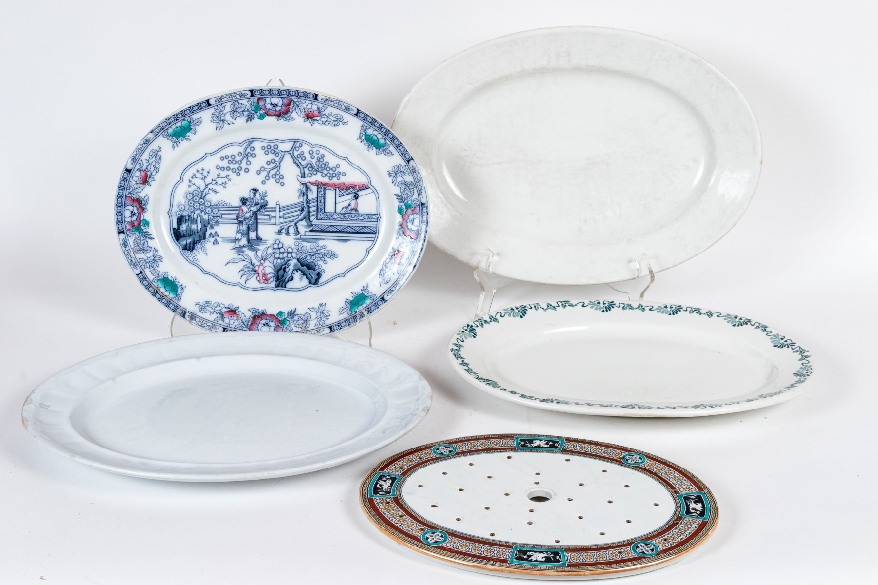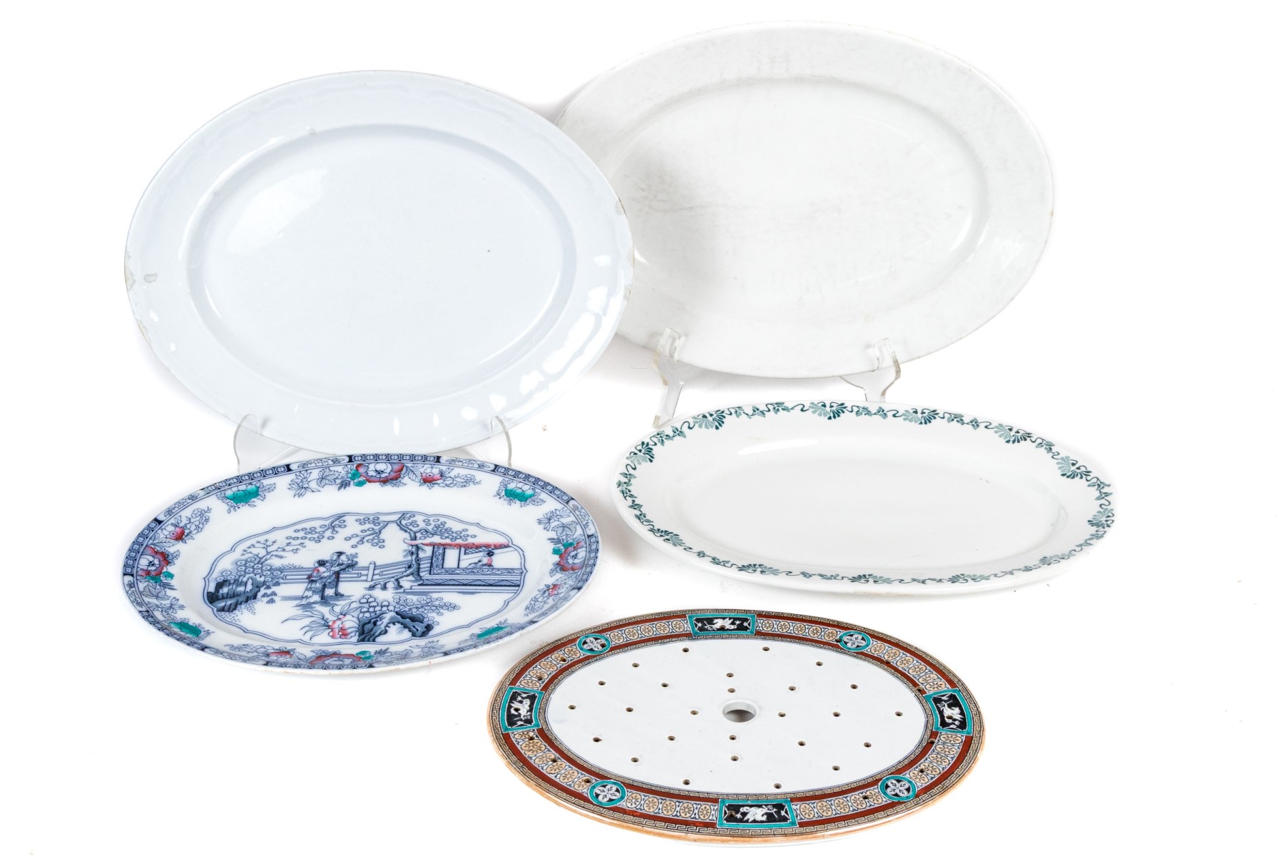 Comprised of one Chinese export style with central figural reserve in architectural garden, together with two white glazed plates and one pierced liner.