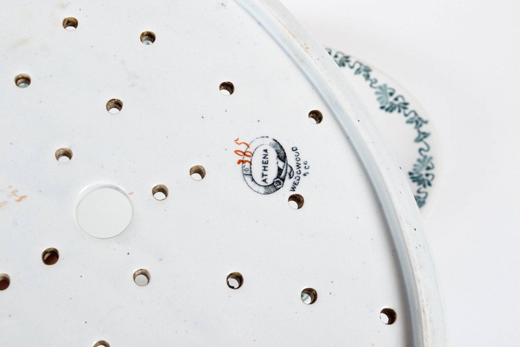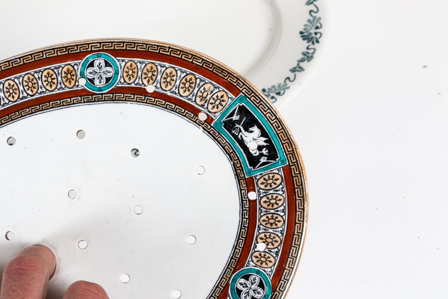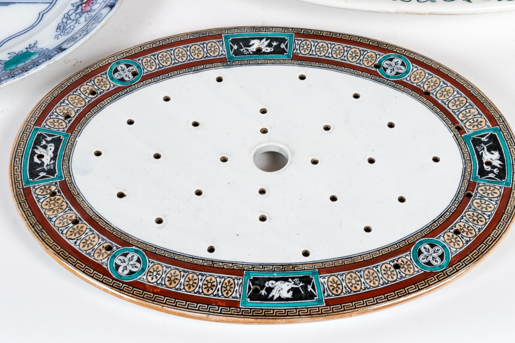 Comprised of one Chinese export style with central figural reserve in architectural garden, together with two white glazed plates and one pierced liner.