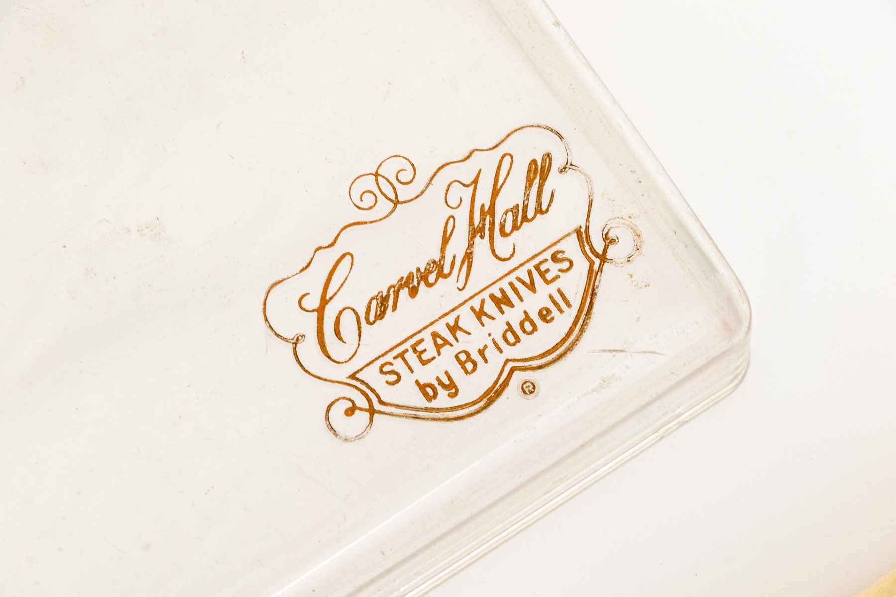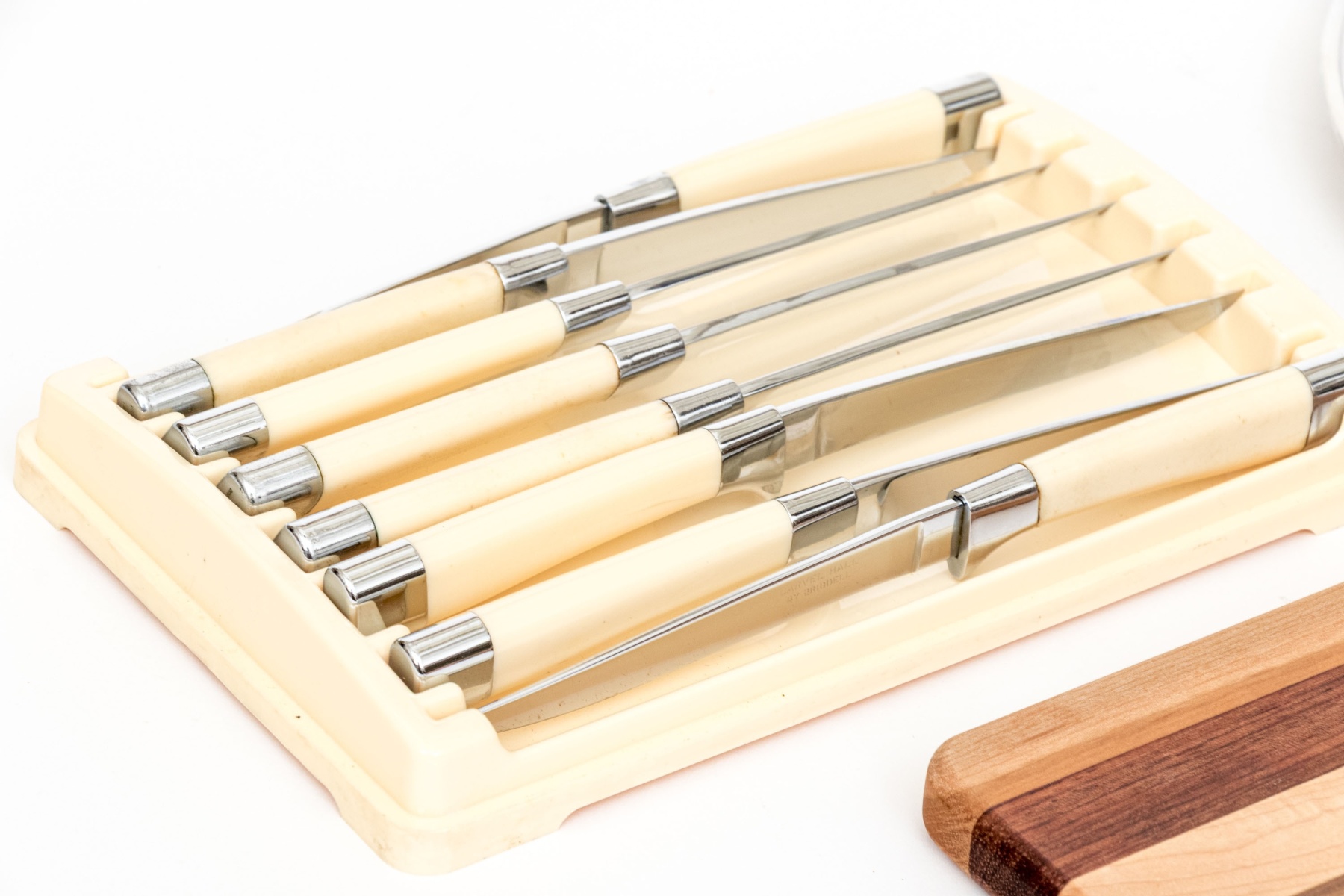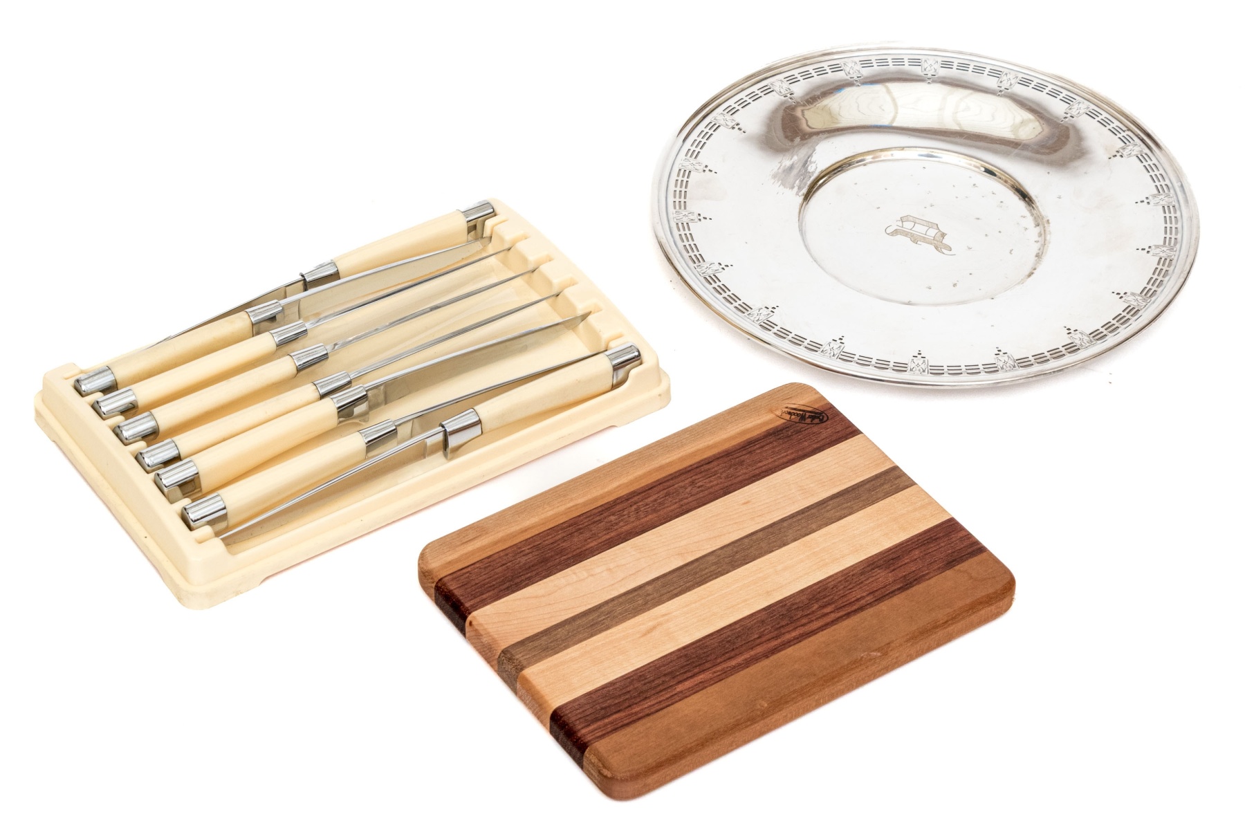 Comprised of a Butler's Woodworks diminutive butcher block, a monogrammed silver plated serving plate with a pierced motif to the outer rim, and set of eight Carvel Hall steak knives by Briddell.