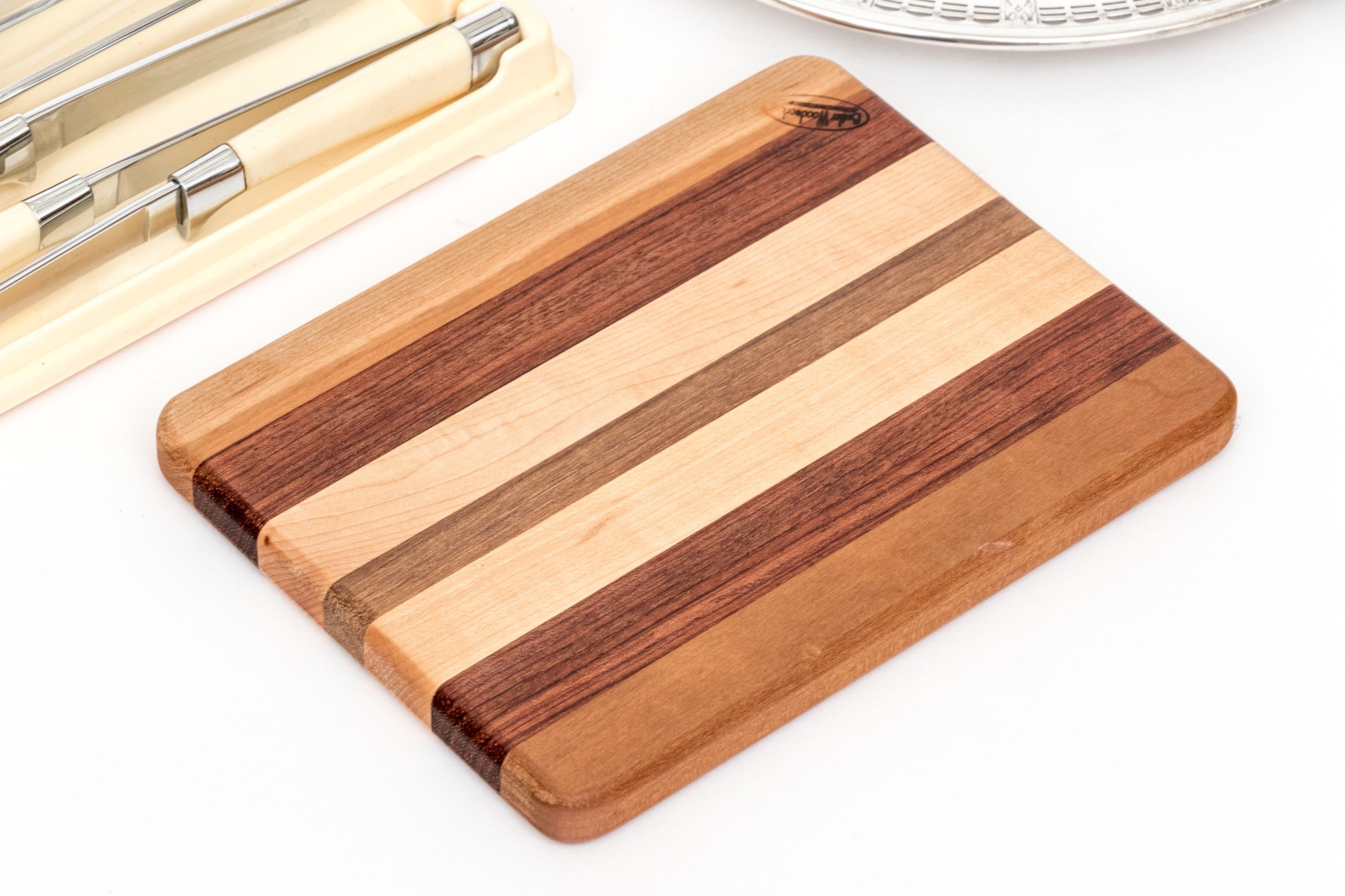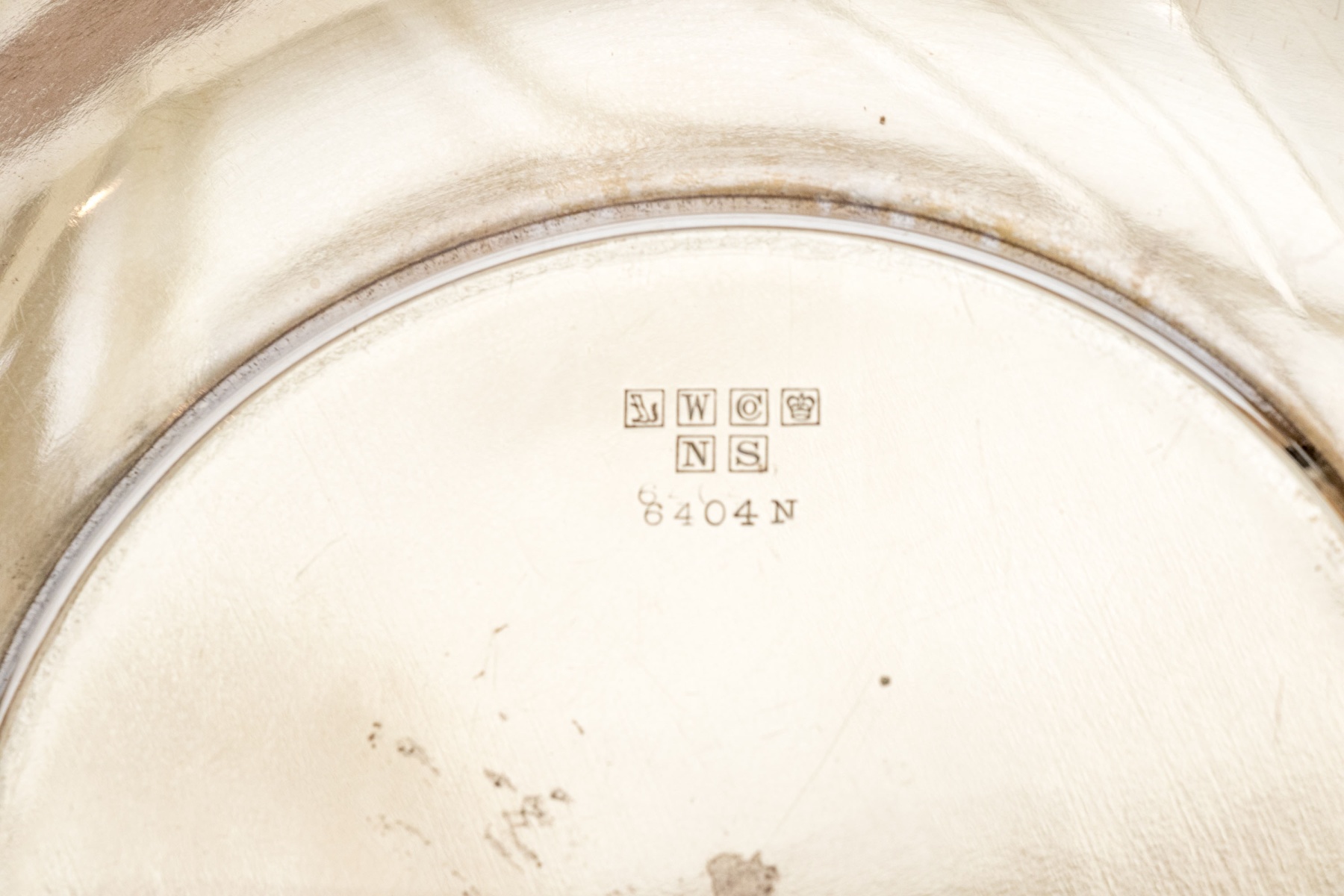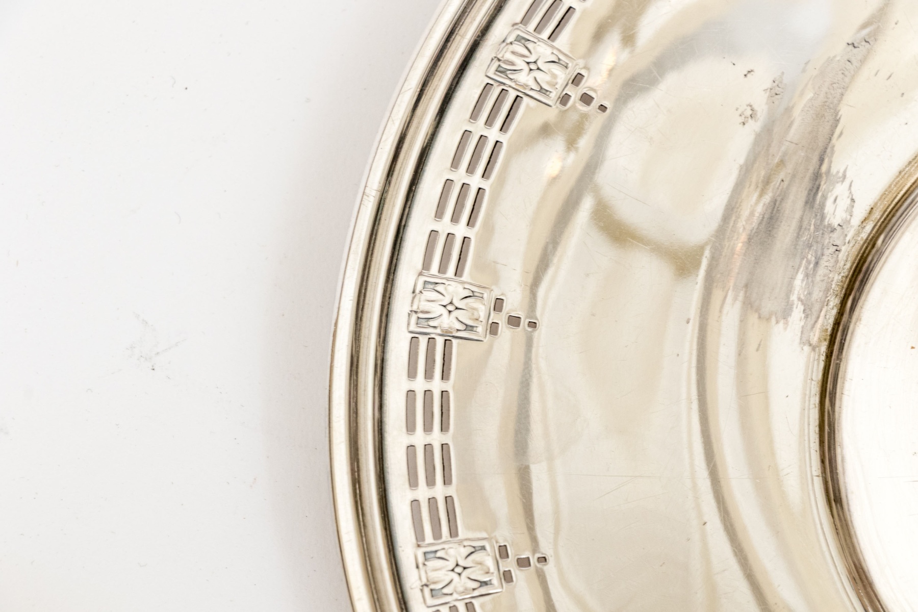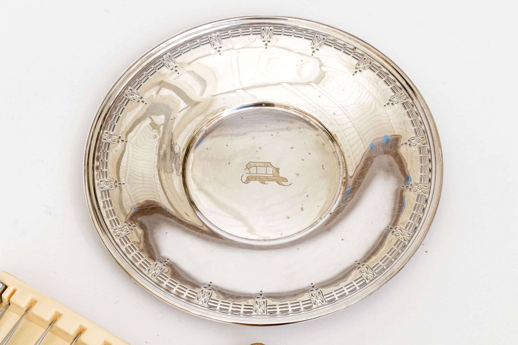 Comprised of a Butler's Woodworks diminutive butcher block, a monogrammed silver plated serving plate with a pierced motif to the outer rim, and set of eight Carvel Hall steak knives by Briddell.