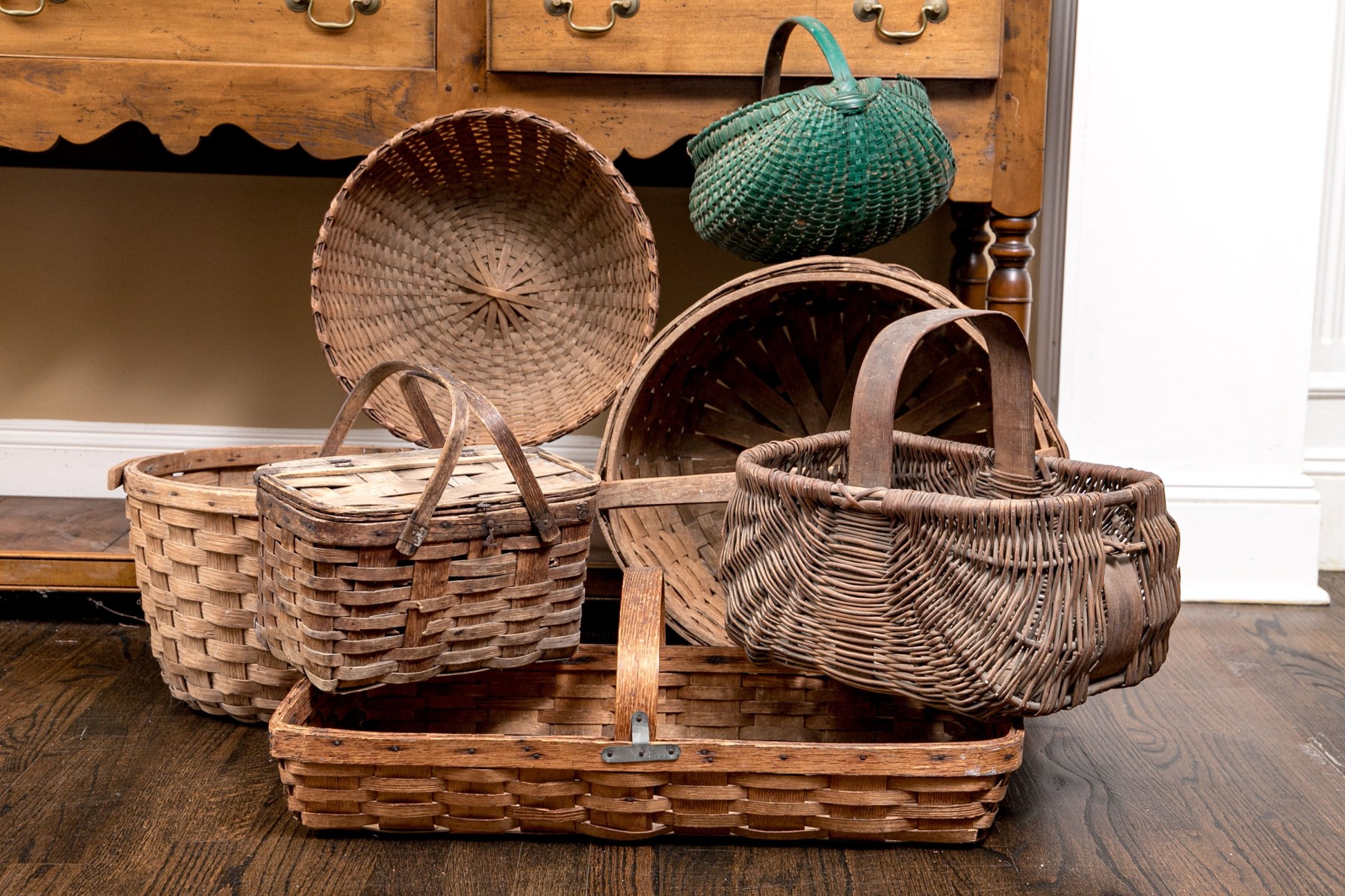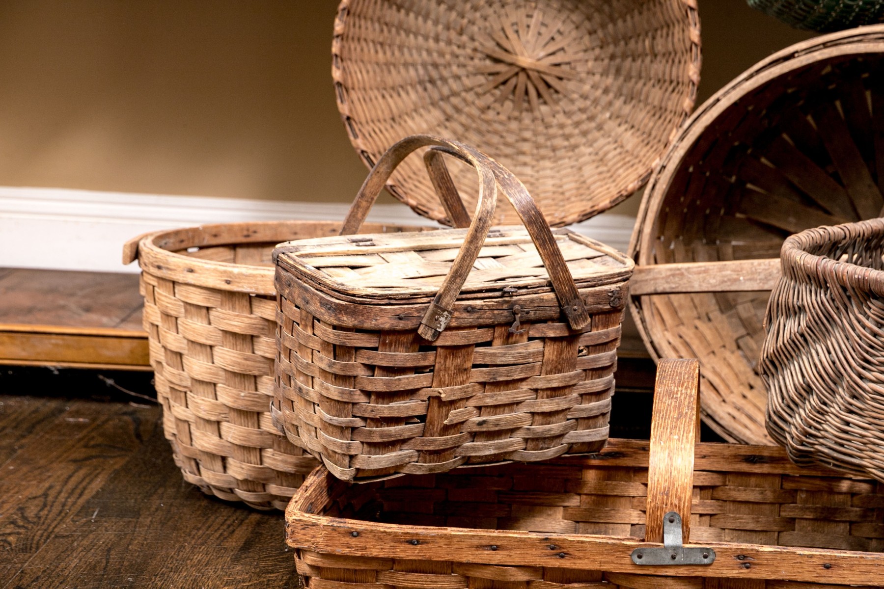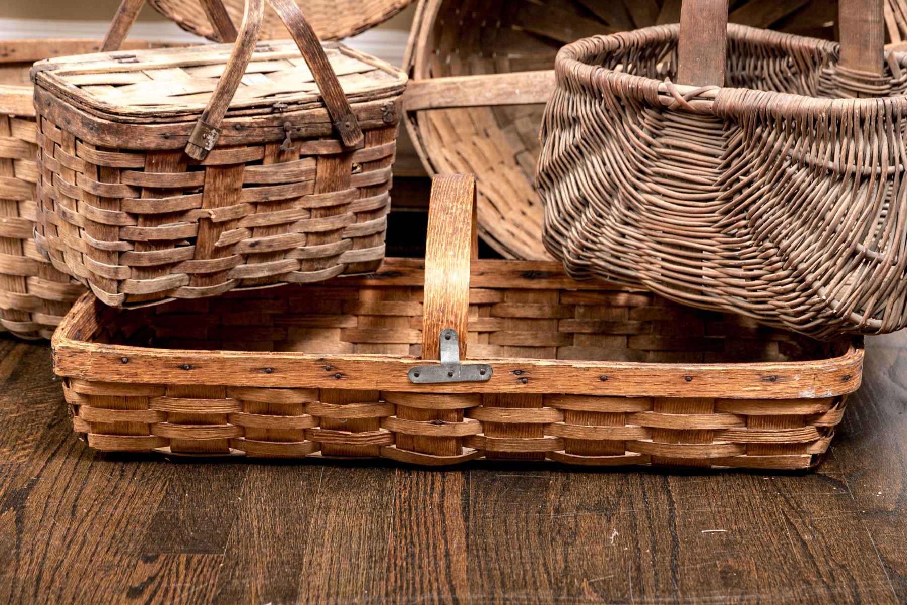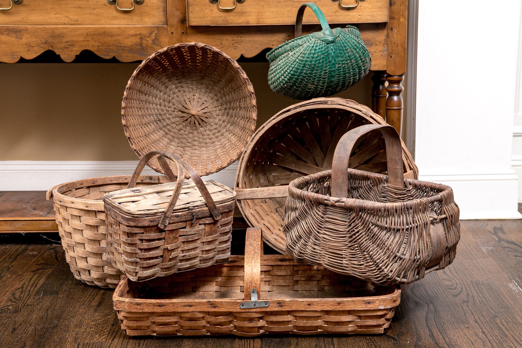 A wonderful collection of seven antique American woven baskets including oak splint baskets, a berry basket, and a fanny basket.