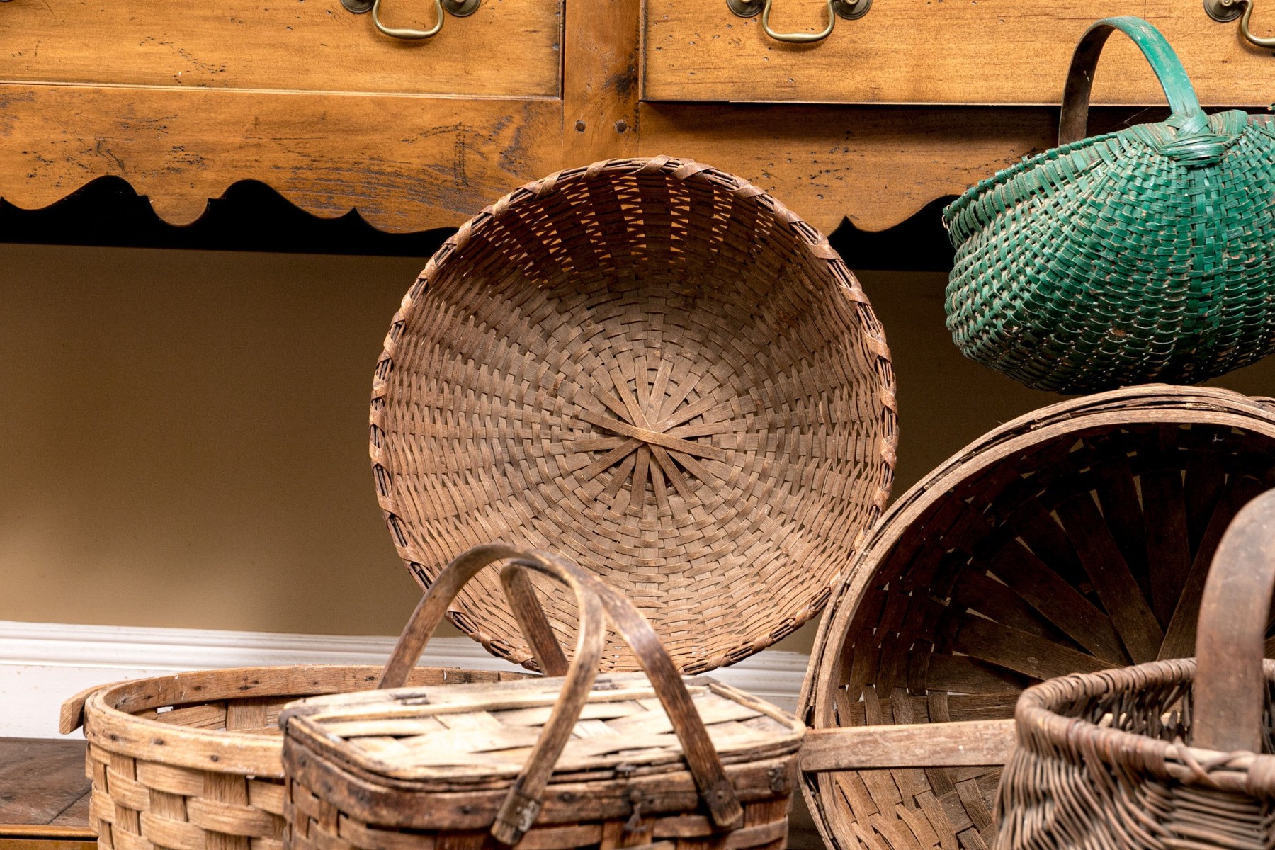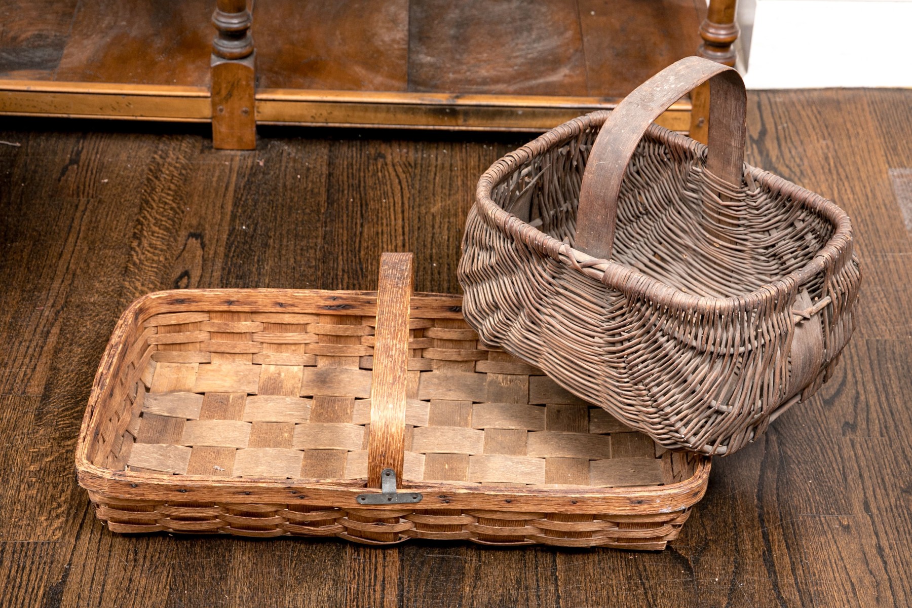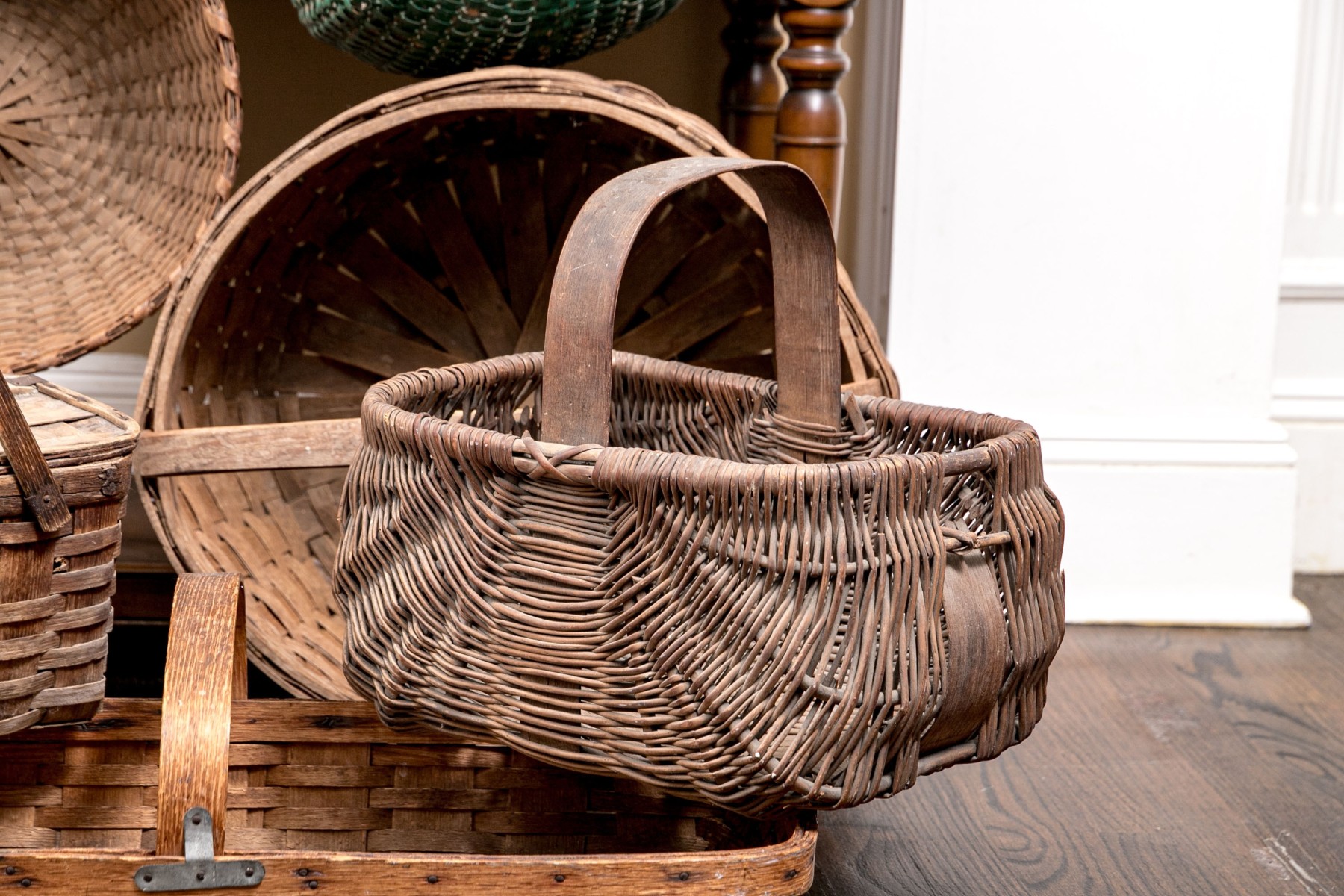 A wonderful collection of seven antique American woven baskets including oak splint baskets, a berry basket, and a fanny basket.