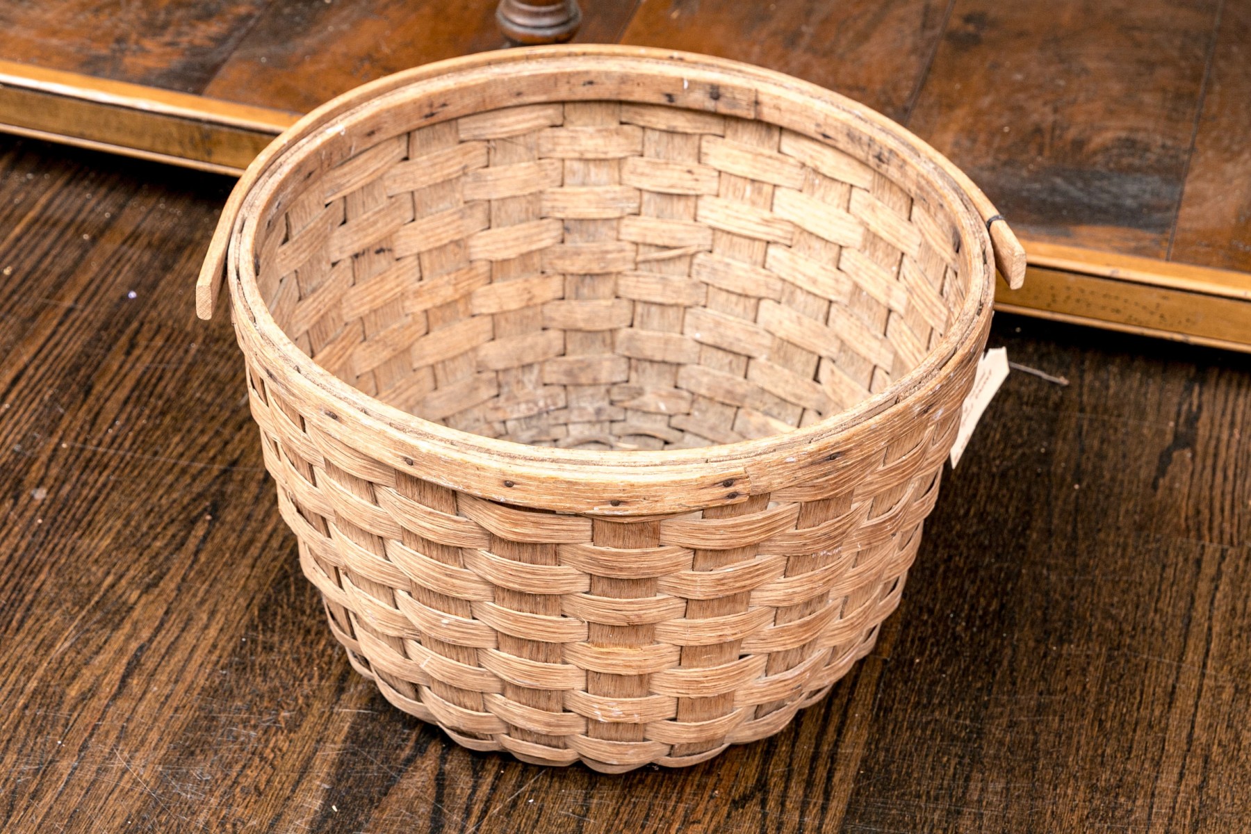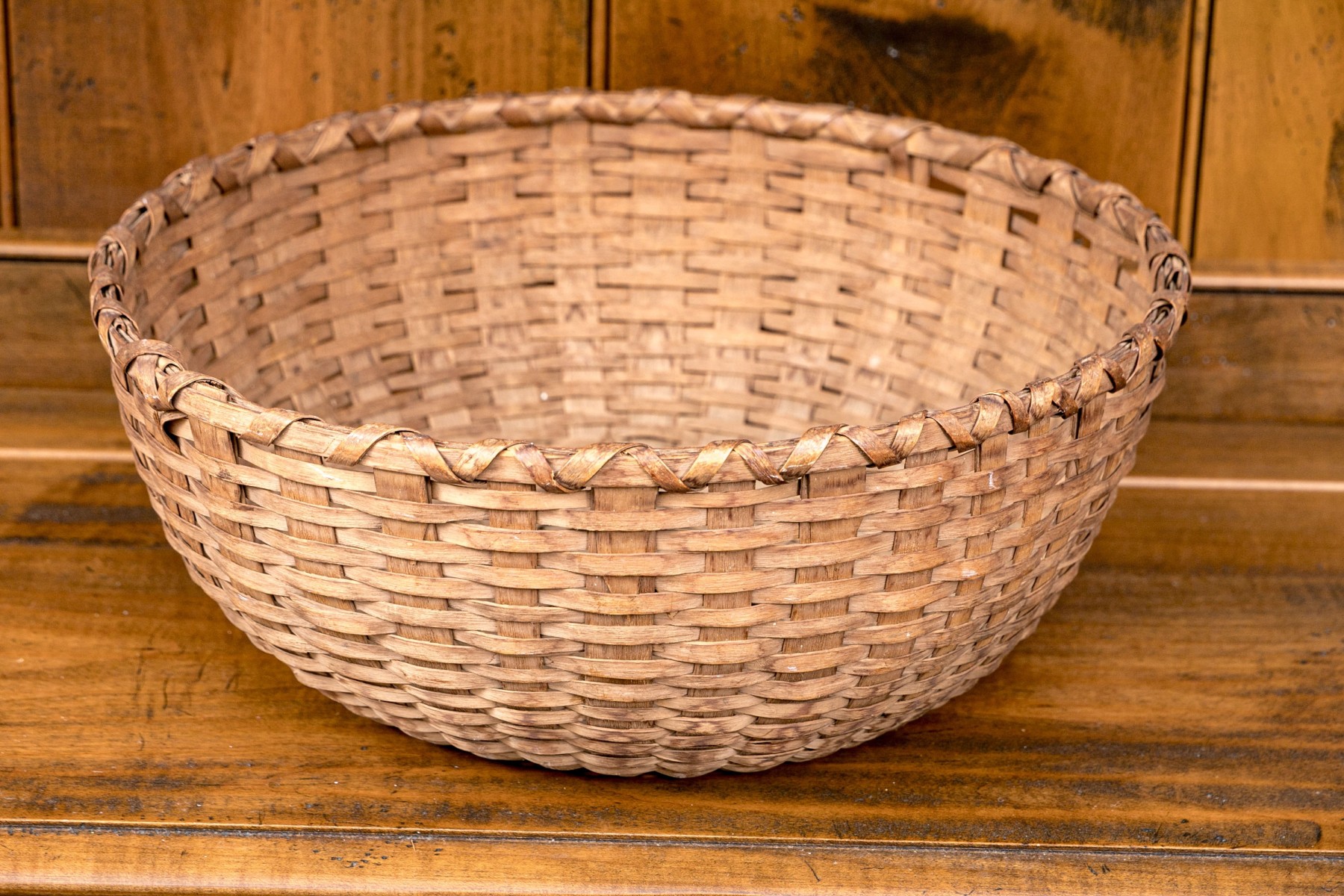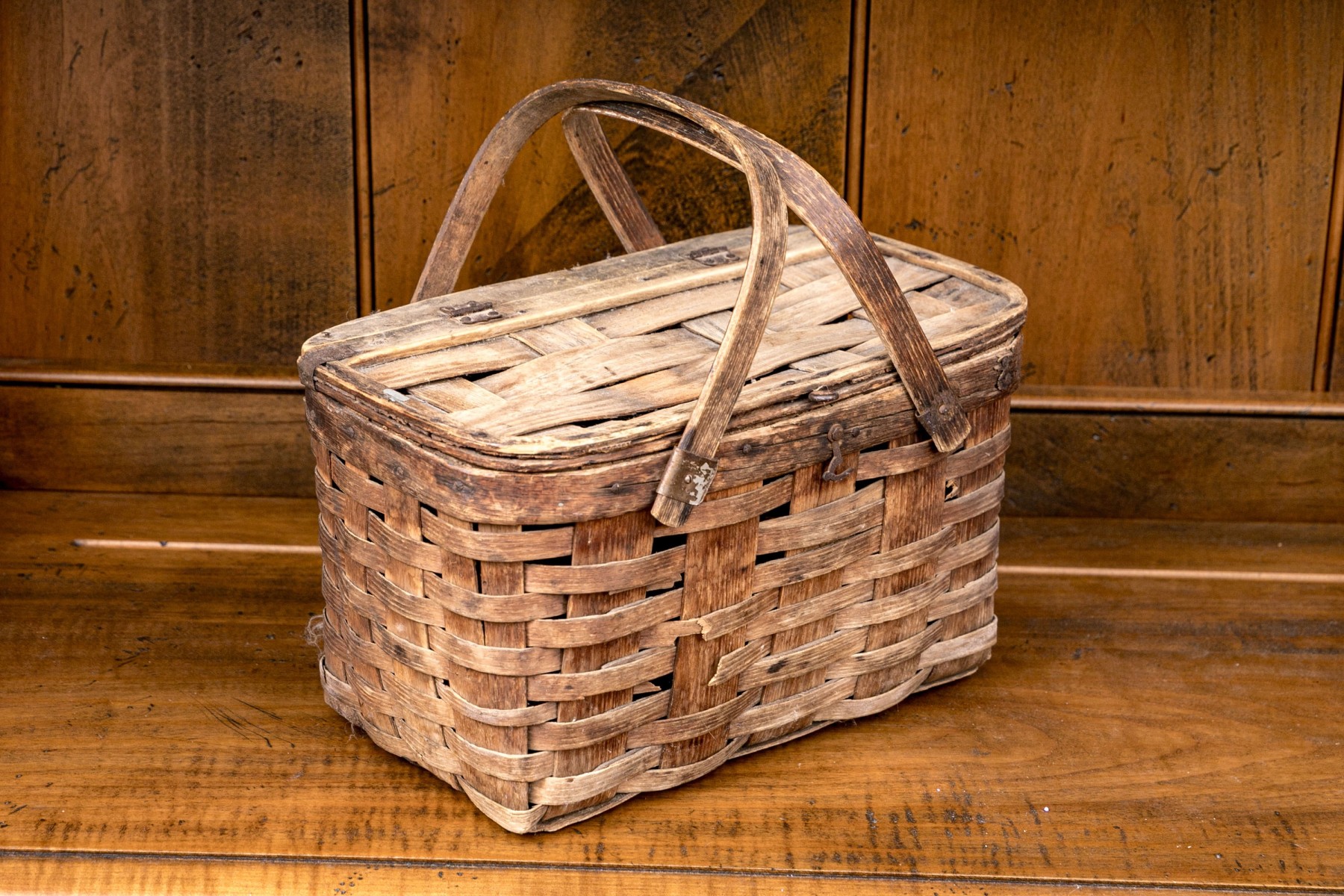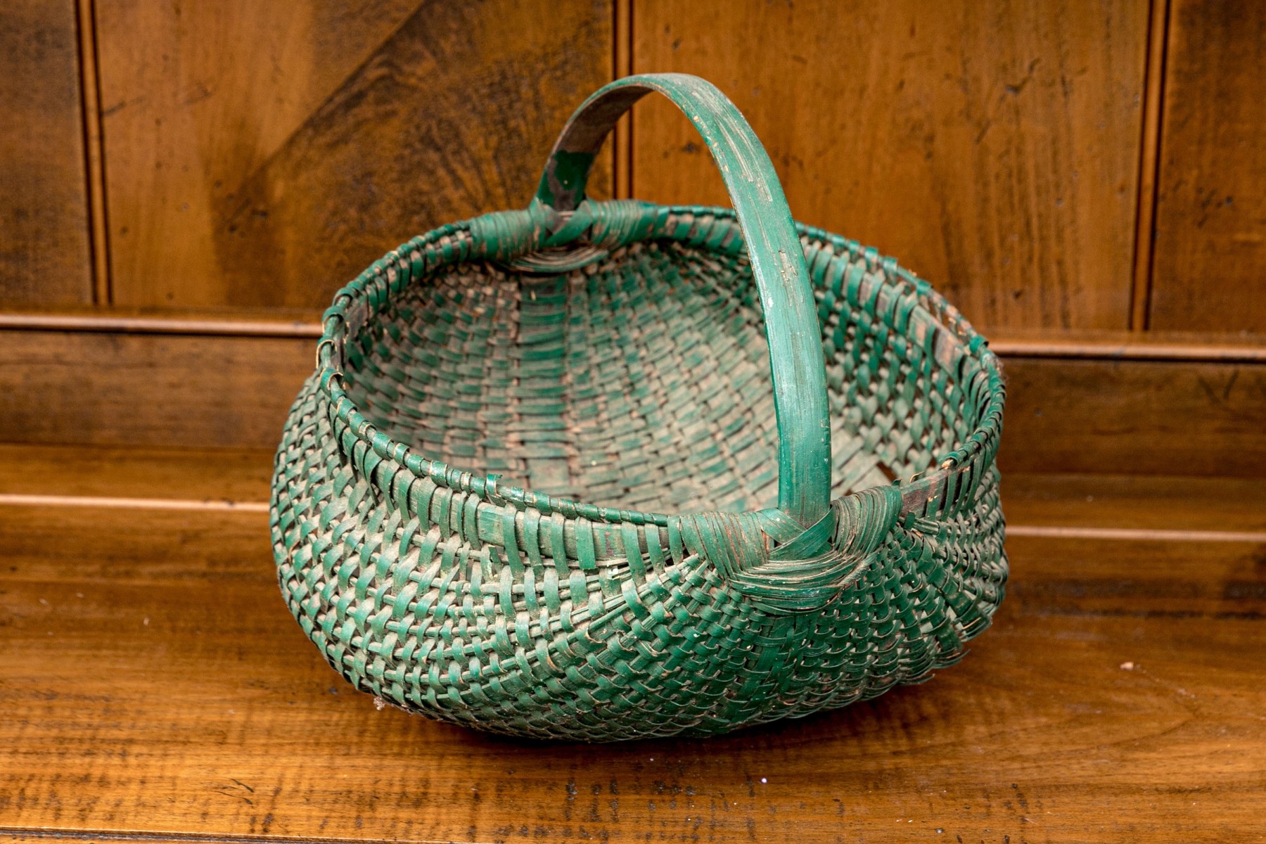 A wonderful collection of seven antique American woven baskets including oak splint baskets, a berry basket, and a fanny basket.