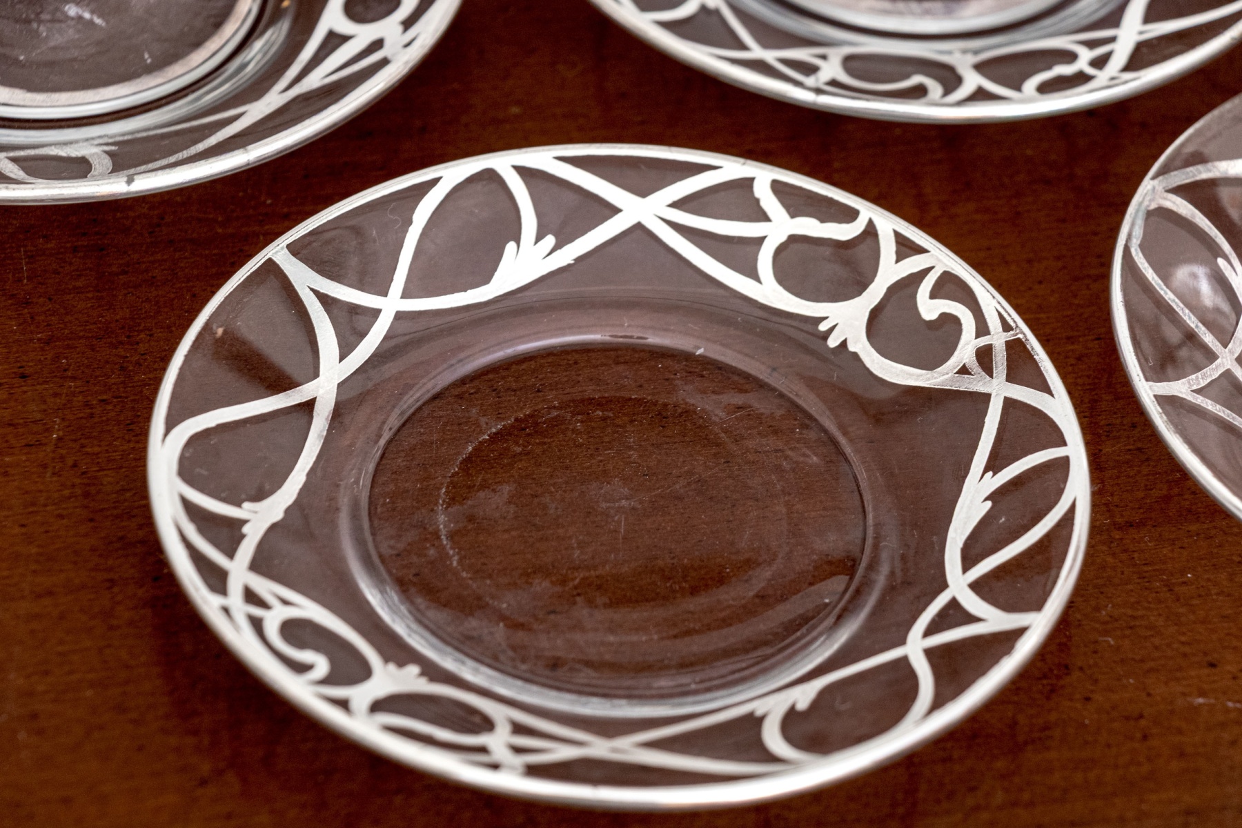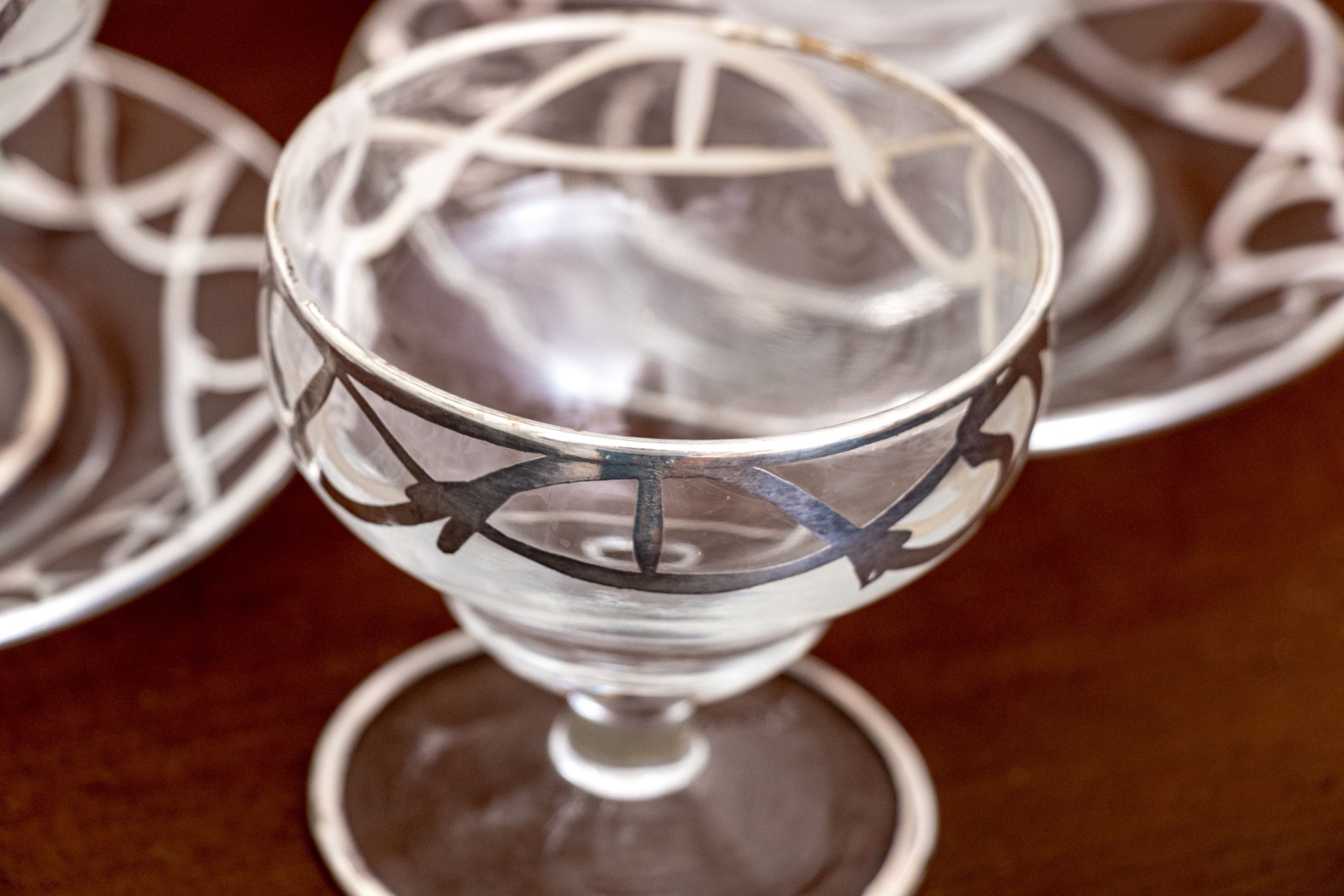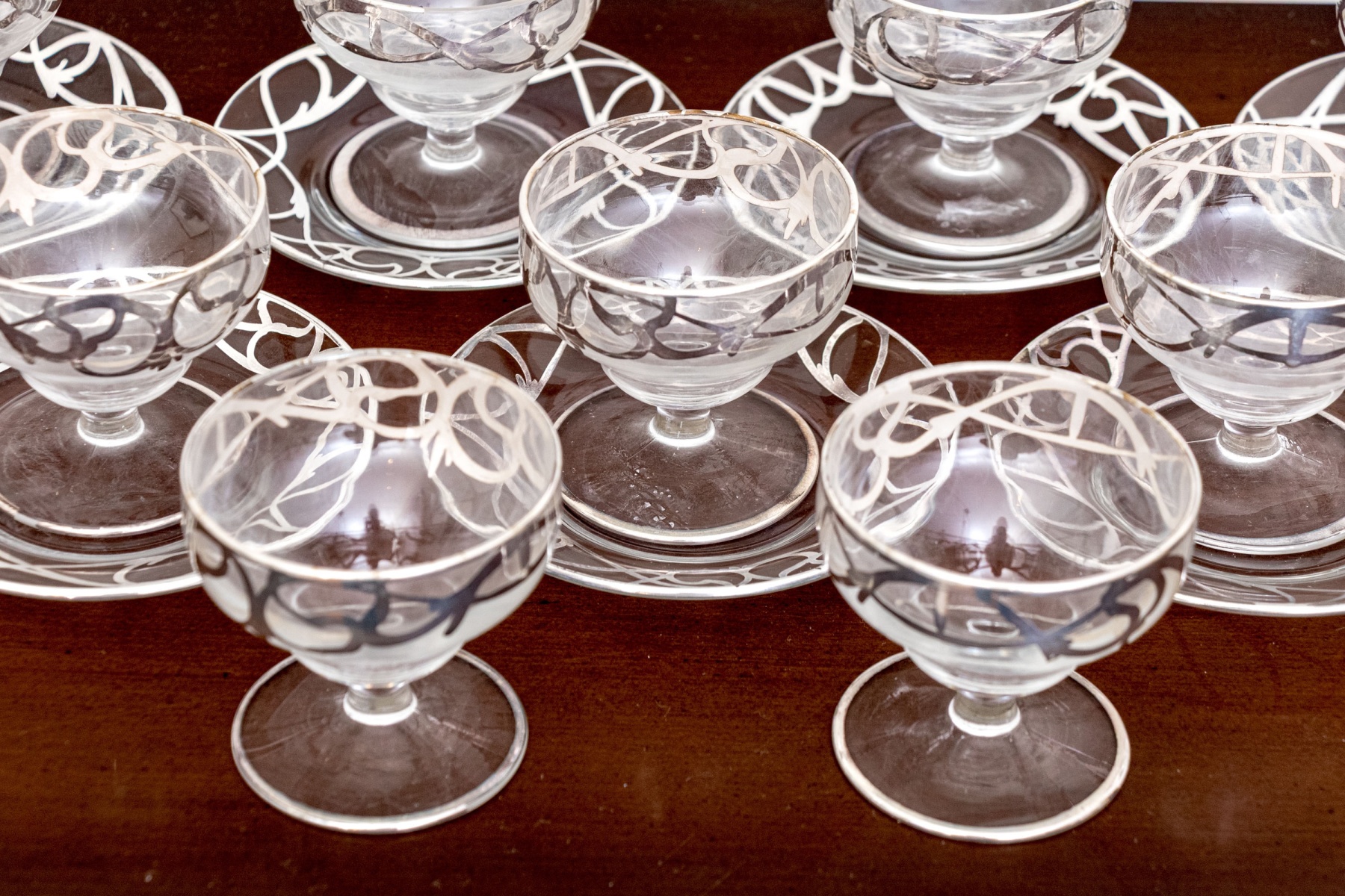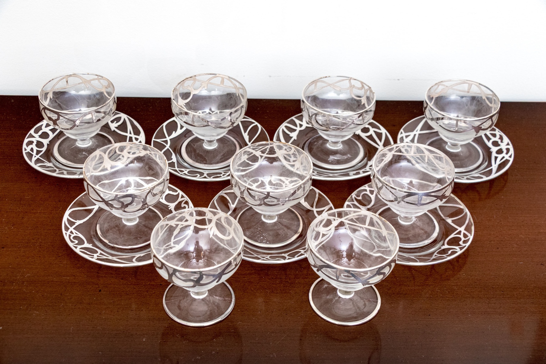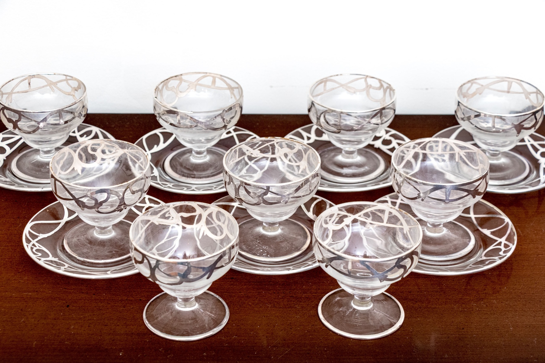 A wonderful collection of glassware comprised of nine sherbert footed glasses and seven saucers. Each with sleek forms overlaid with elegant silvered vine motifs.
