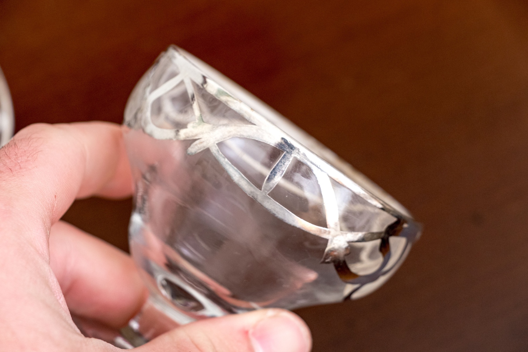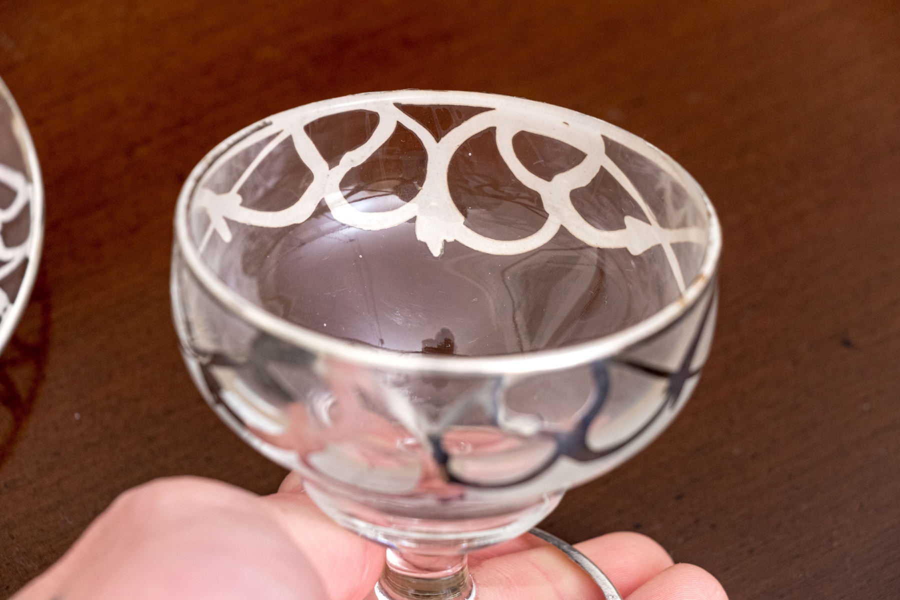 Some sherbet glasses with chipping to the mouth rim and wear to the metallic inlay finish. See lot photos.