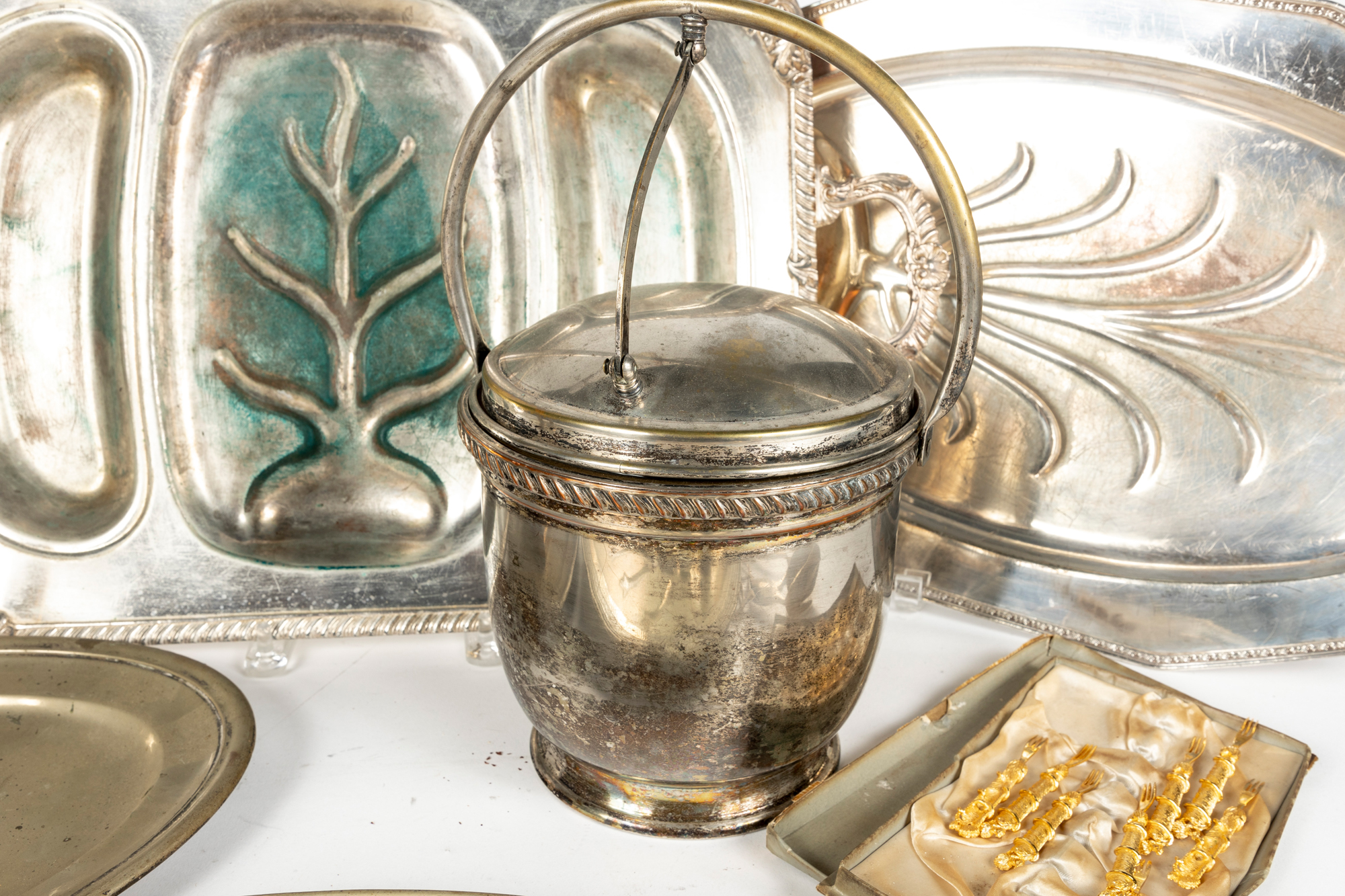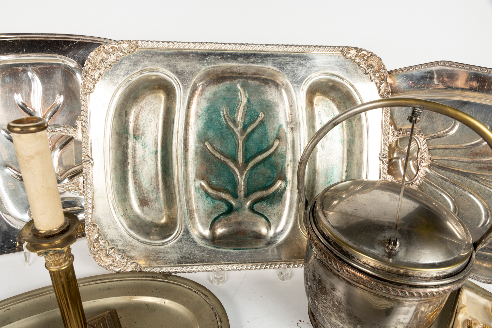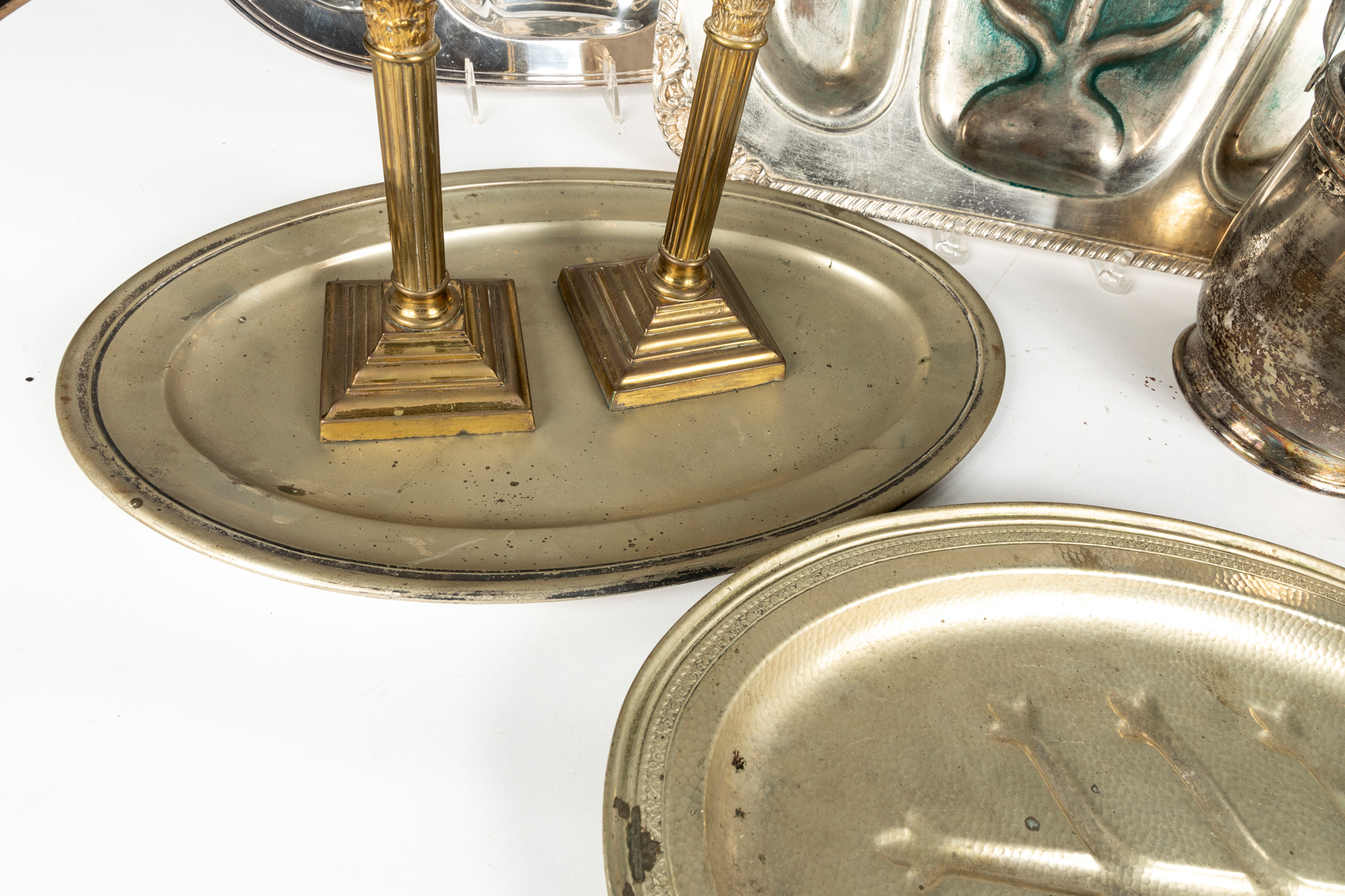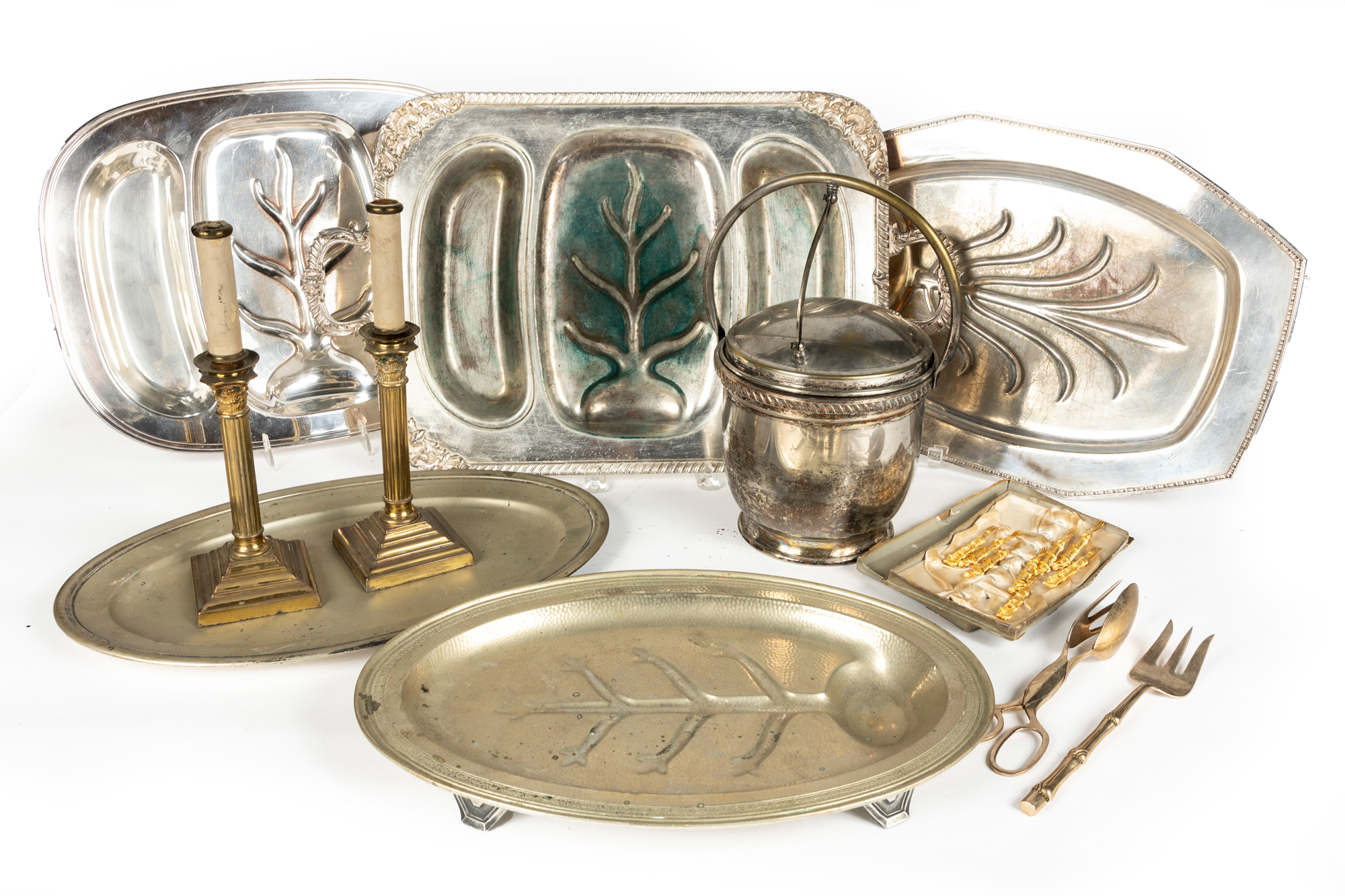 A collection of various silver plate and brass items such as trays, and ice bucket, brass candlesticks and more. All items need to be cleaned, may have signs of wear and use with scratches, tarnishing or denting. The box to the gold tone Florentine forks has water damage. Largest item measures (leaf tray with handles) - 24"L x 14"W