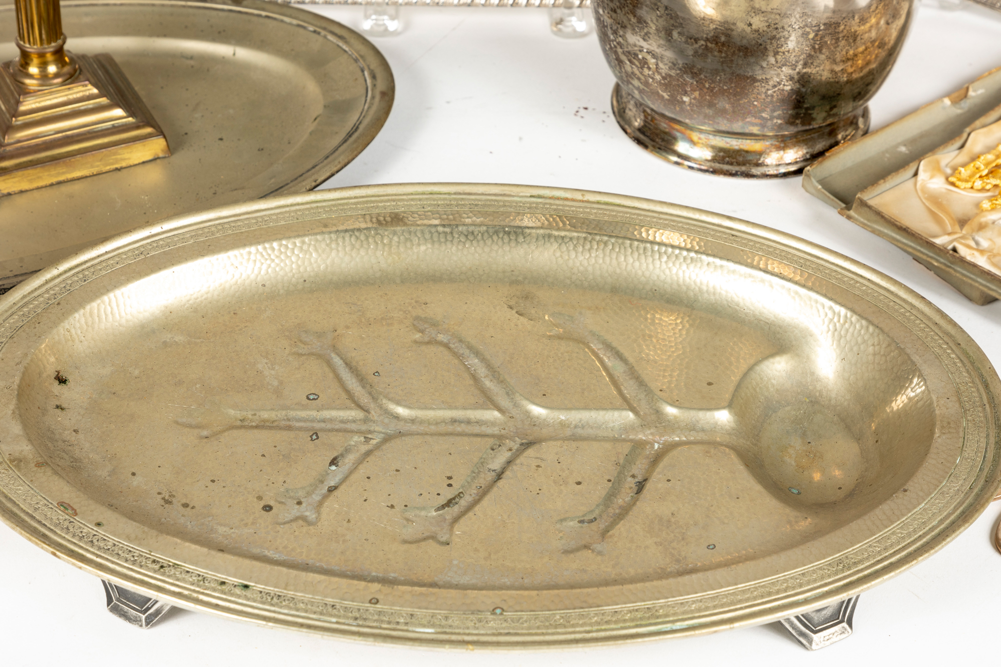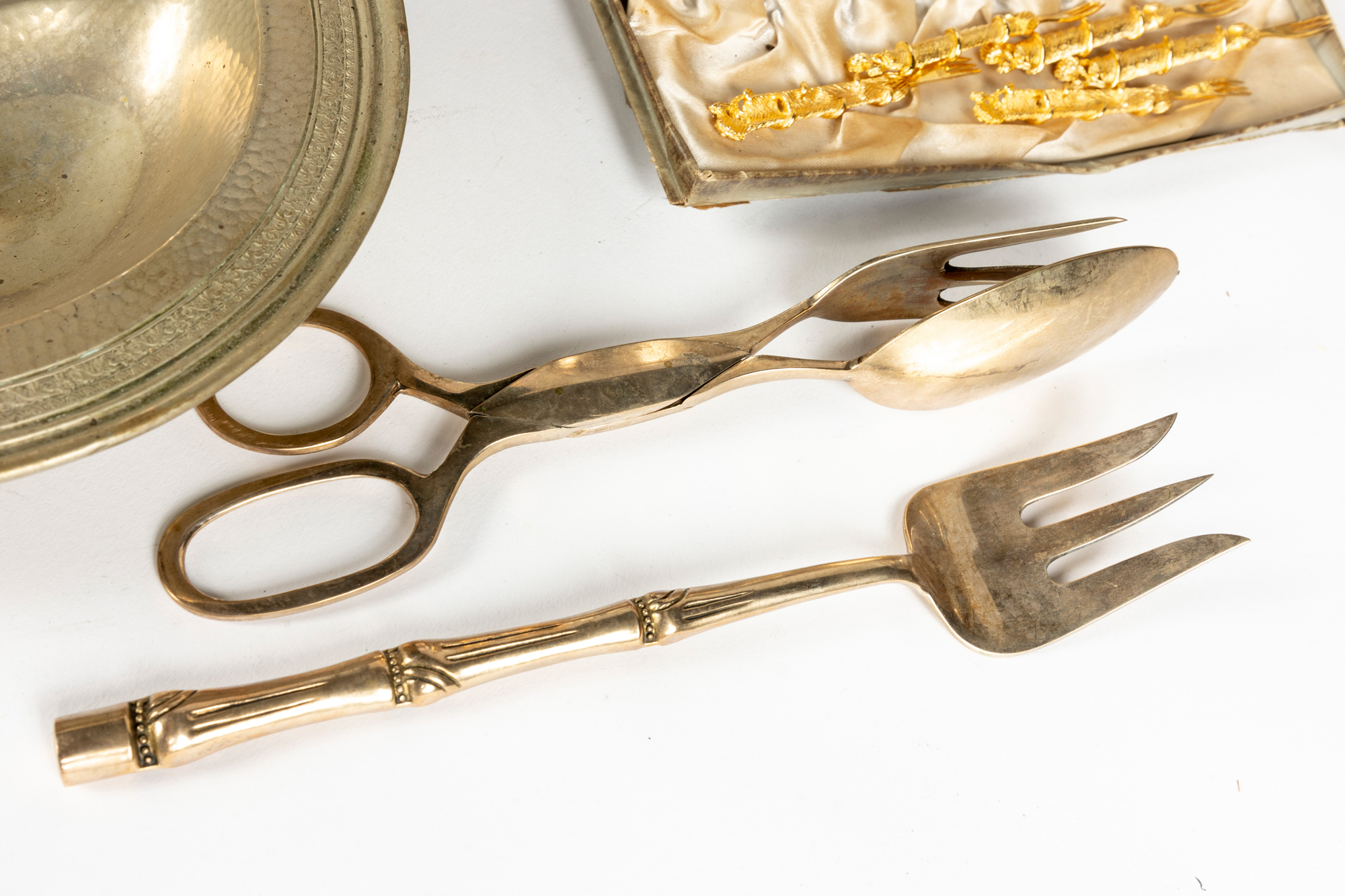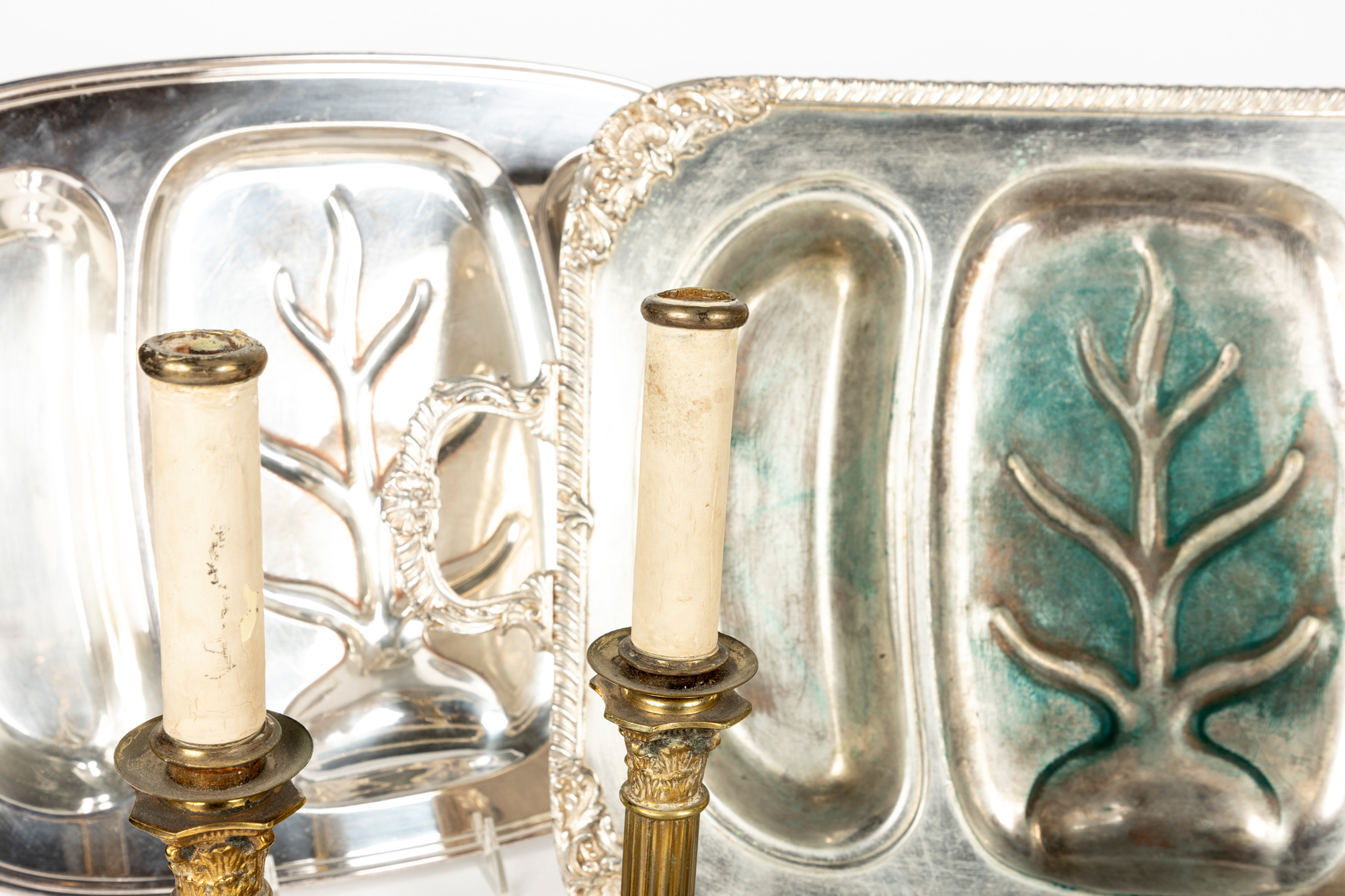 A collection of various silver plate and brass items such as trays, and ice bucket, brass candlesticks and more. All items need to be cleaned, may have signs of wear and use with scratches, tarnishing or denting. The box to the gold tone Florentine forks has water damage. Largest item measures (leaf tray with handles) - 24"L x 14"W