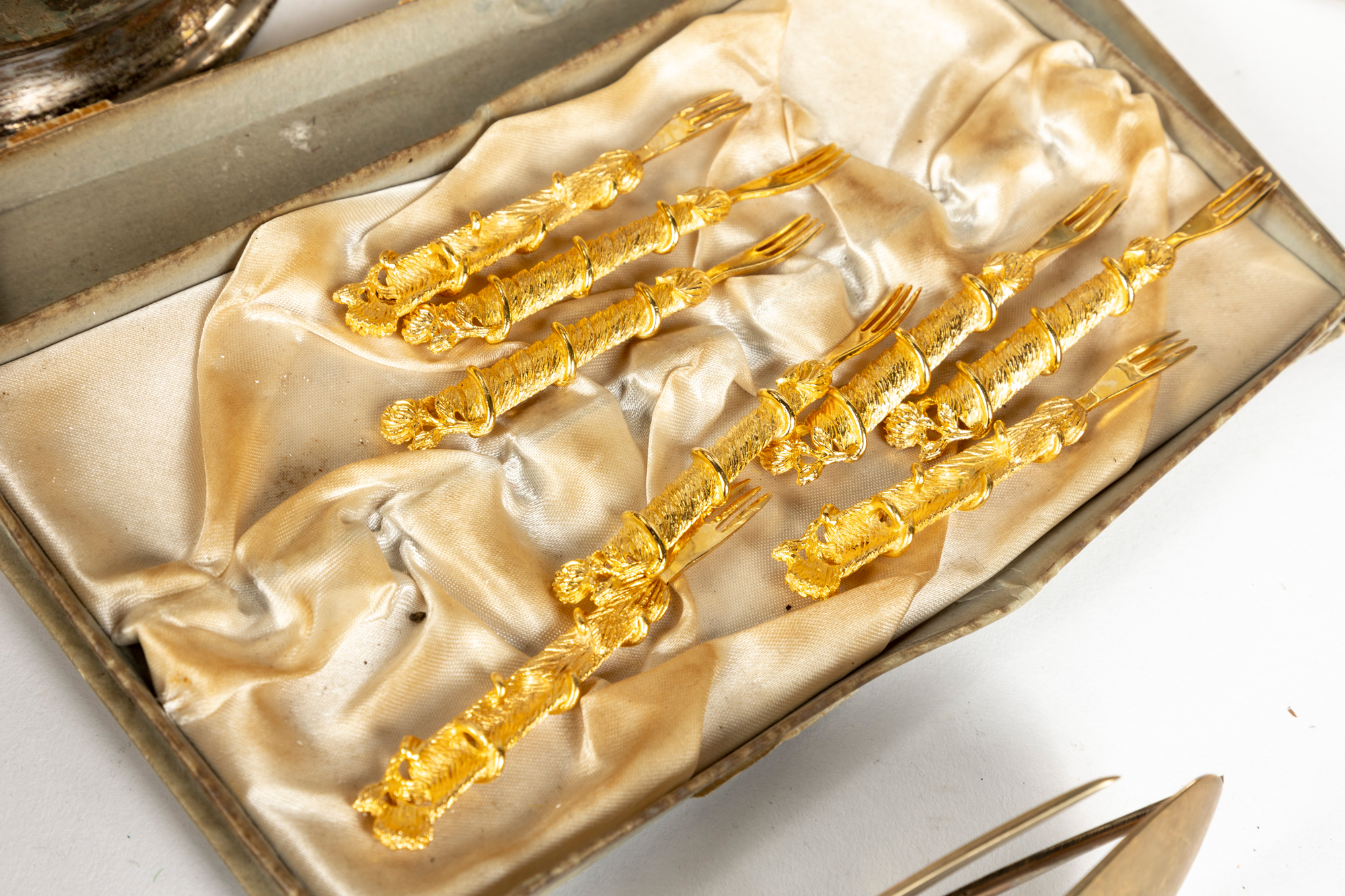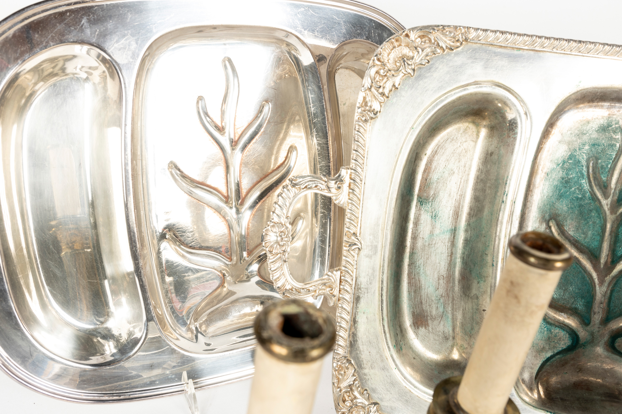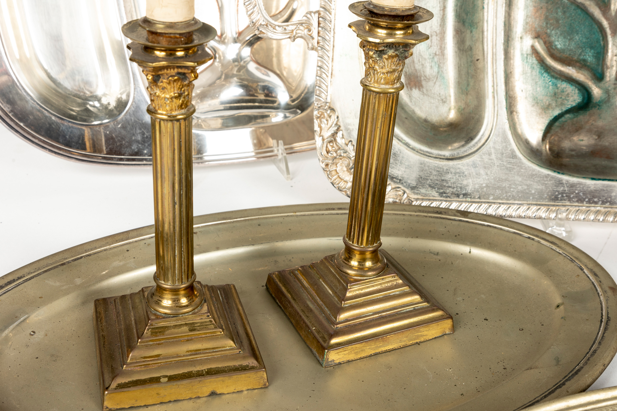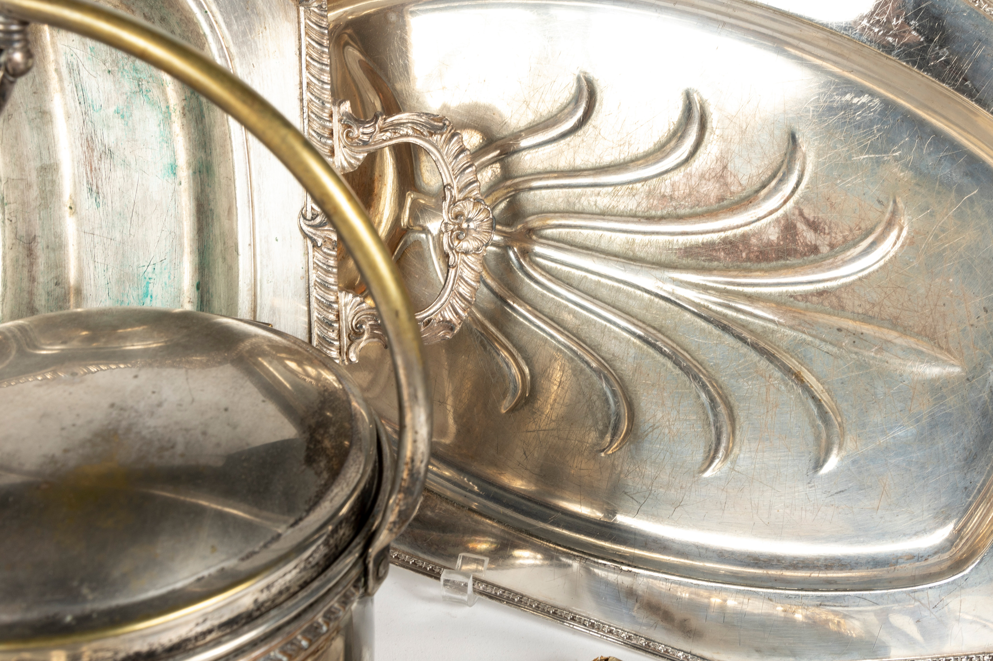 A collection of various silver plate and brass items such as trays, and ice bucket, brass candlesticks and more. All items need to be cleaned, may have signs of wear and use with scratches, tarnishing or denting. The box to the gold tone Florentine forks has water damage. Largest item measures (leaf tray with handles) - 24"L x 14"W