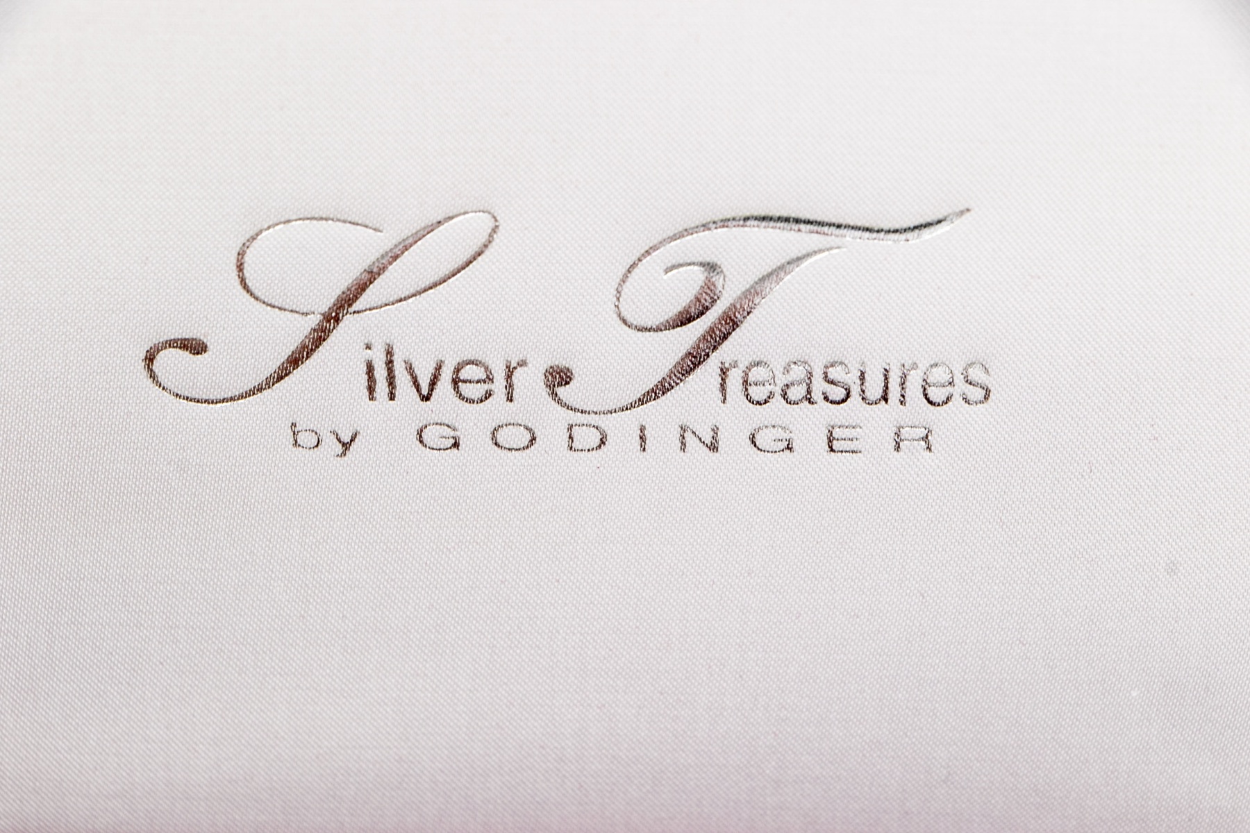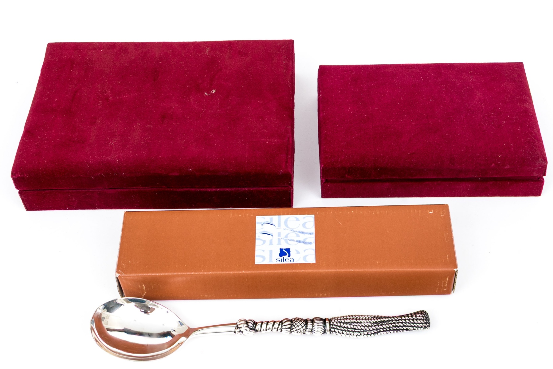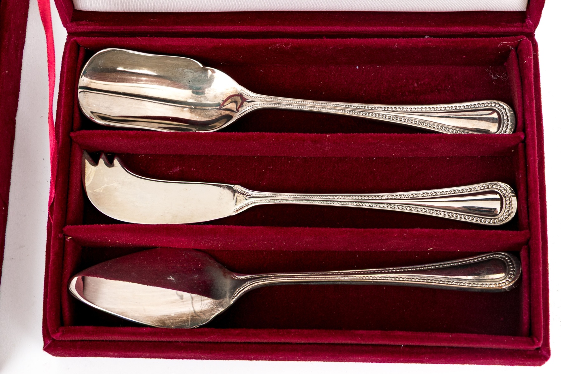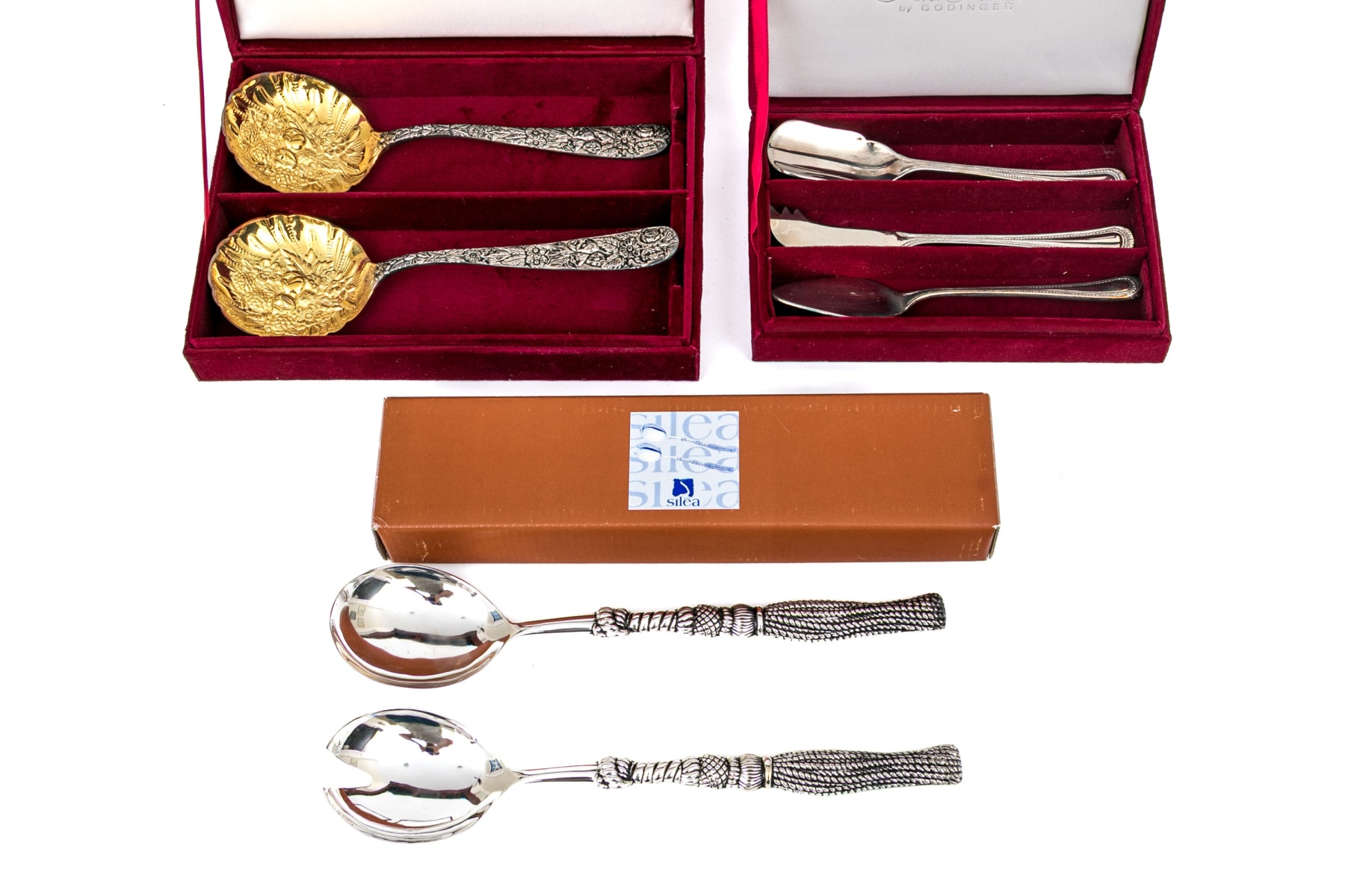 Comprised of a set of two salad servers, pair of Godinger serving spoons with gilt bowls, along with three cheese serving pieces. Two groups with red felt cases marked Silver Treasures by Godinger.