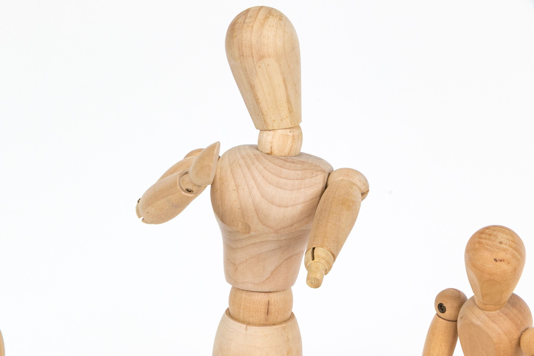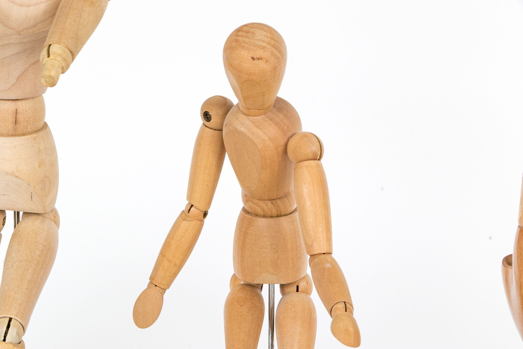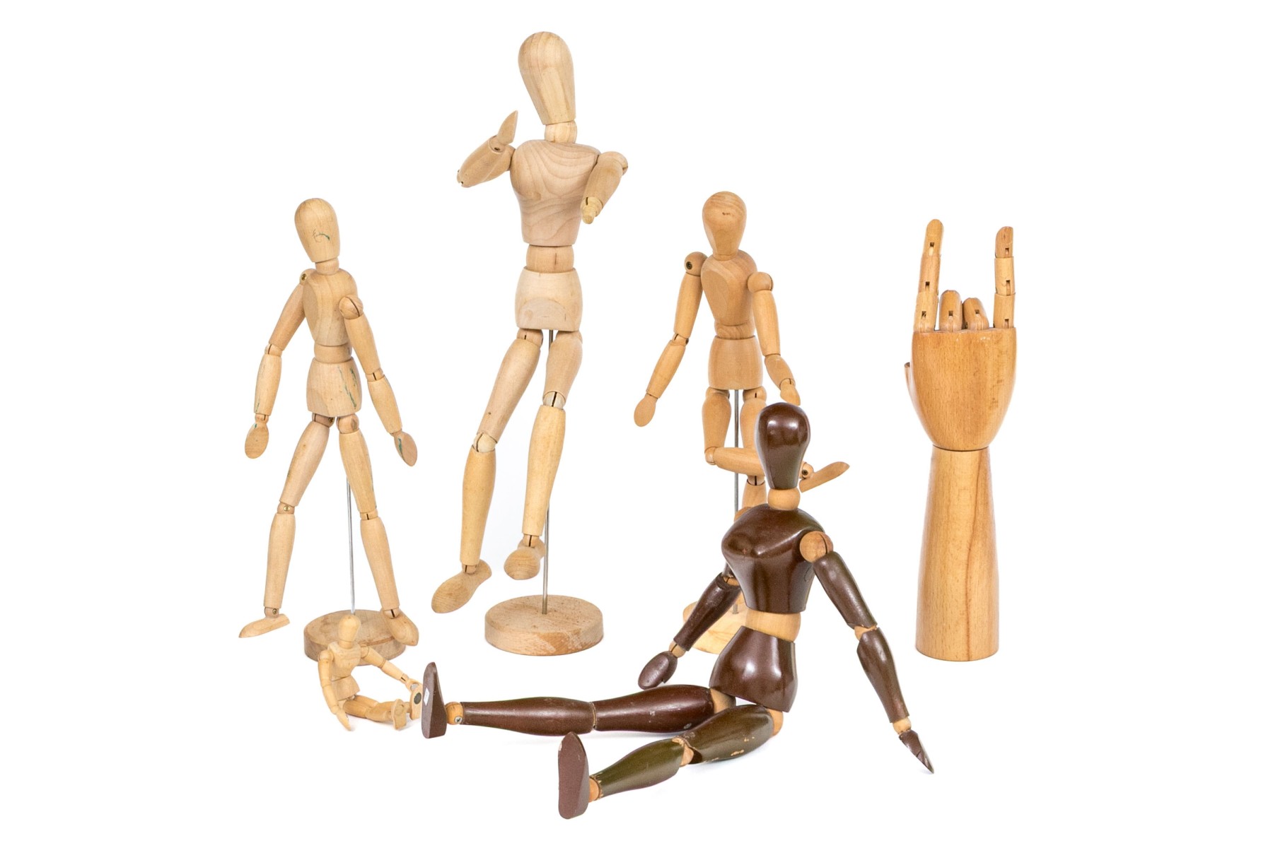 A great collection of six articulated models including five mannequins of various sizes and finishes, and one hand.