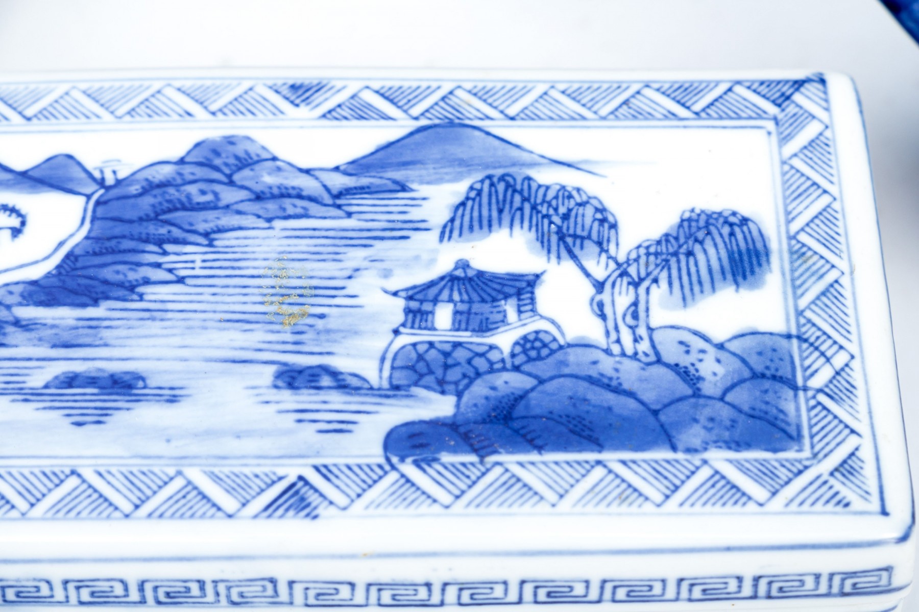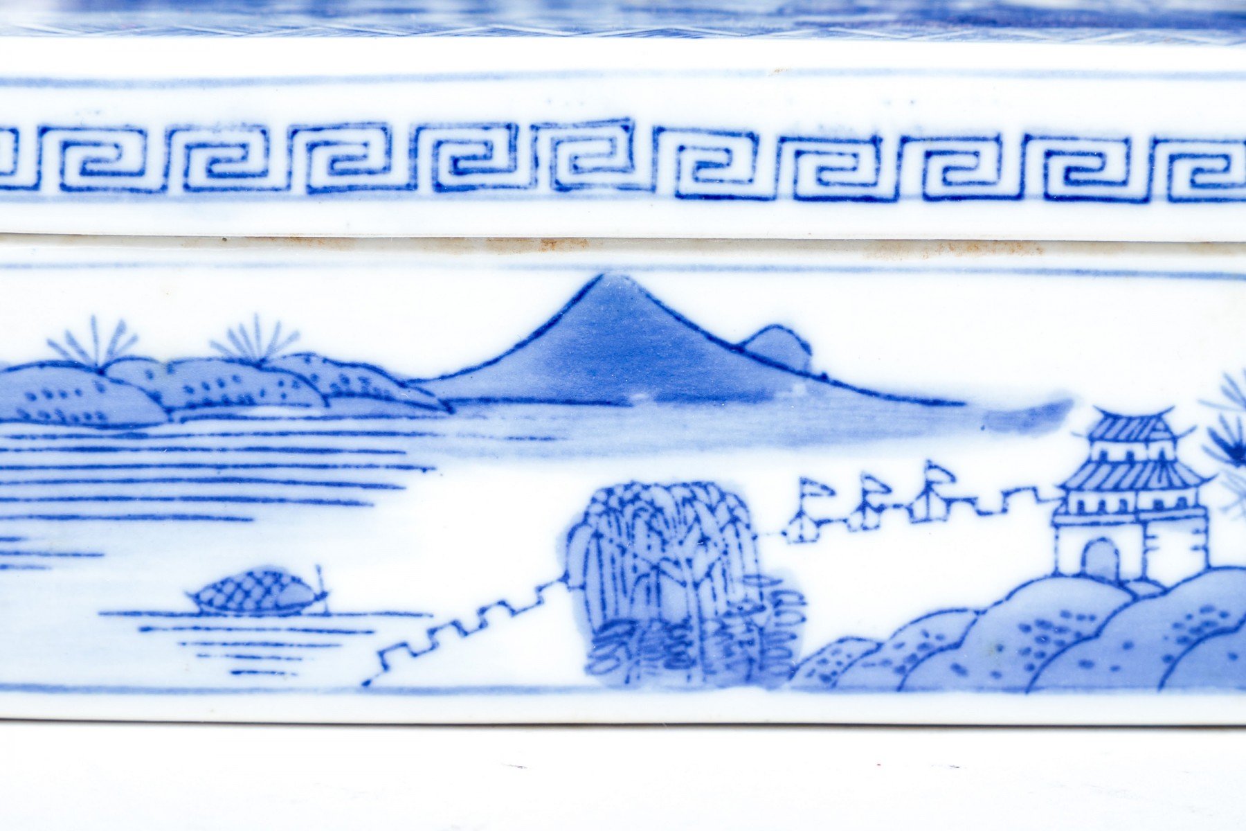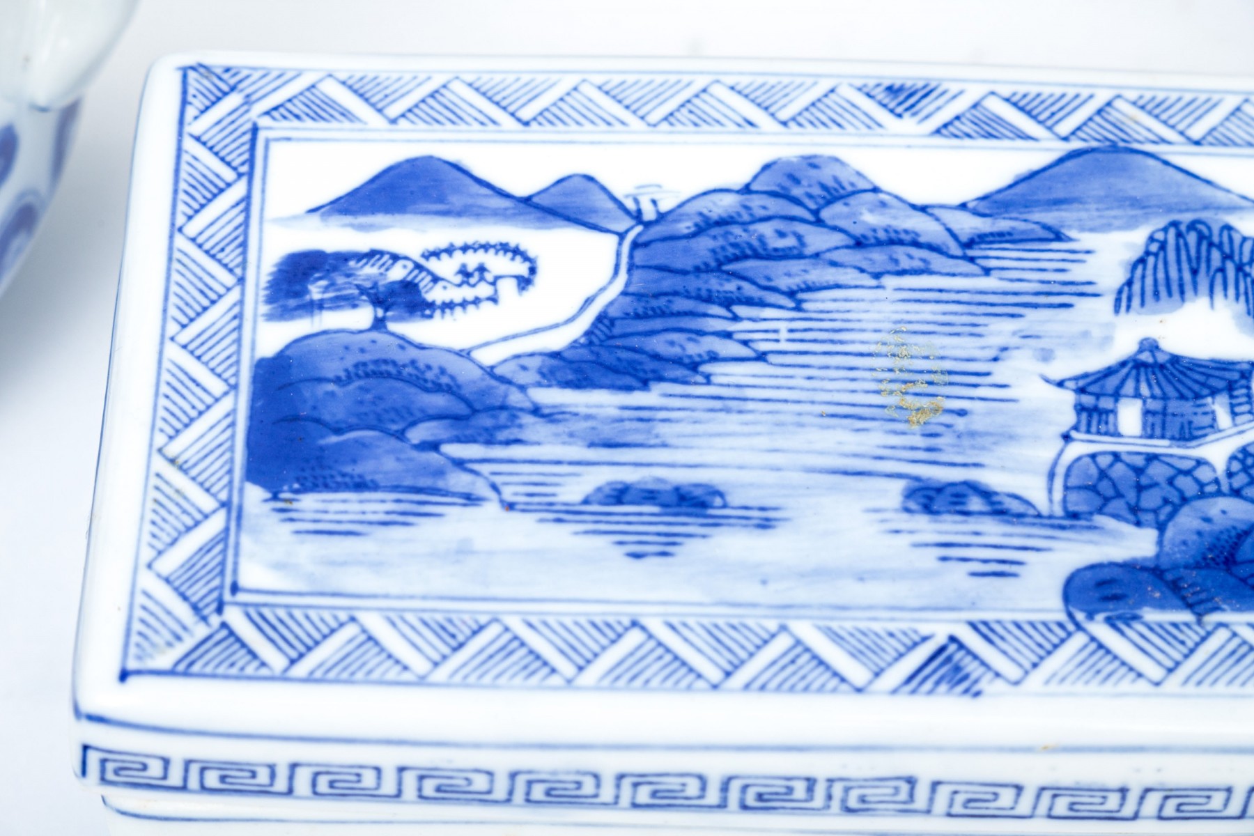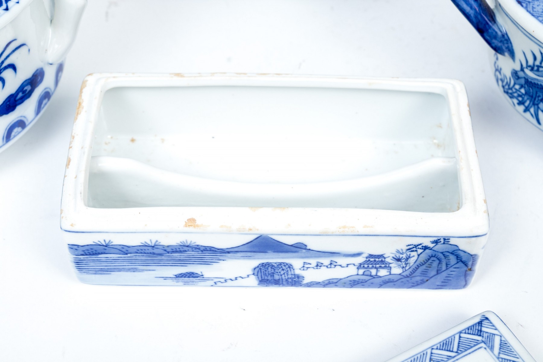 Including five blue and white: an oval lidded tureen with foliate decoration