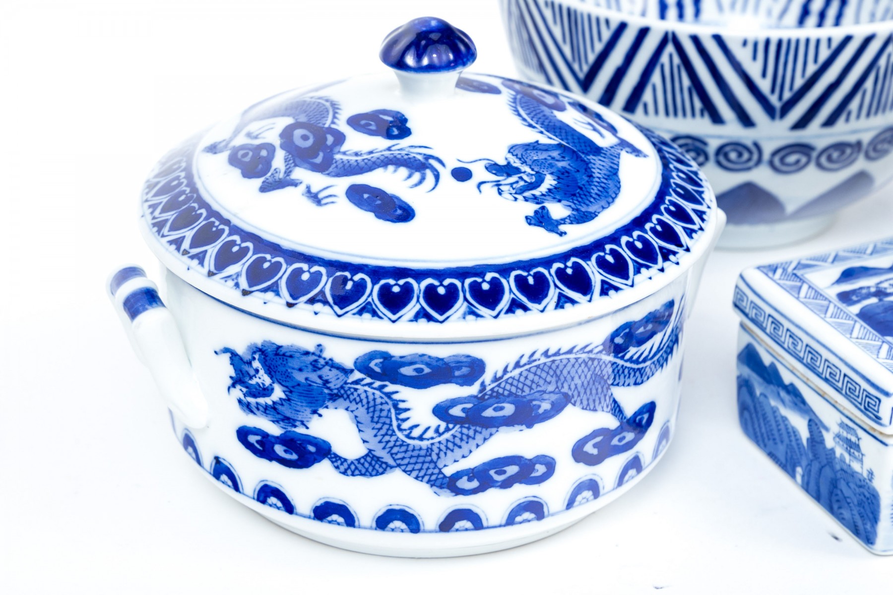 a circular tureen with dragons