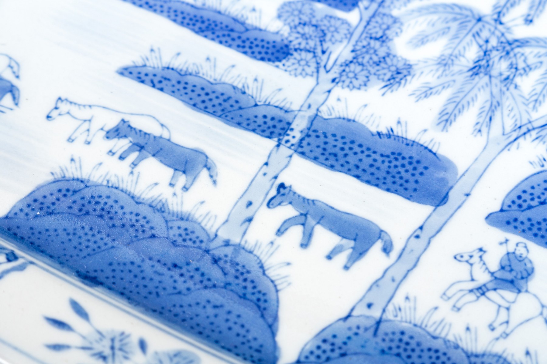 a rectangular tray with animals and a horseman in a landscape