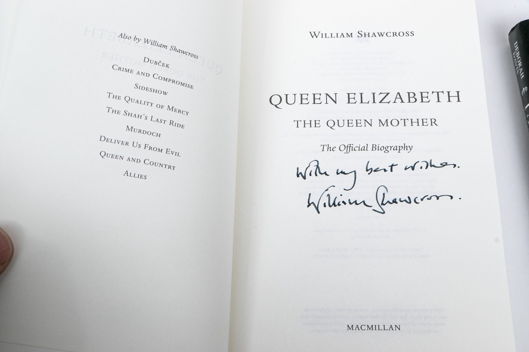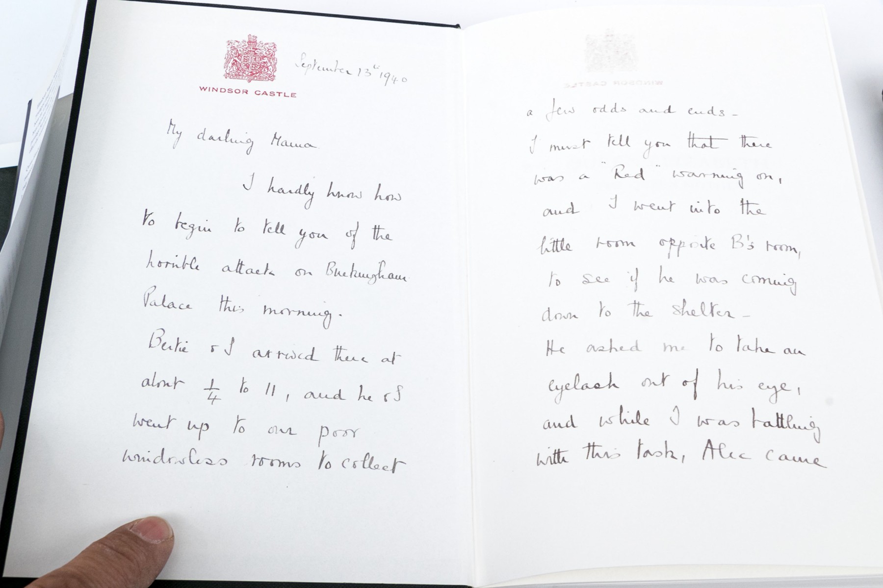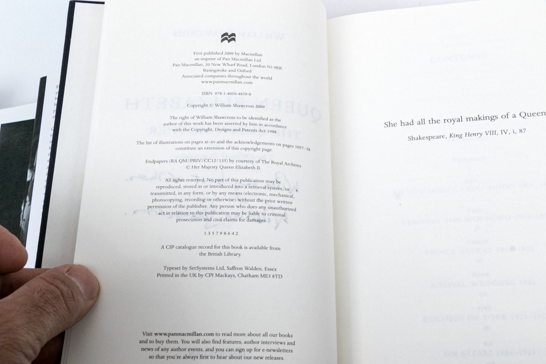 Signed copy, William Shawcross, "Queen Elizabeth, The Queen Mother, The Official Biography", Macmillan, 2009. The end papers with a copy of a letter to the Queen Mother from her daughter Elizabeth, September 13, 1940 during WWII.