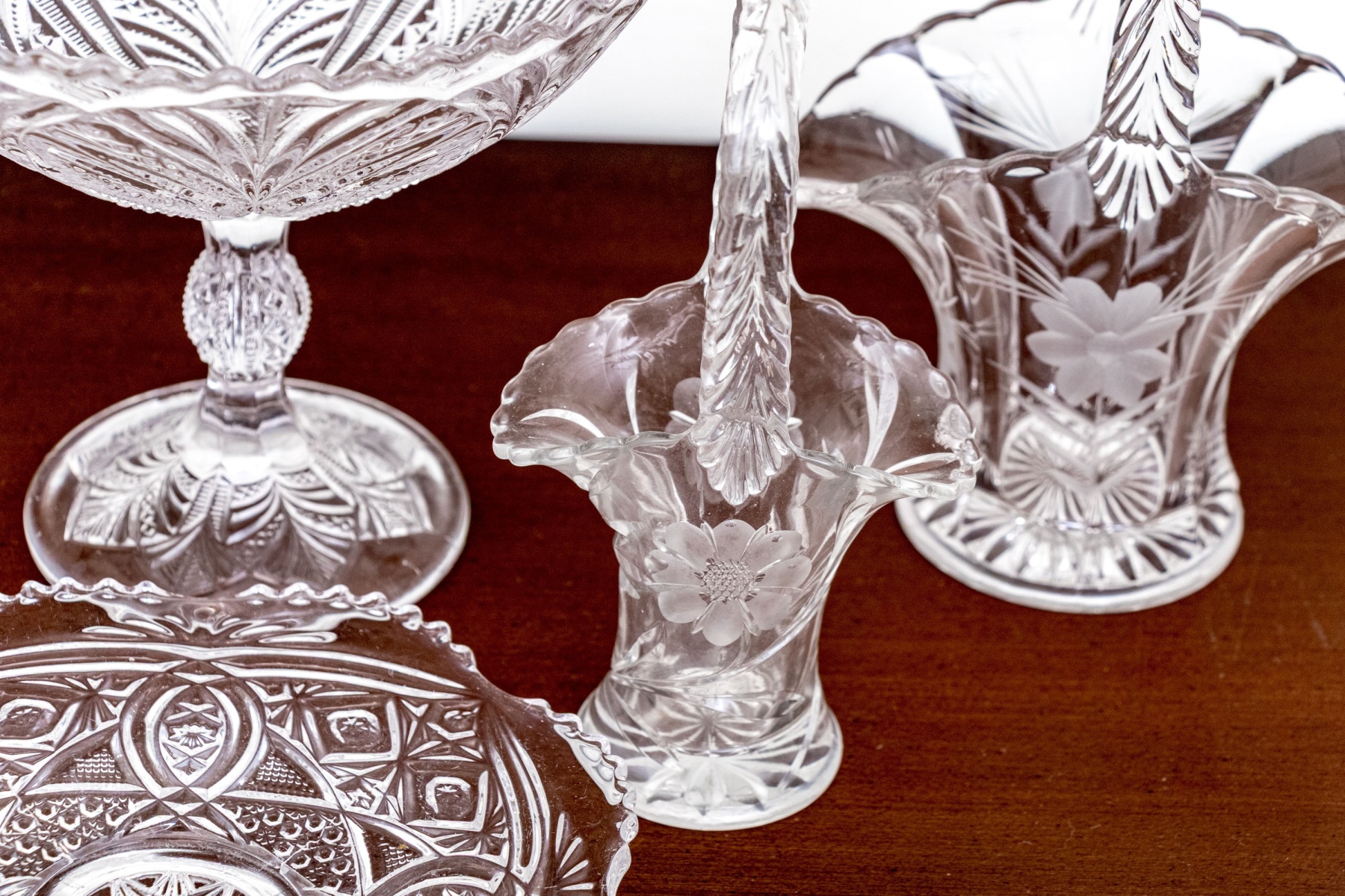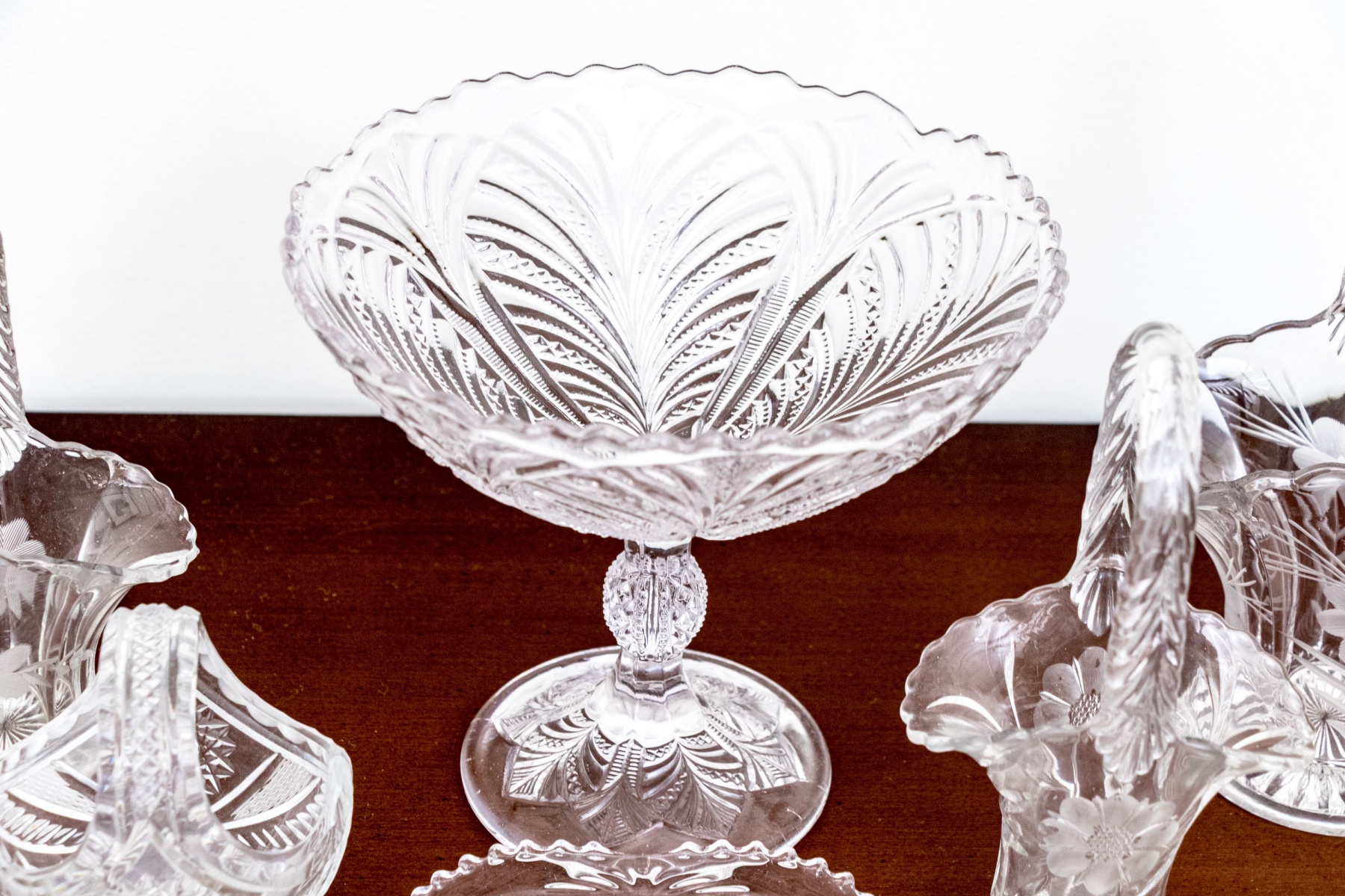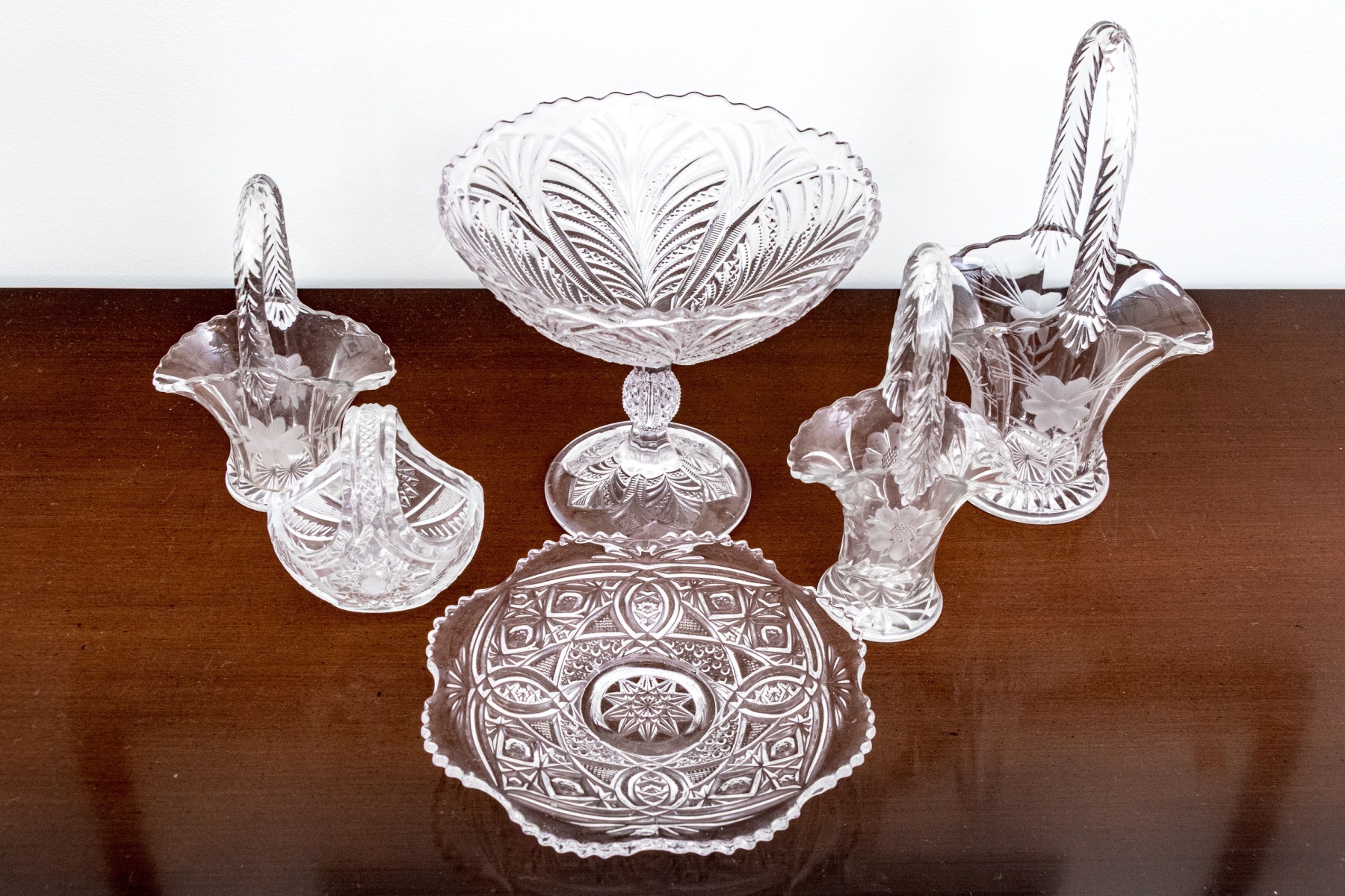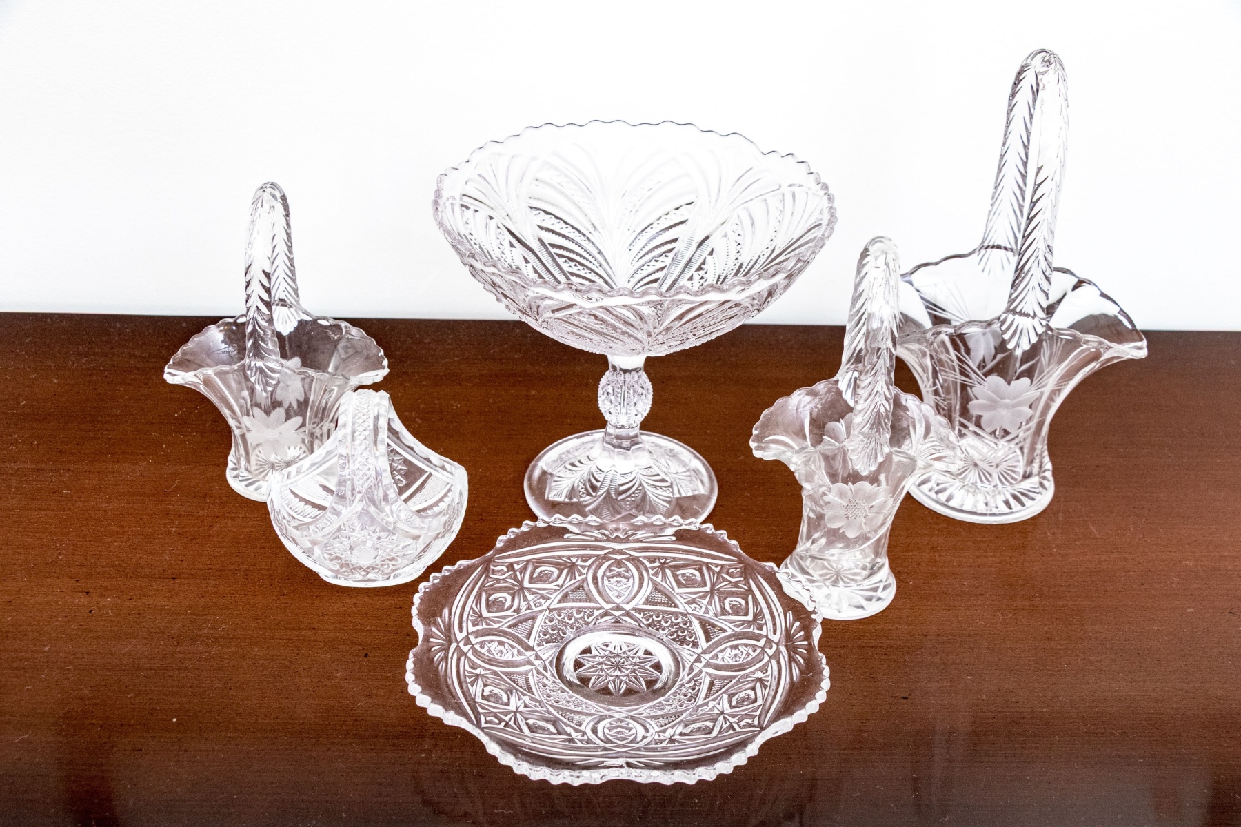 A wonderful variety of six pressed glass pieces including a compote bowl with a foliate form, four baskets, and a footed plate with a scalloped and saw tooth trim.