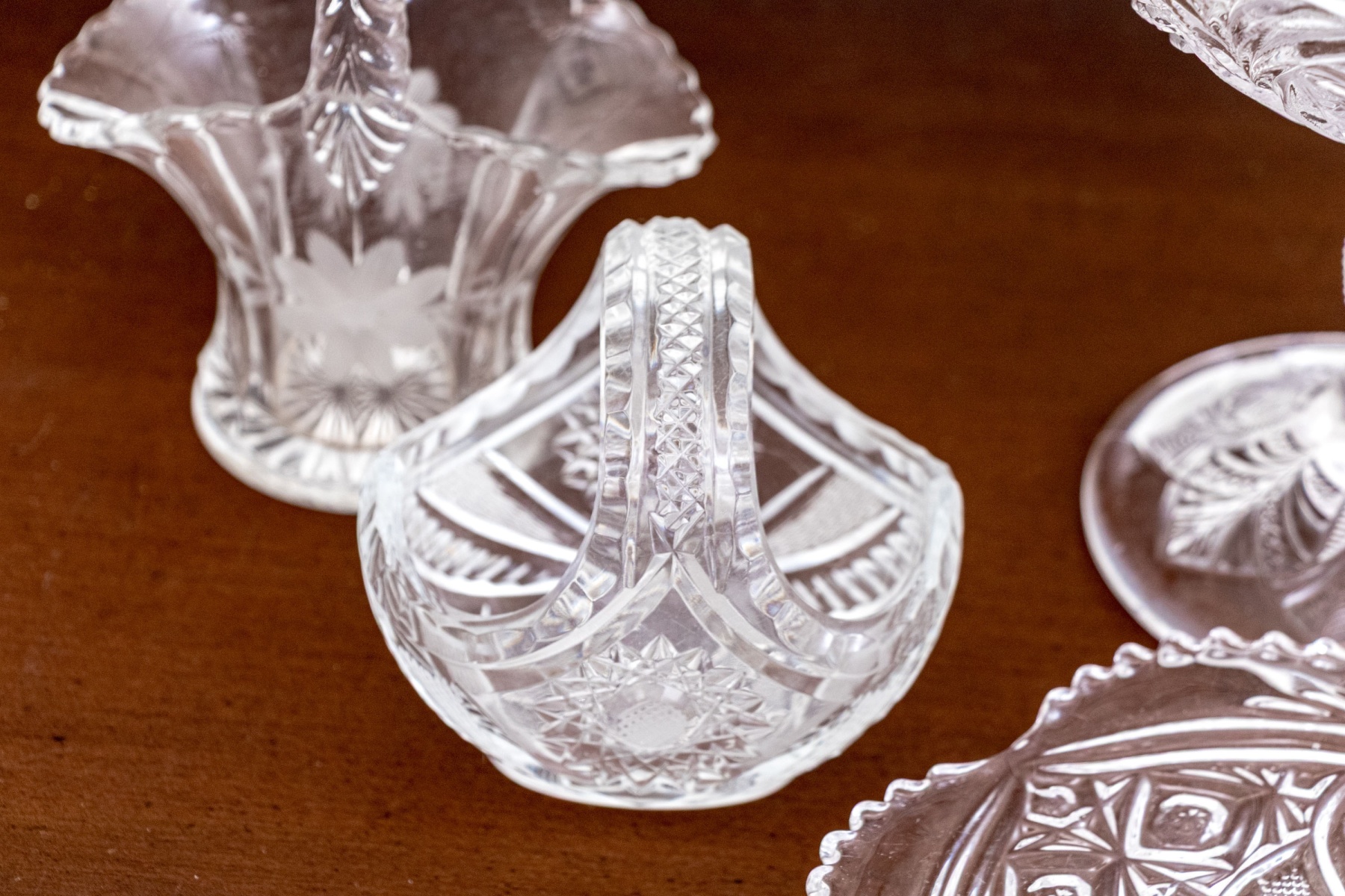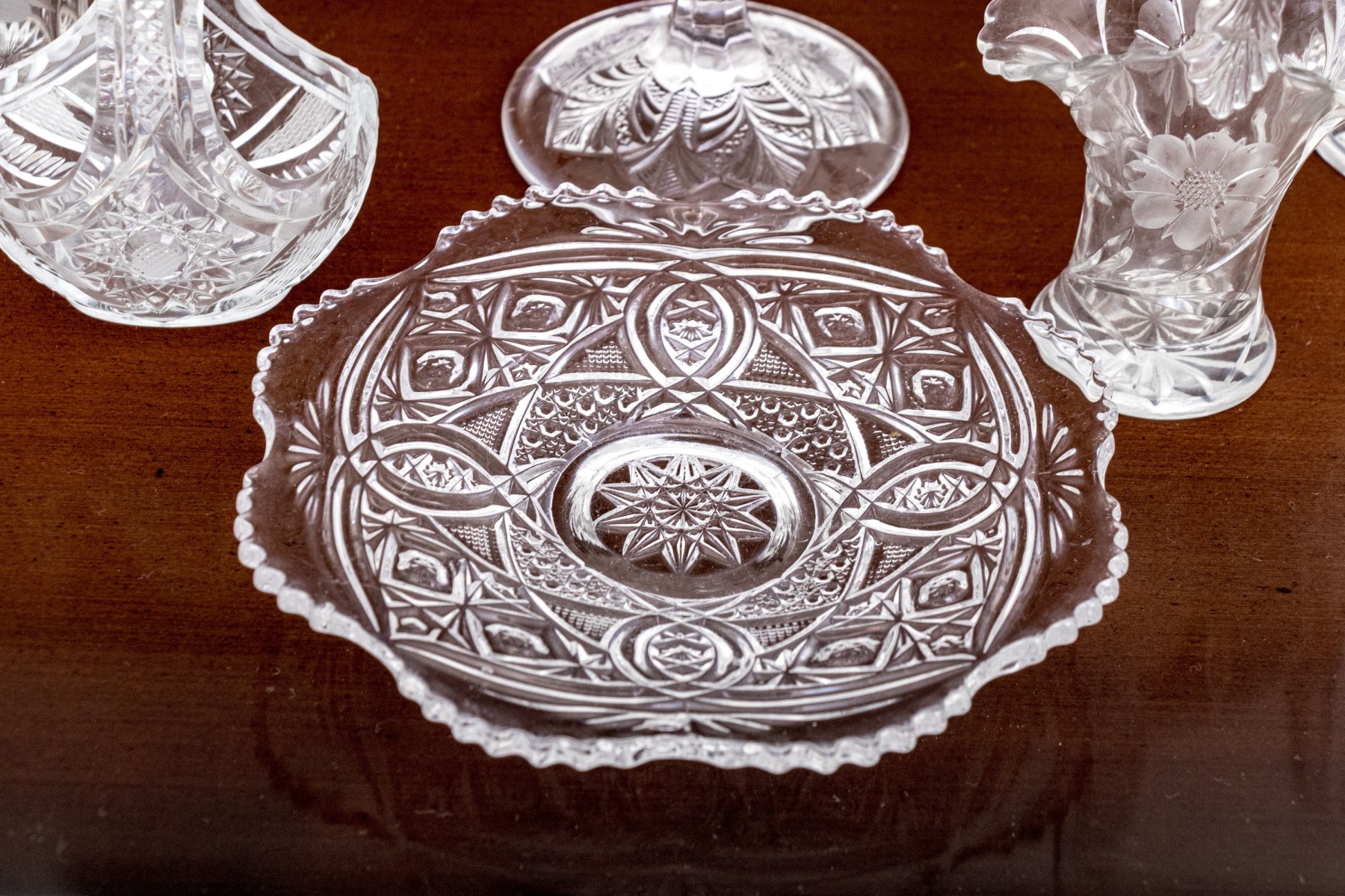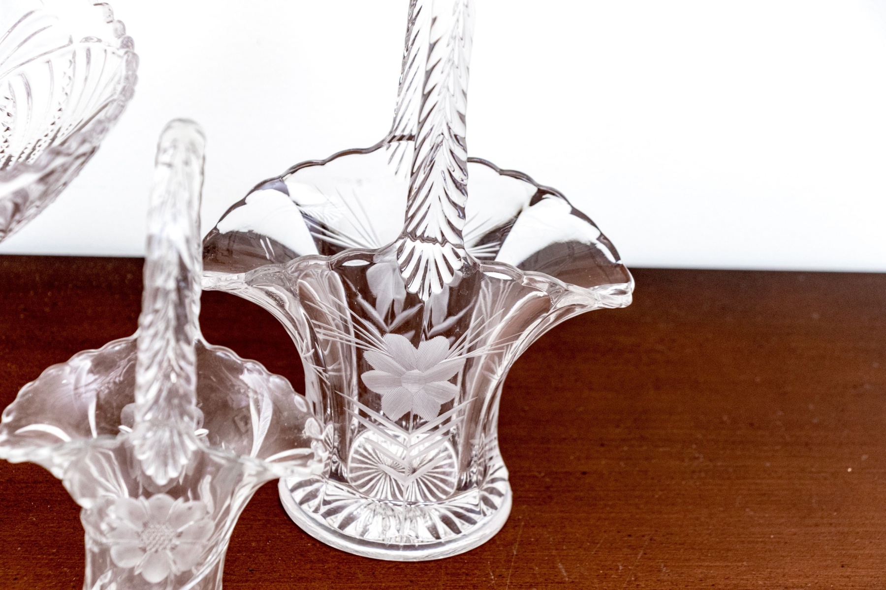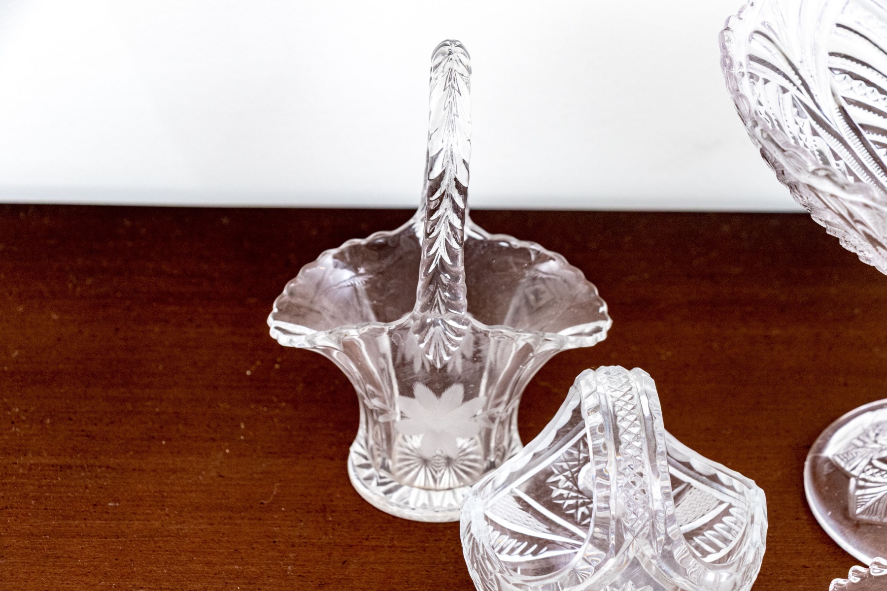 A wonderful variety of six pressed glass pieces including a compote bowl with a foliate form, four baskets, and a footed plate with a scalloped and saw tooth trim.