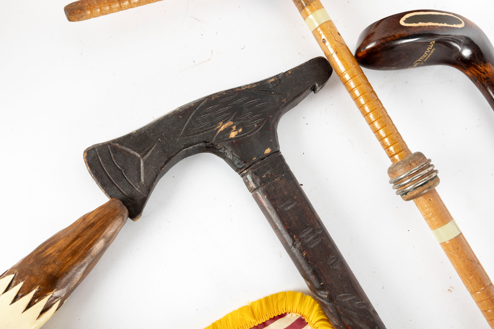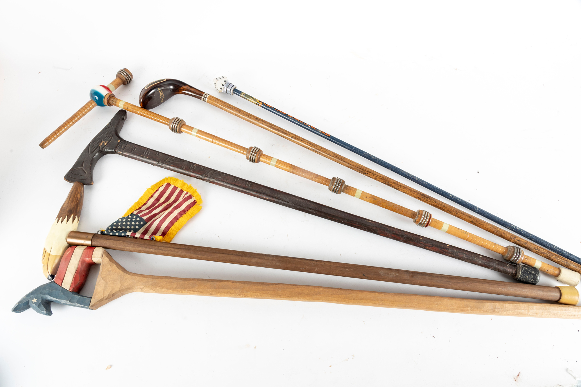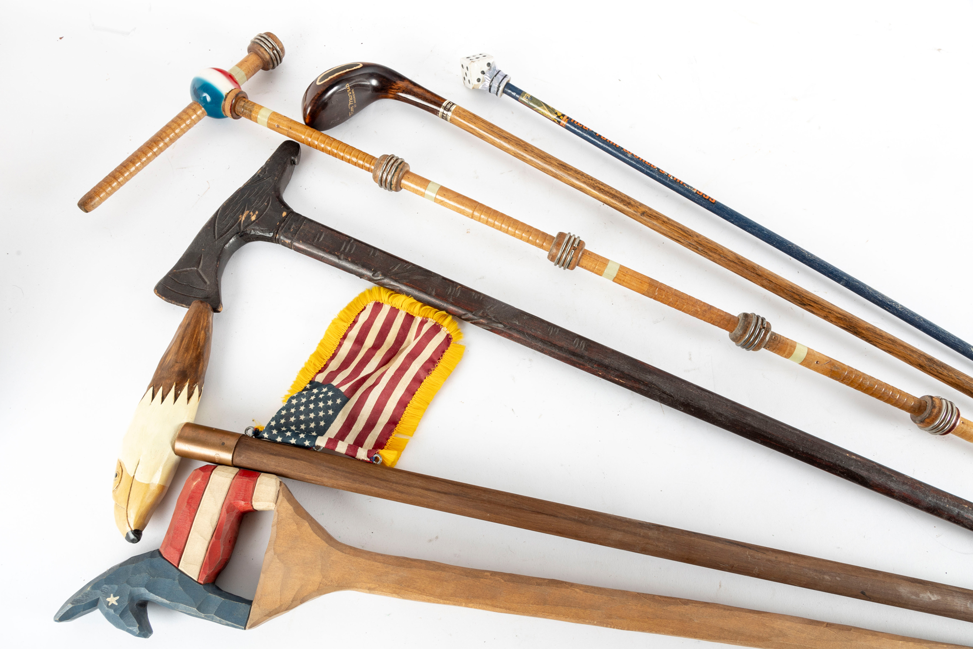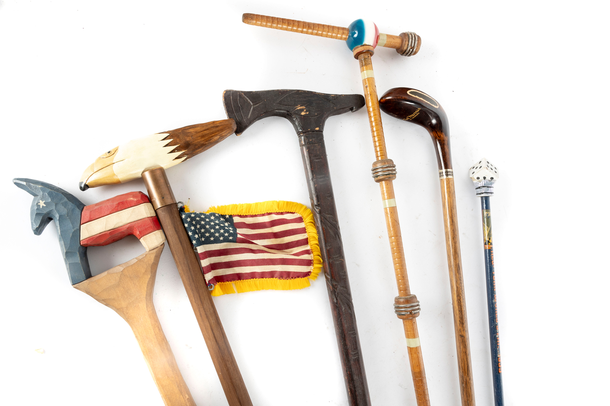 Six unique, vintage carved wood Americana-themed canes. Contents as shown and sold as is. See photos for details.