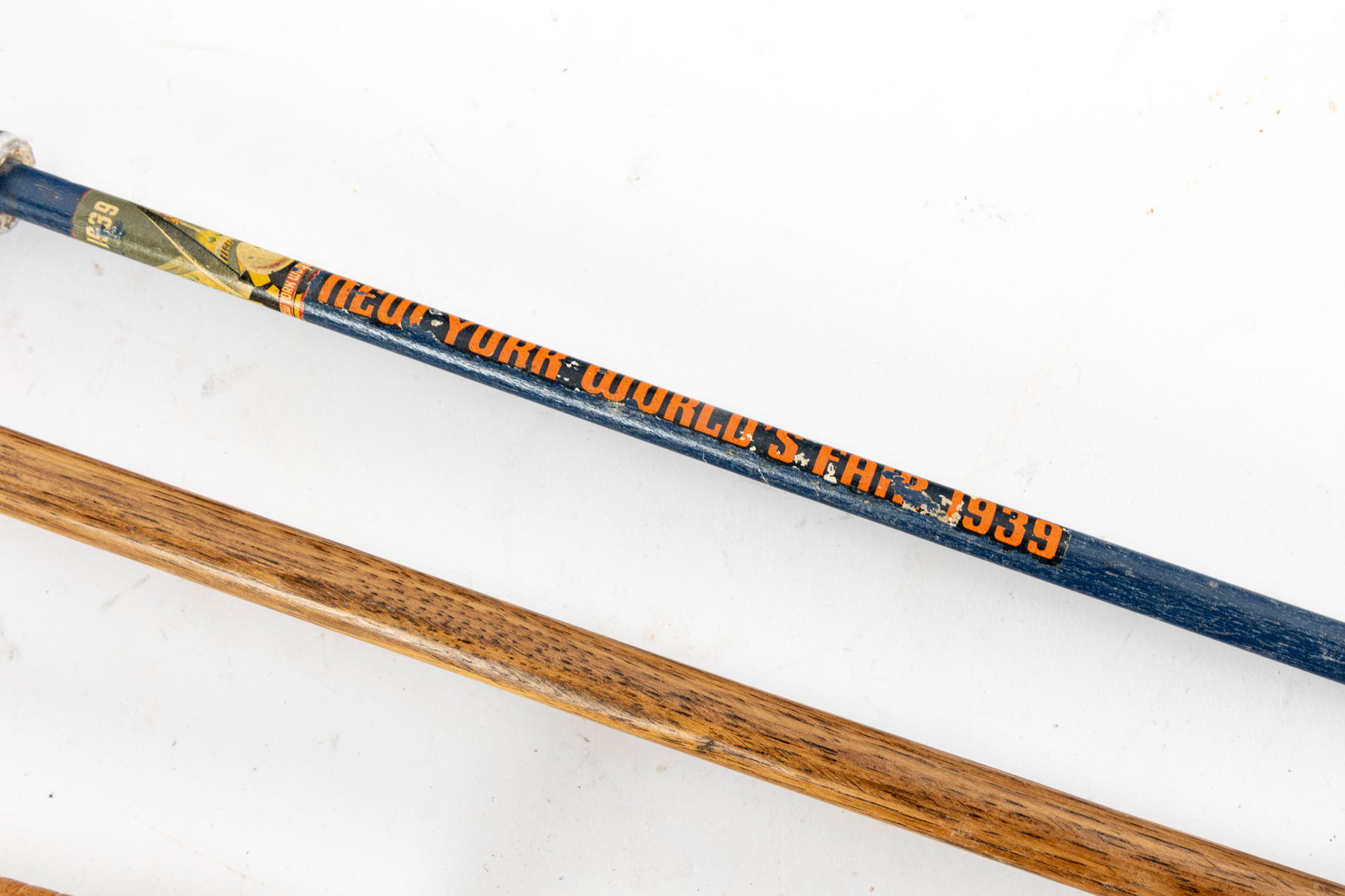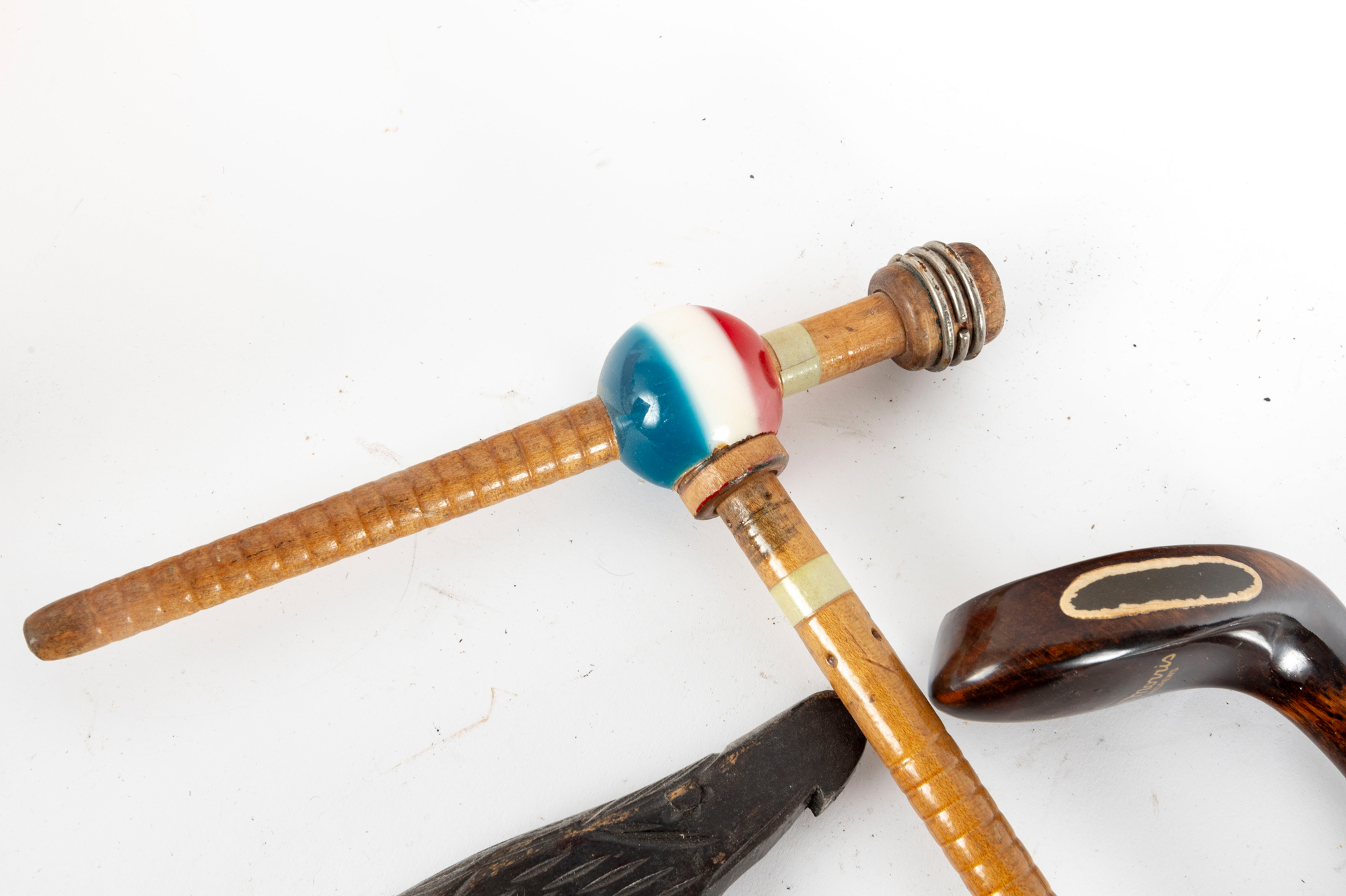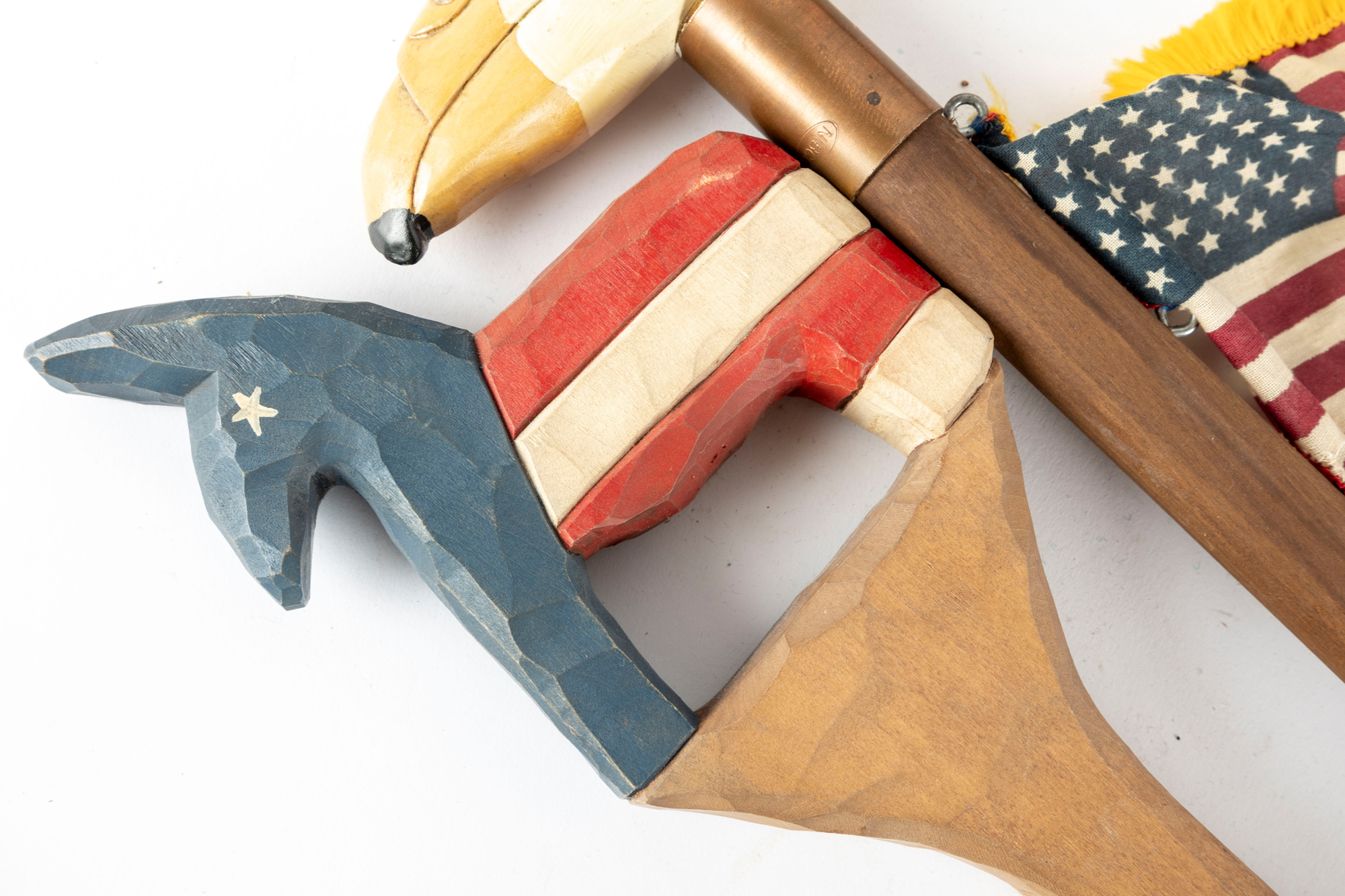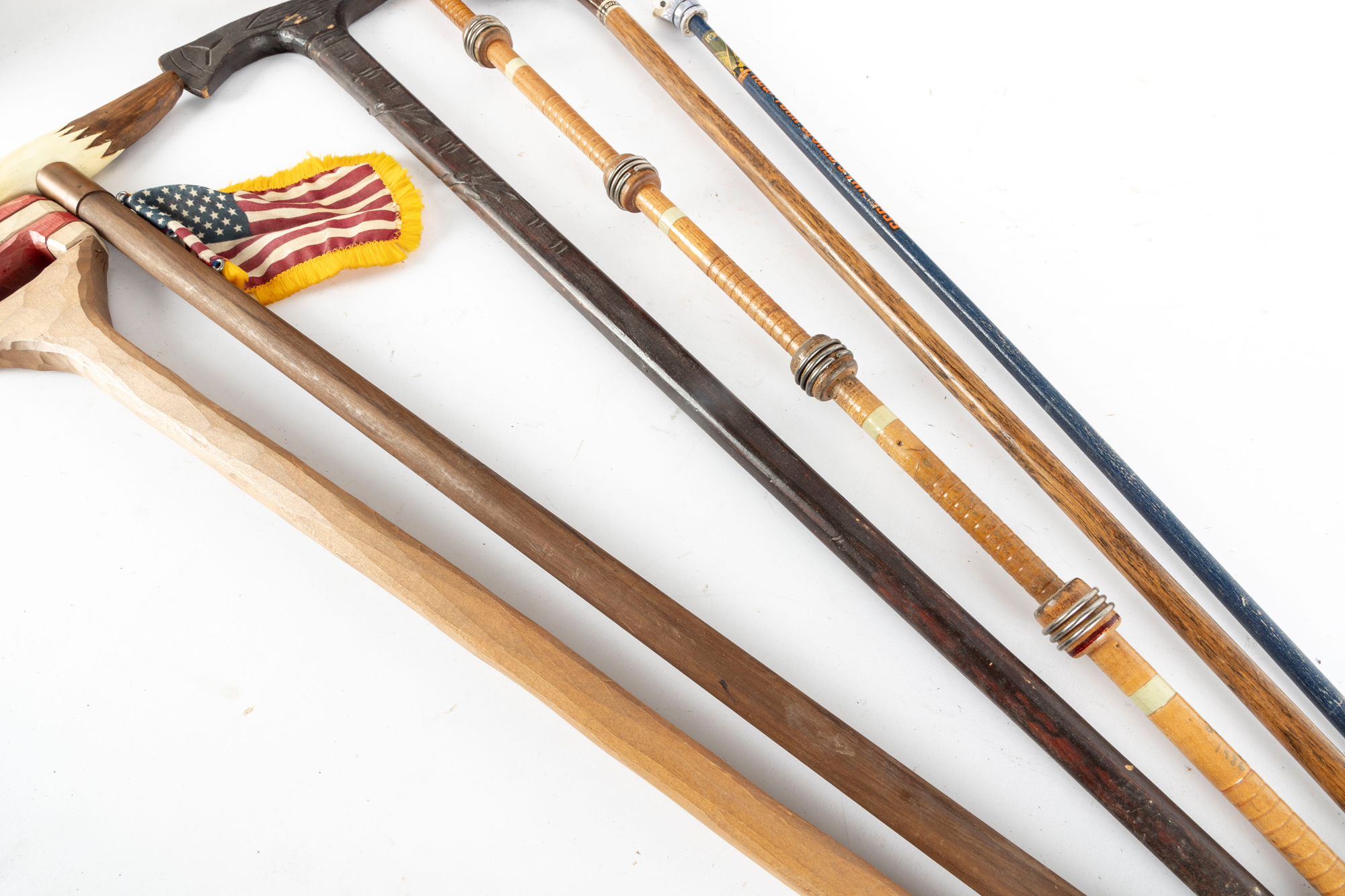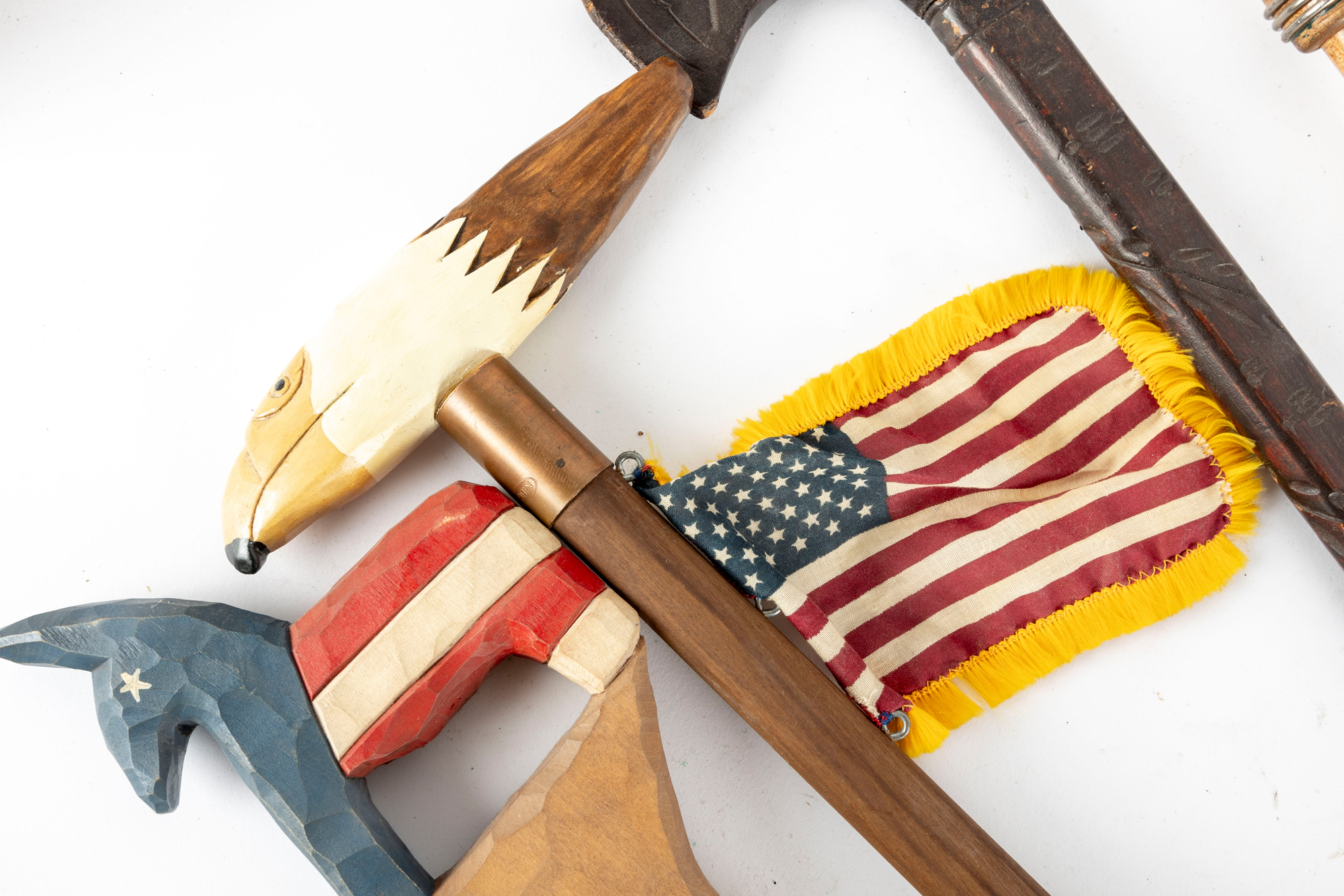 Six unique, vintage carved wood Americana-themed canes. Contents as shown and sold as is. See photos for details.