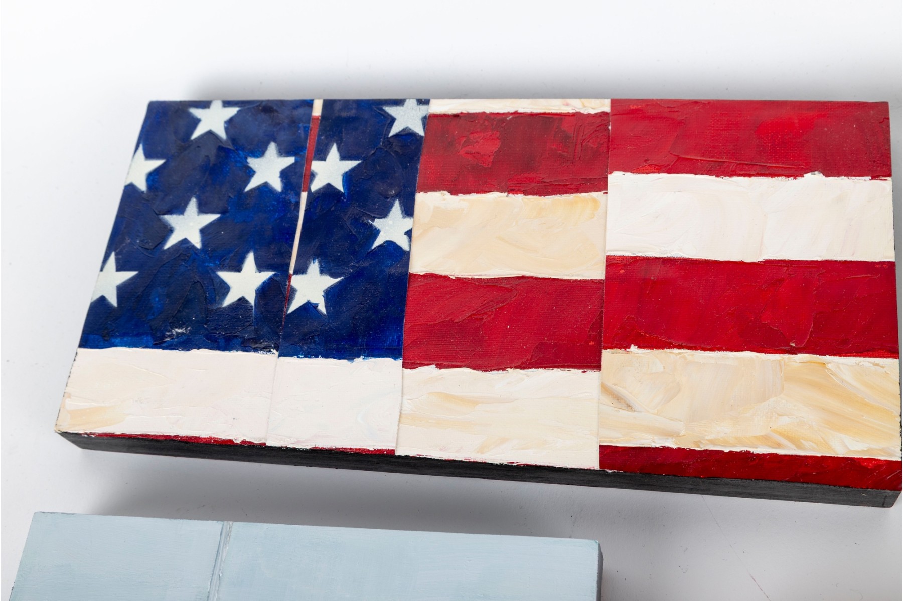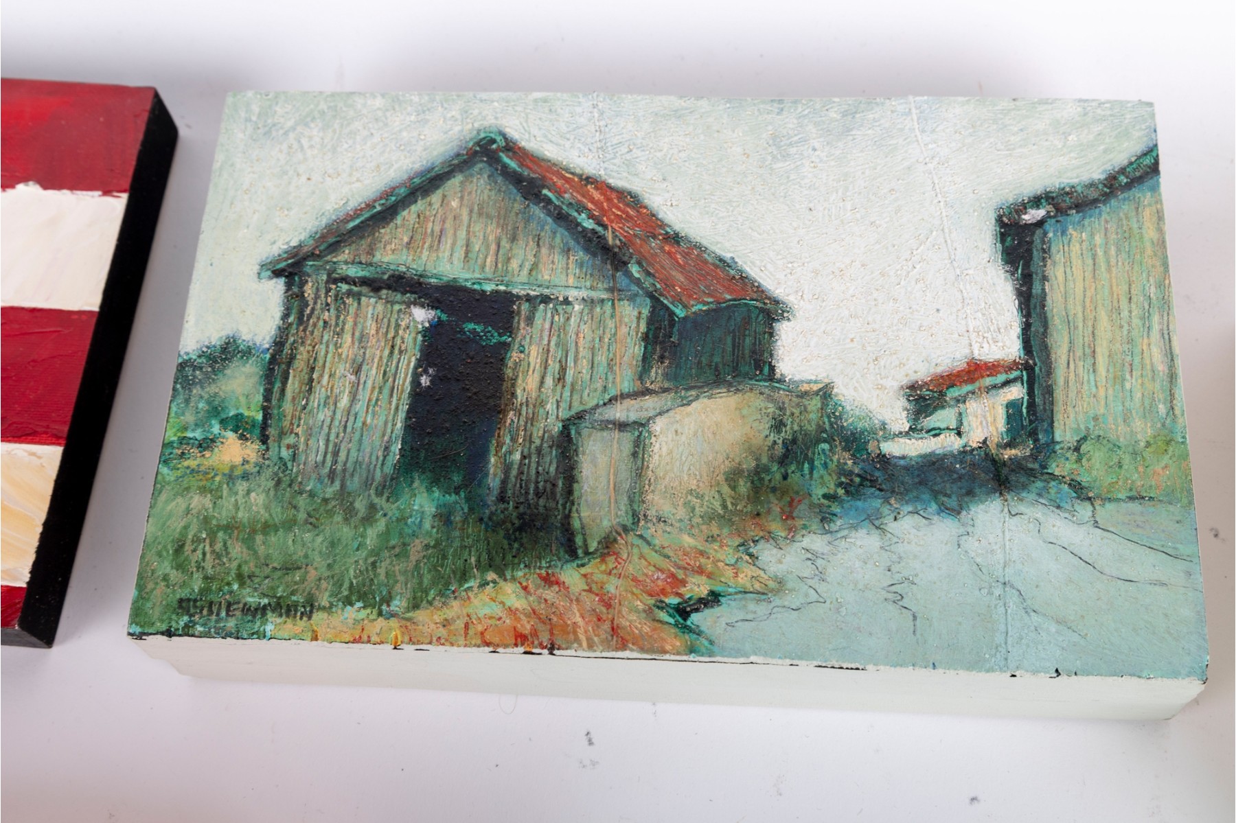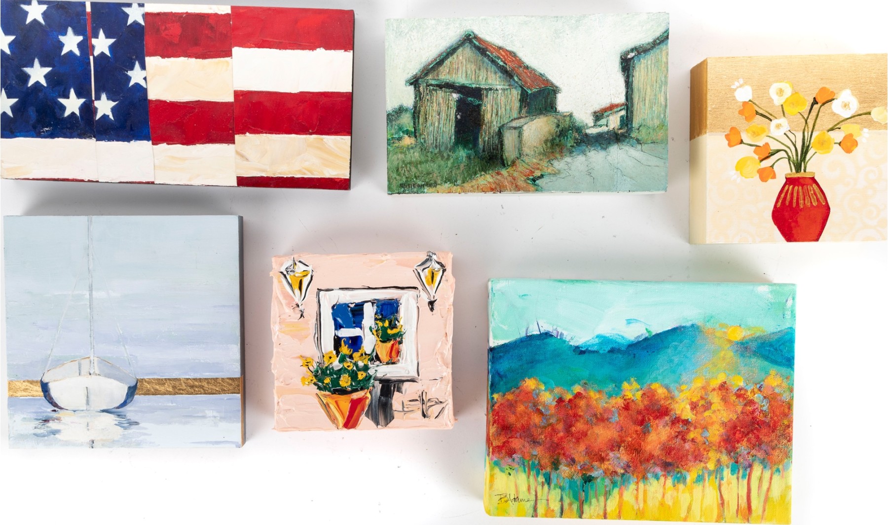 A wonderful collection of small paintings on board and canvas evoking a sense of rural Americana. Pieces include an abstracted American flag, a view of rustic buildings, a floral still life, a scene of a boat on calm water, and an autumnal mountain landscape. Artists include Connelly, A.S. Newman, Bee Adams, and Ellen Welch Granter, among others.
