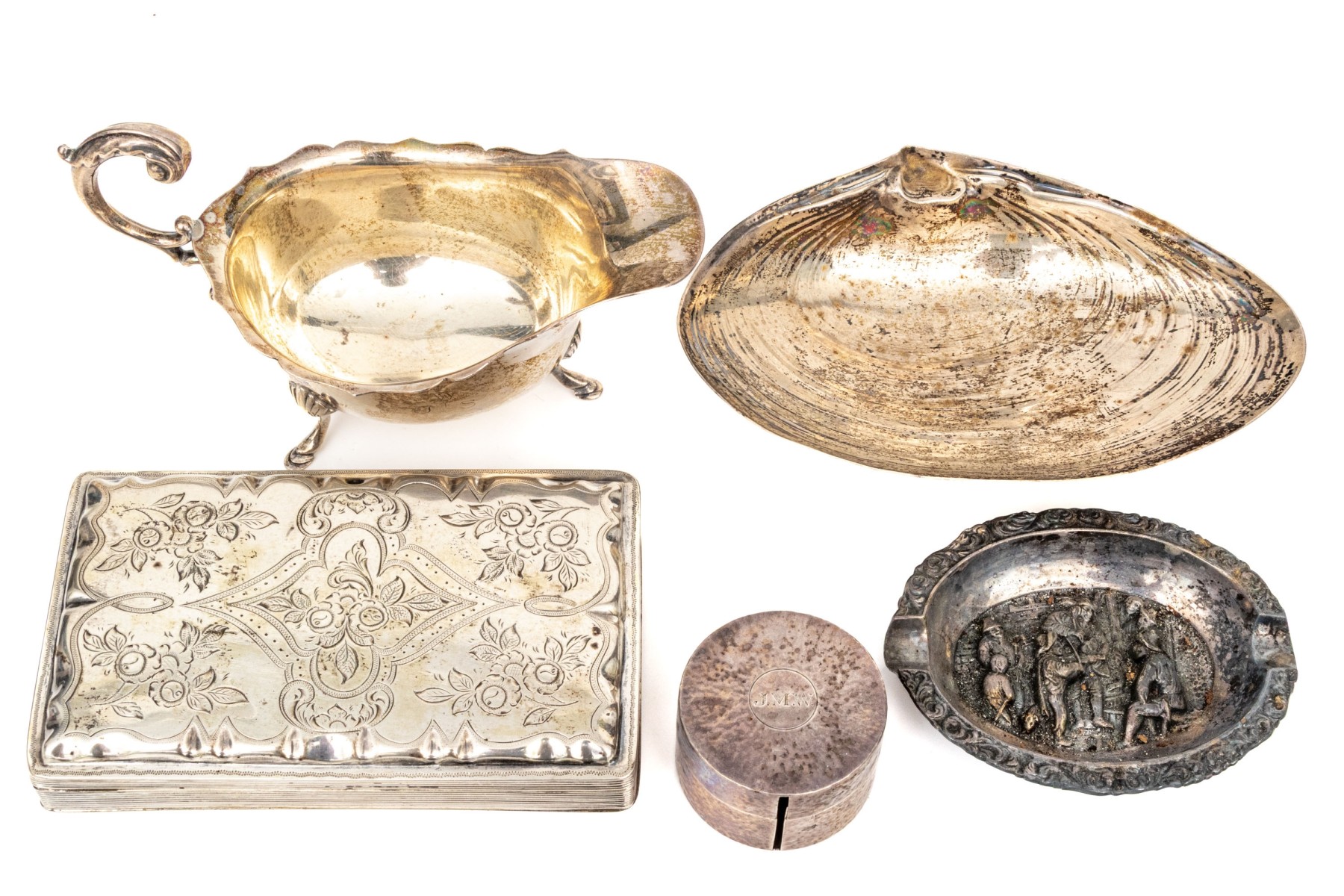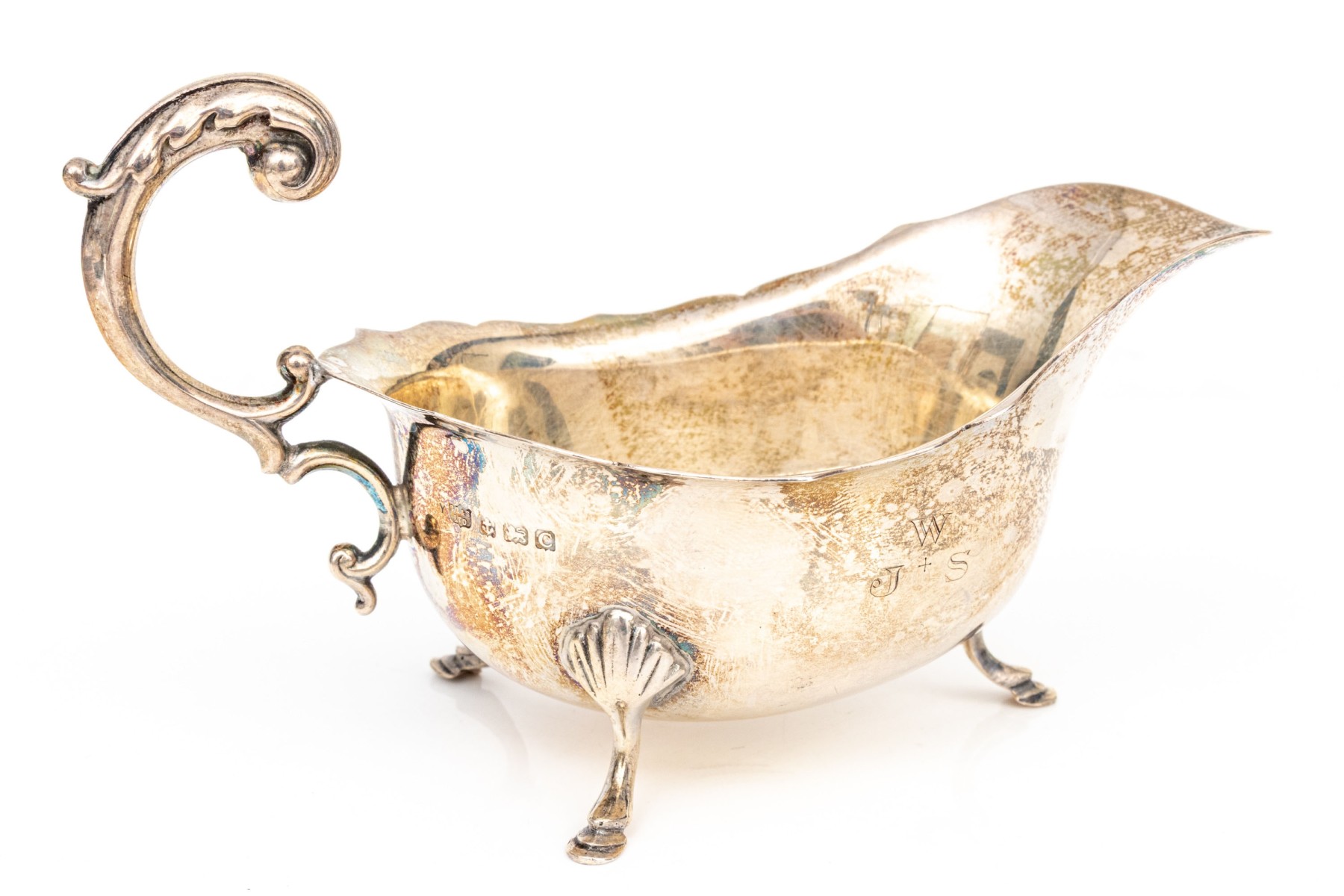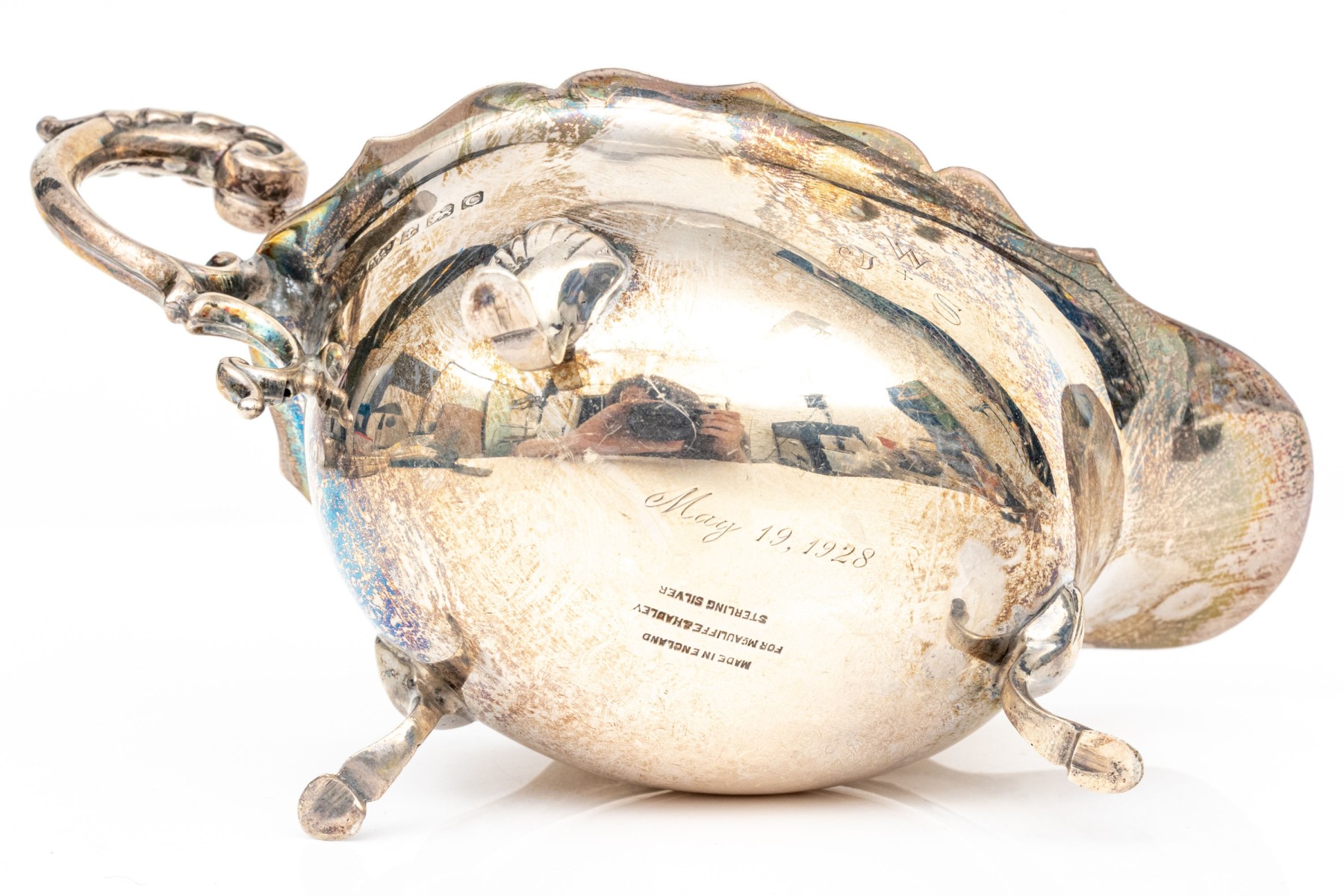 an English sterling silver footed sauce boat, 6" long, scratches inside