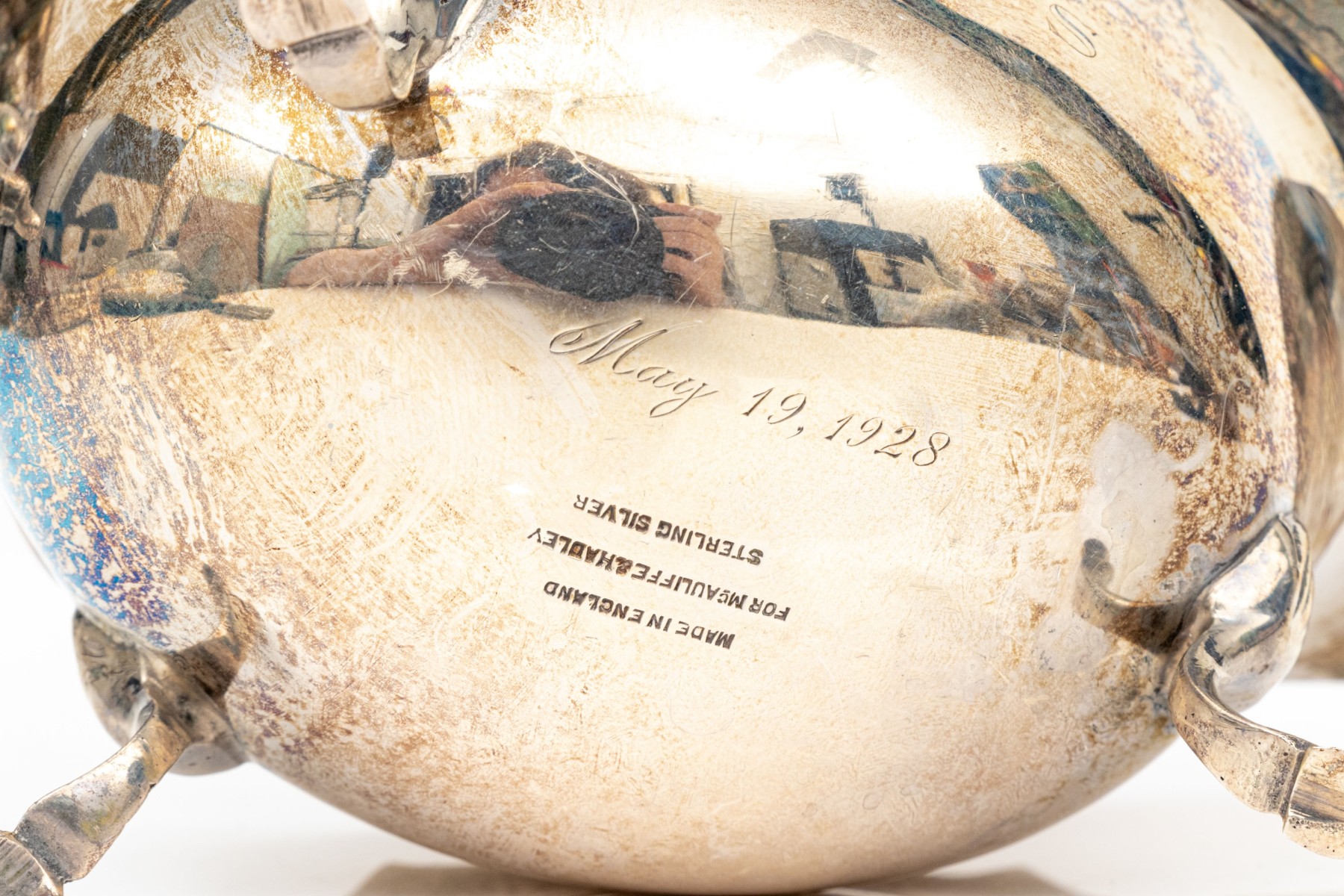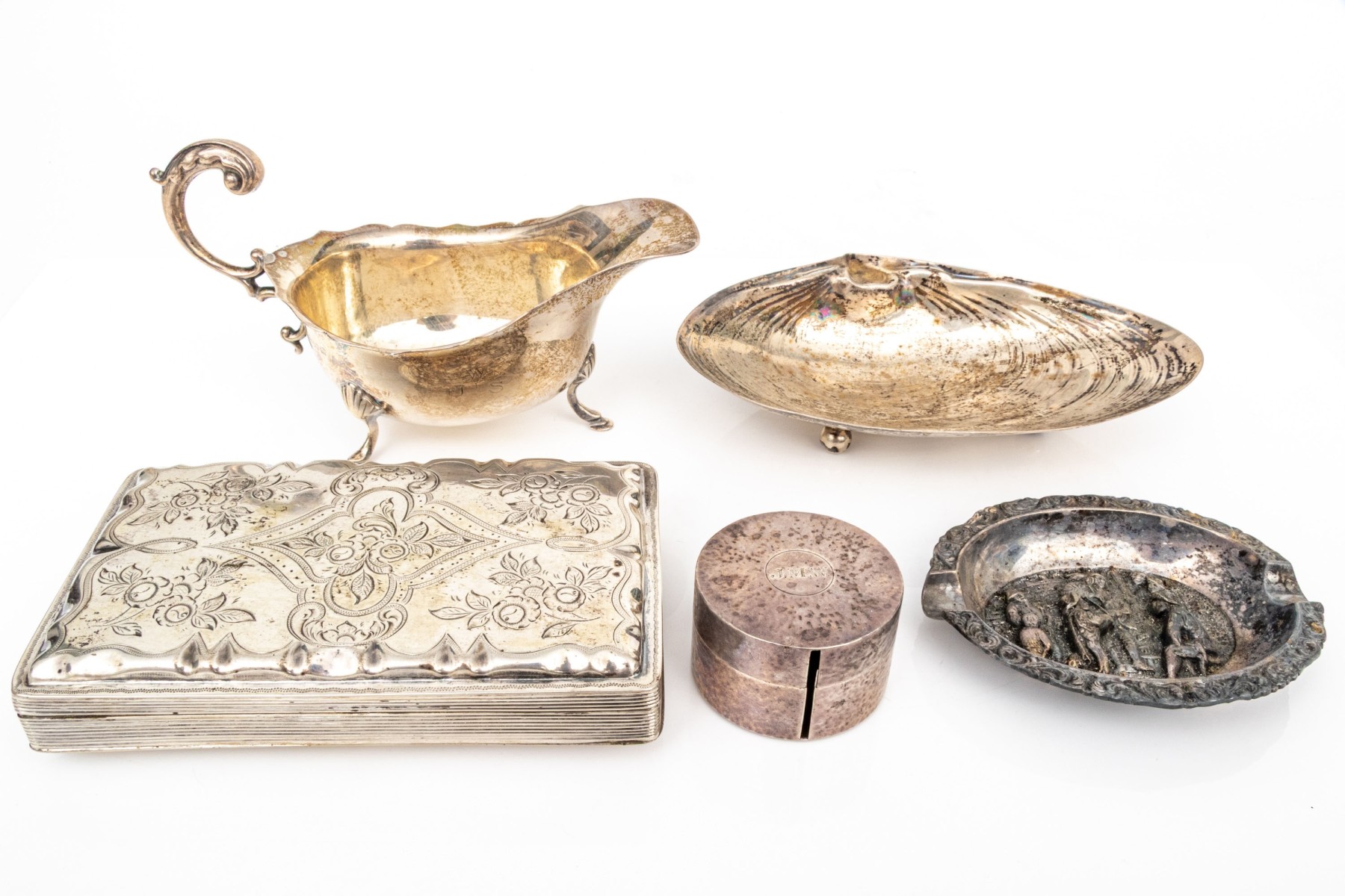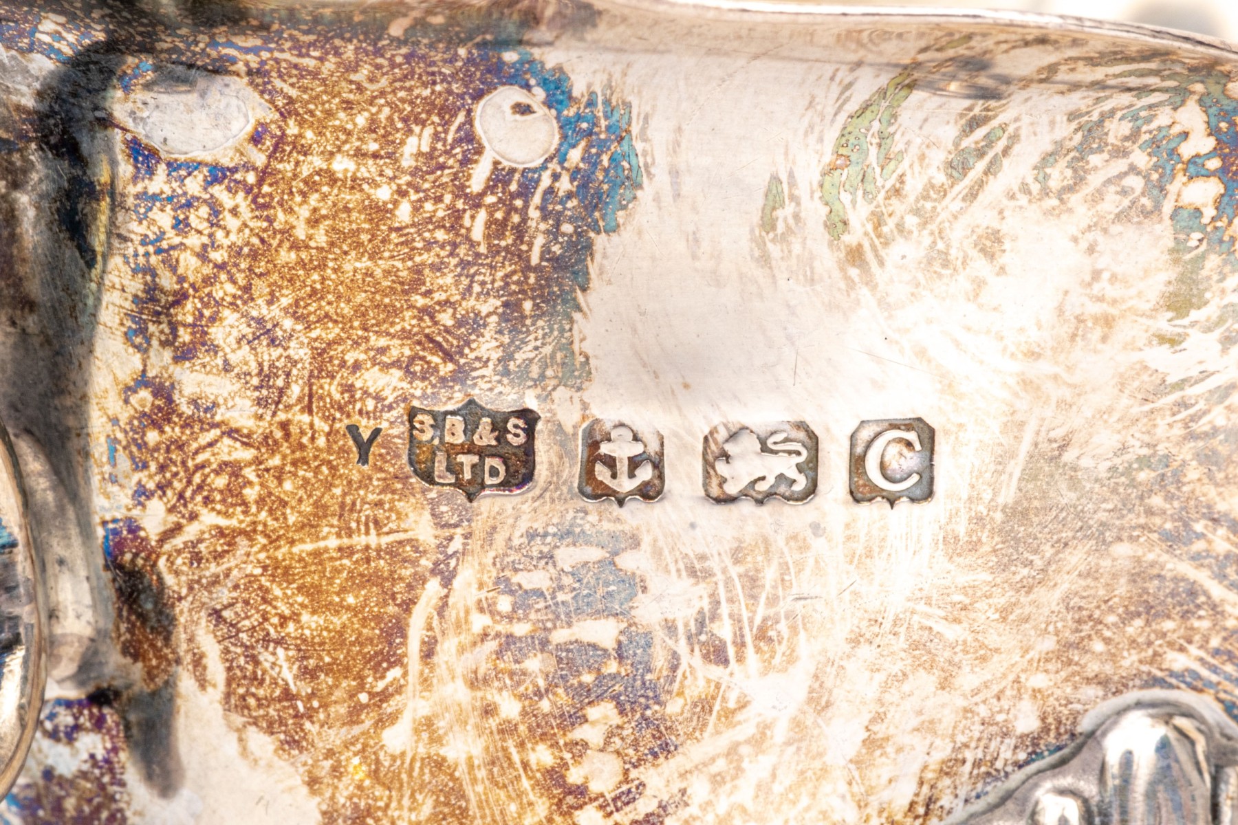 an English sterling silver footed sauce boat, 6" long, scratches inside