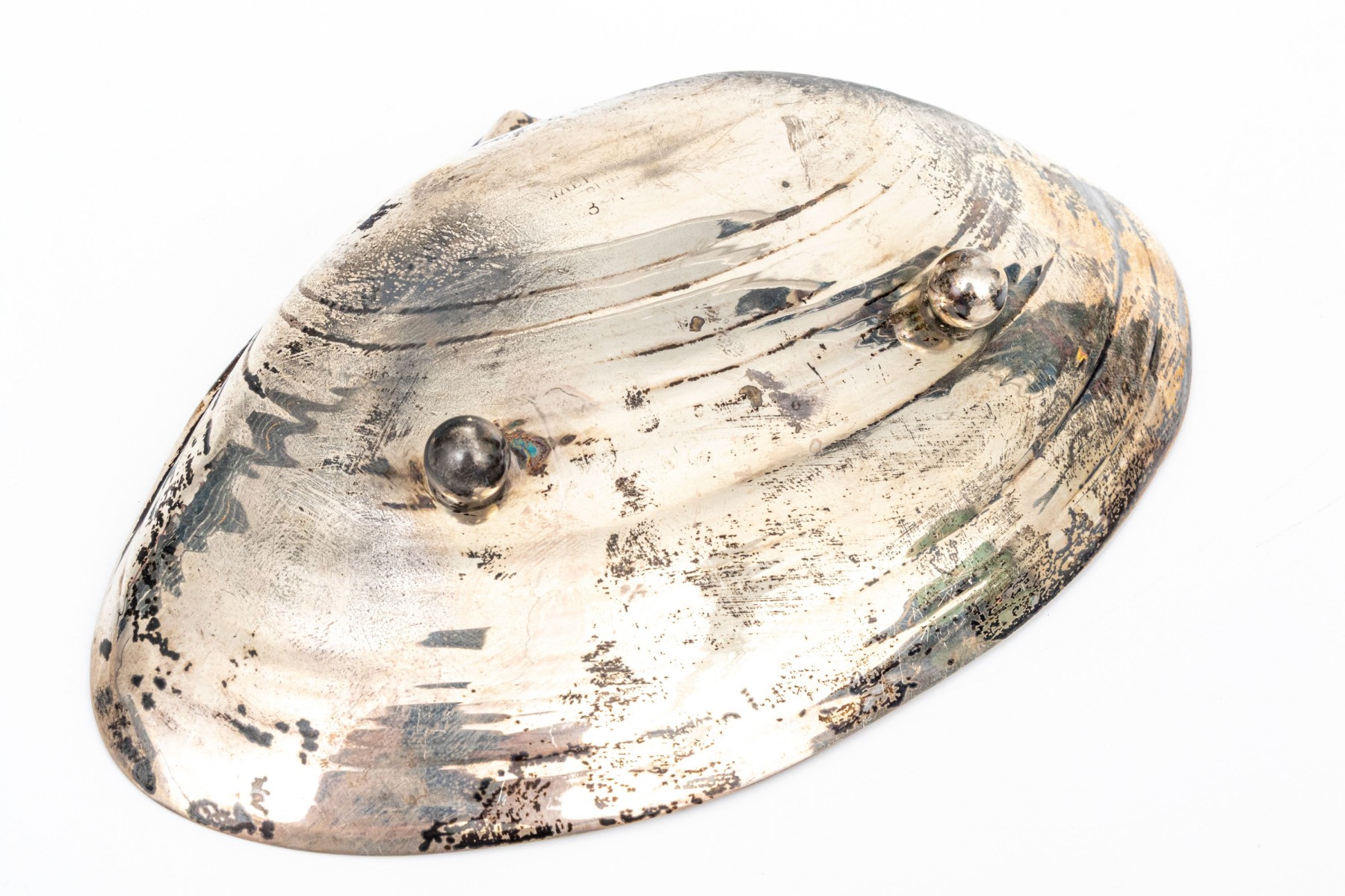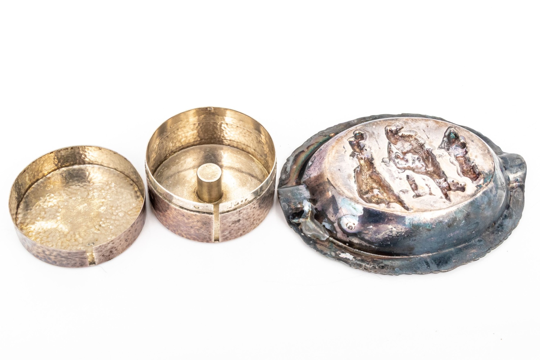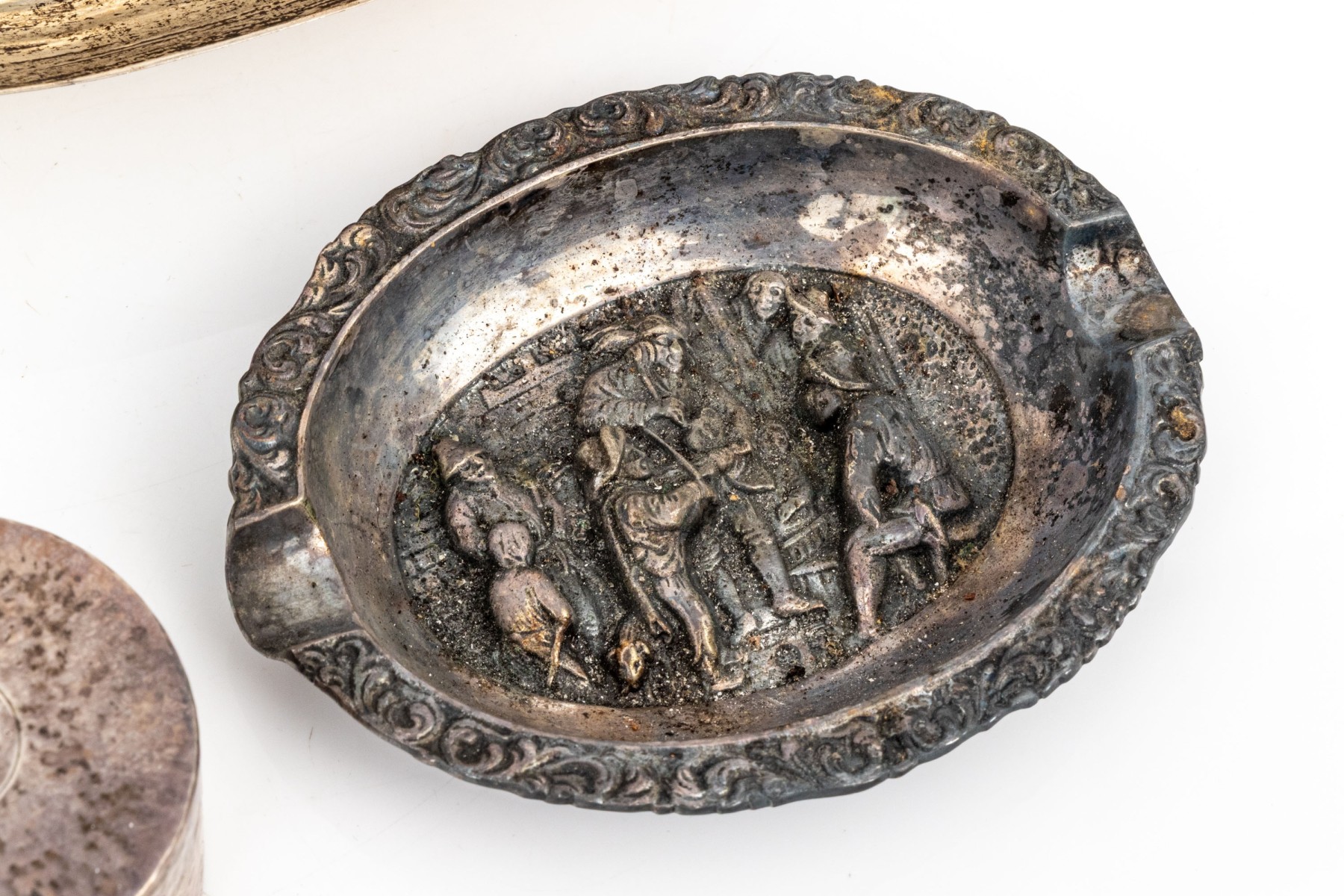Along with an oval silverplate ashtray with repousse figures, tarnished