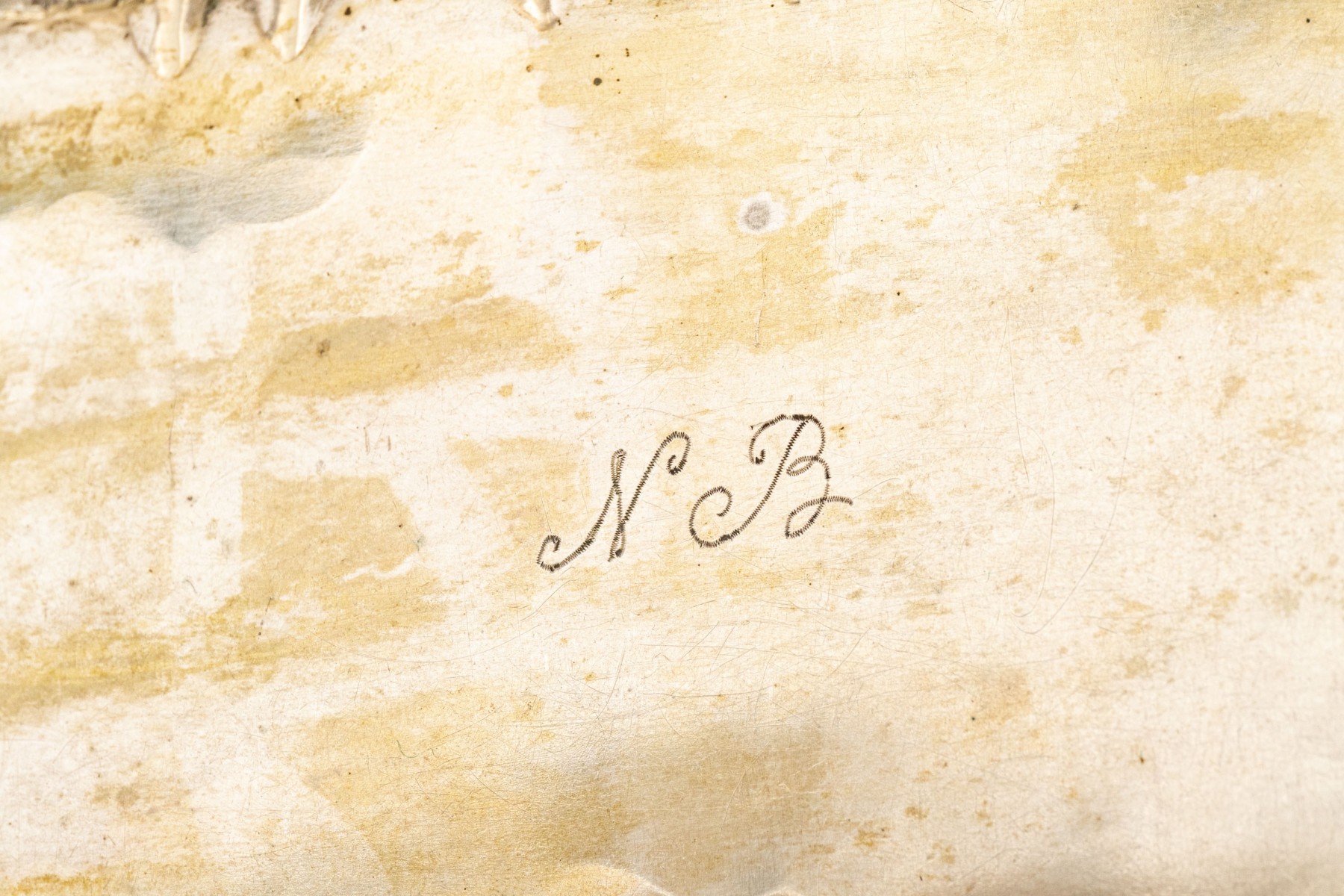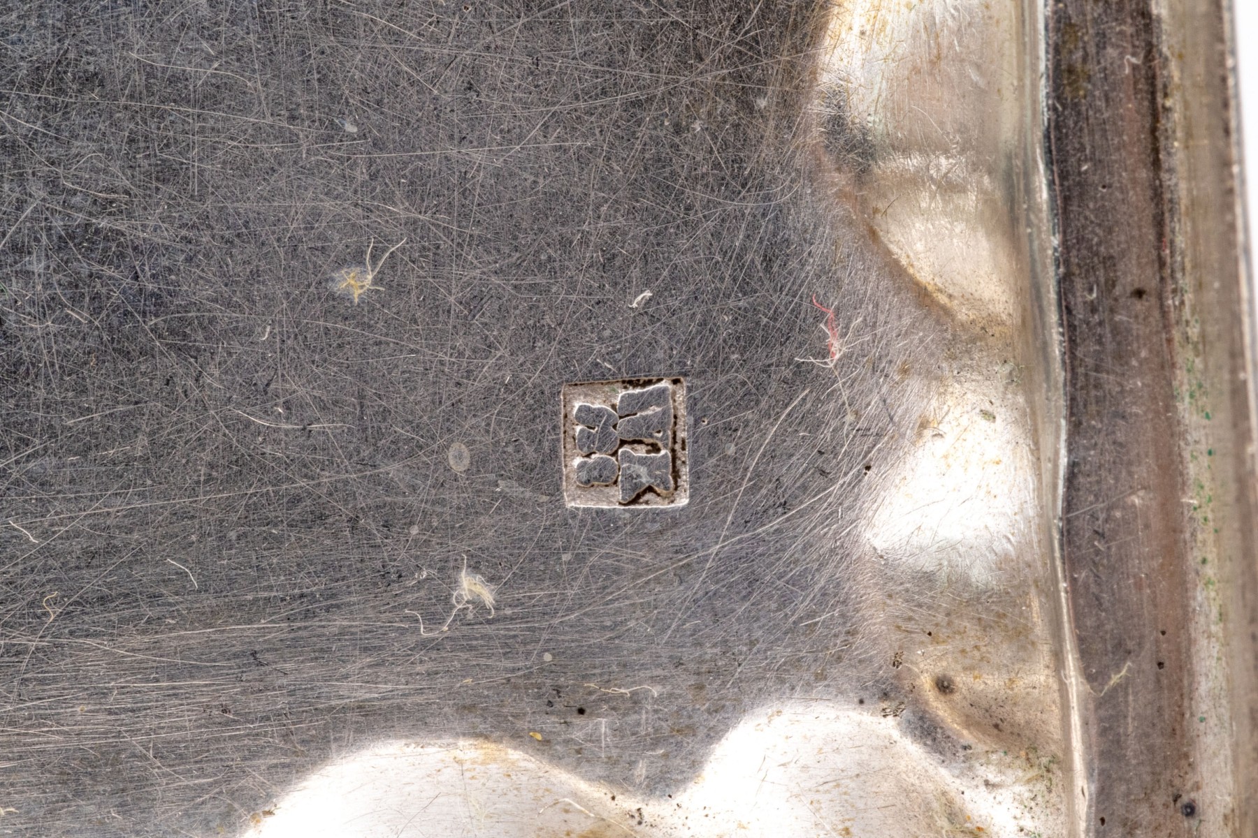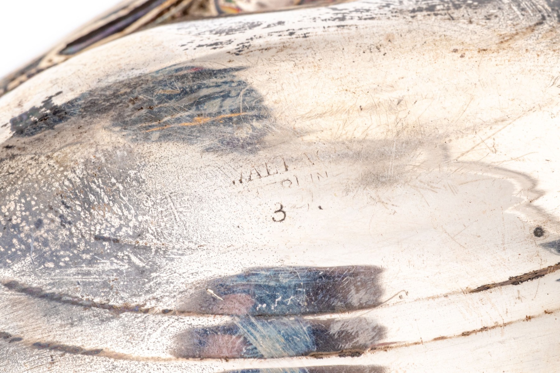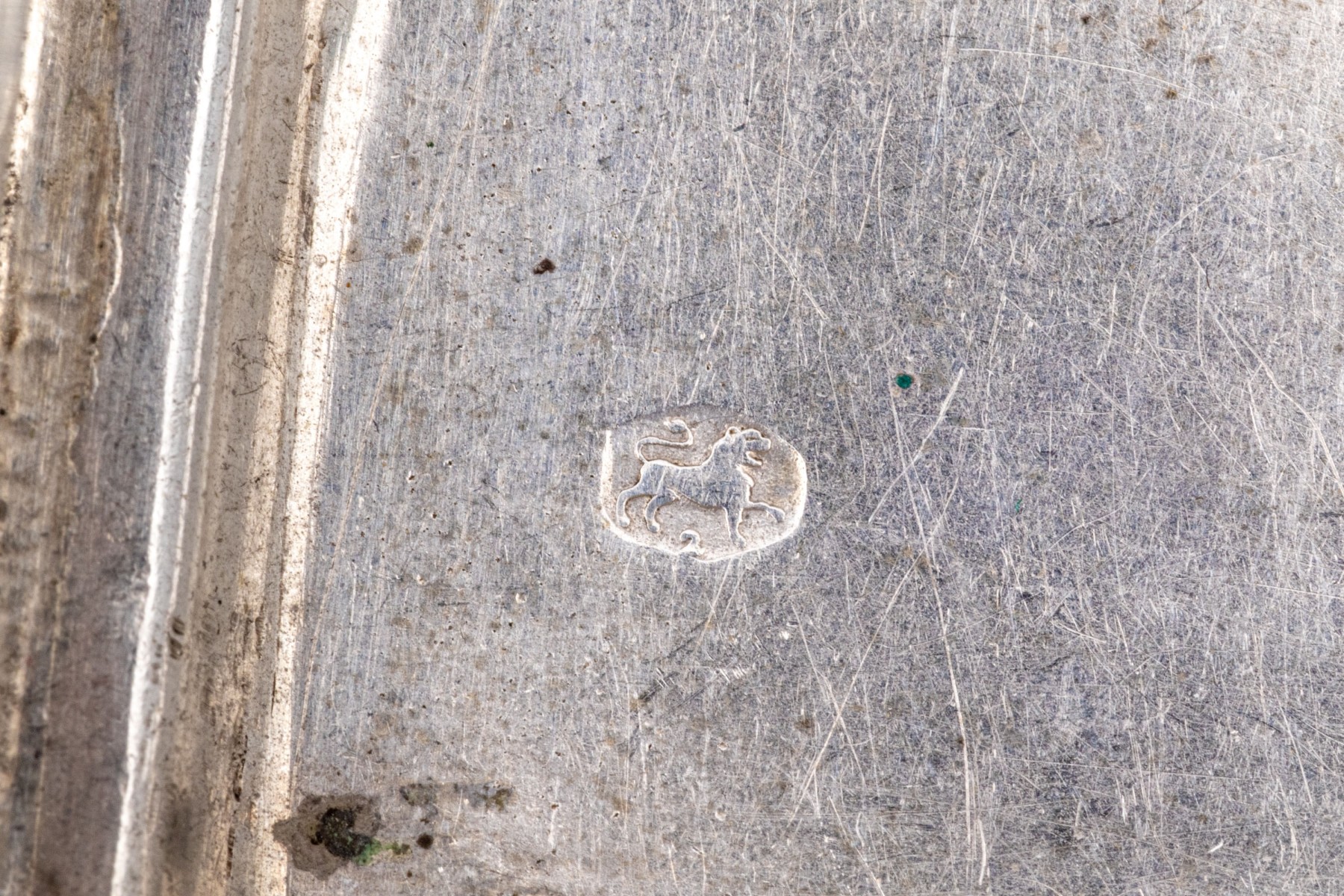 Along with an oval silverplate ashtray with repousse figures, tarnished