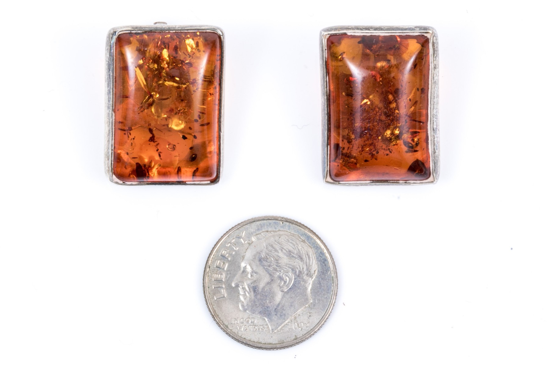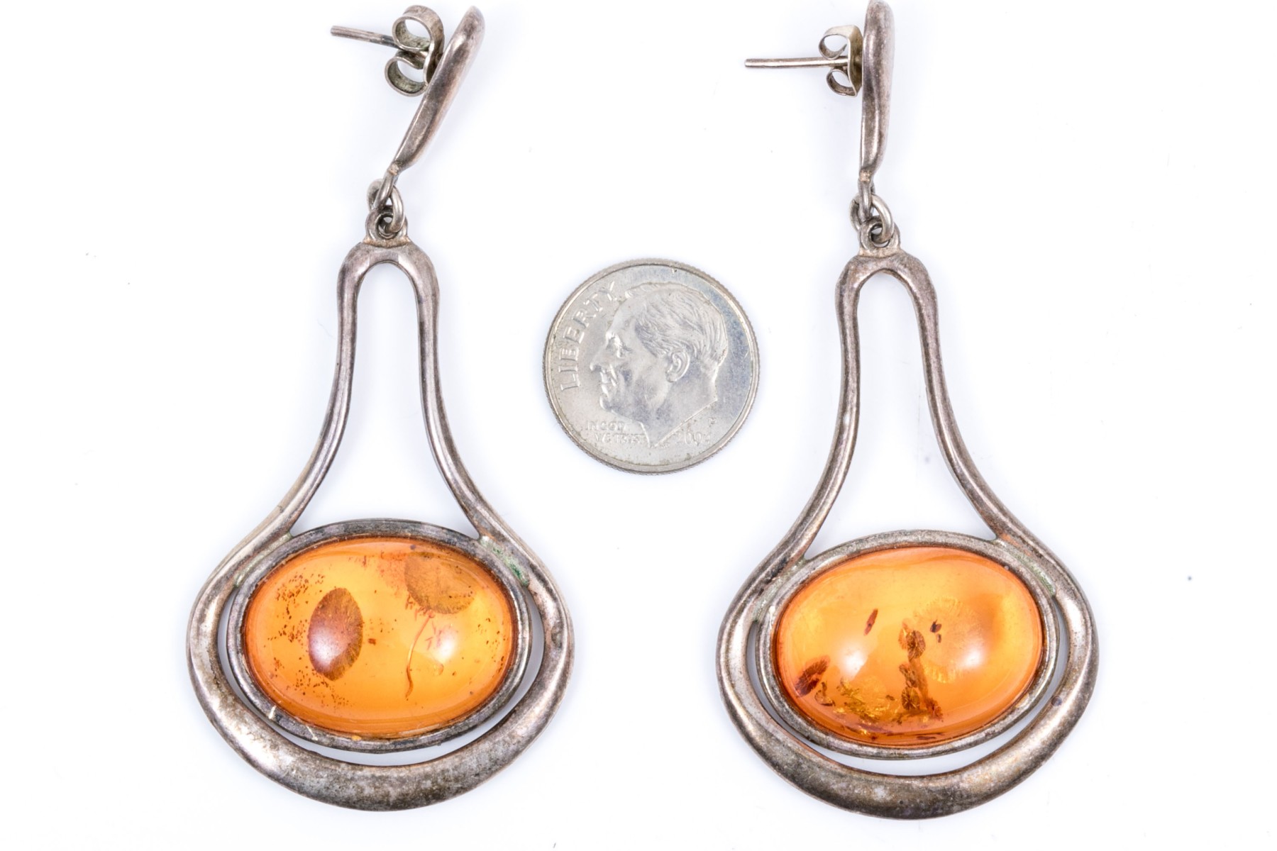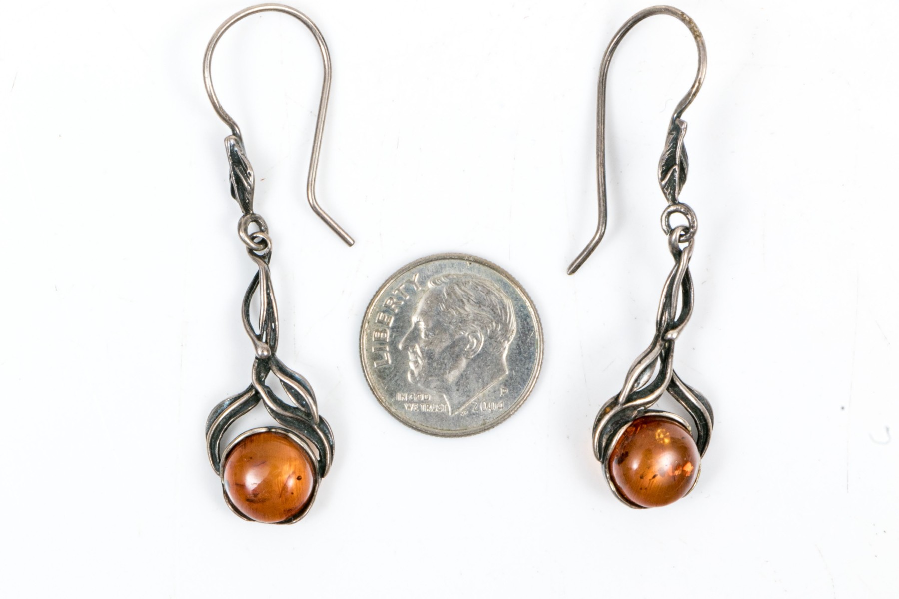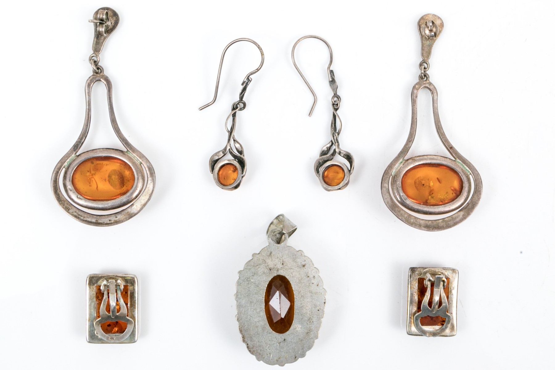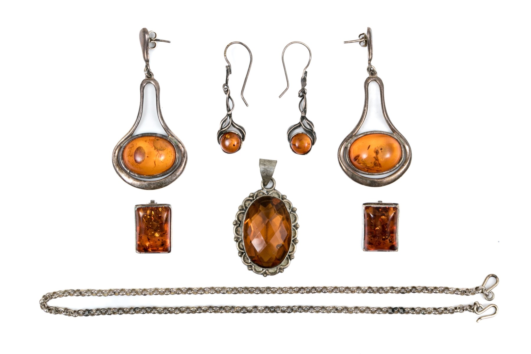 Collection of sterling and faux amber jewelry. Pendant necklace with hook clasps. Two pairs of pendant earrings with hook clasps. Pair of rectangular clip back earrings.